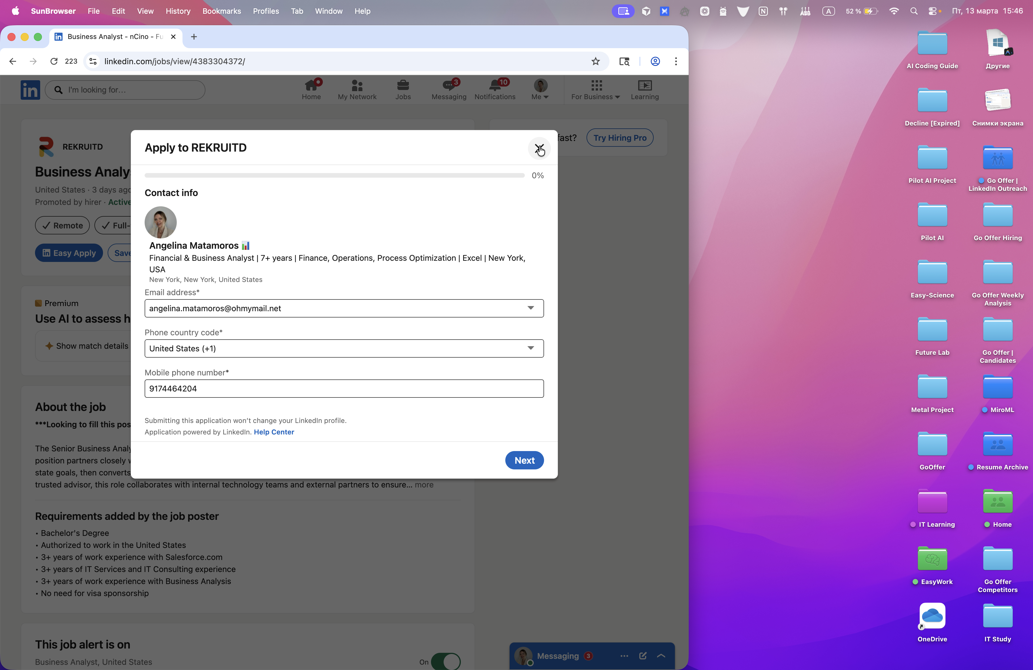 Вот супер! Вот открытая форма Easy Apply. Вот сейчас он должен пойти.