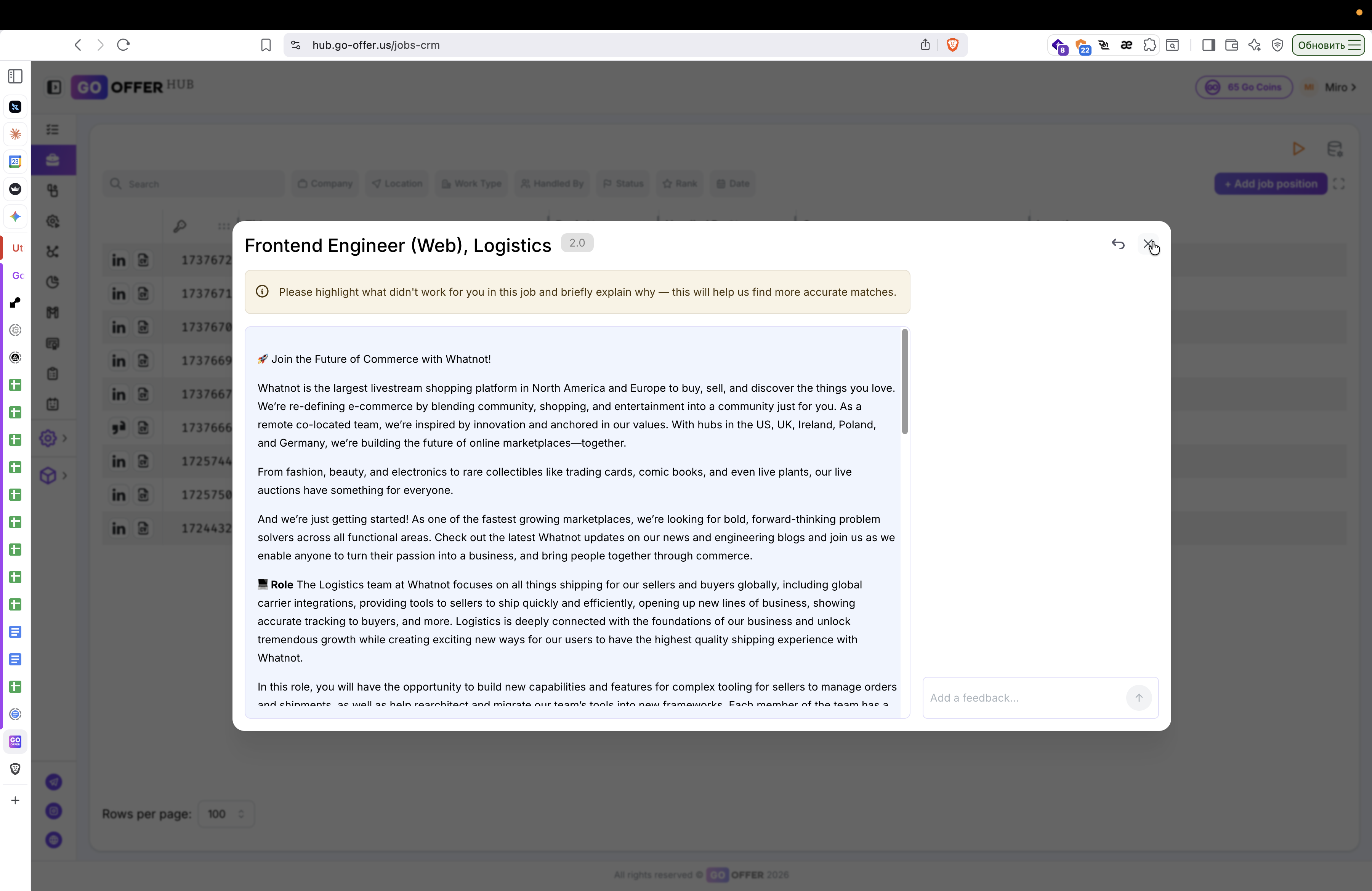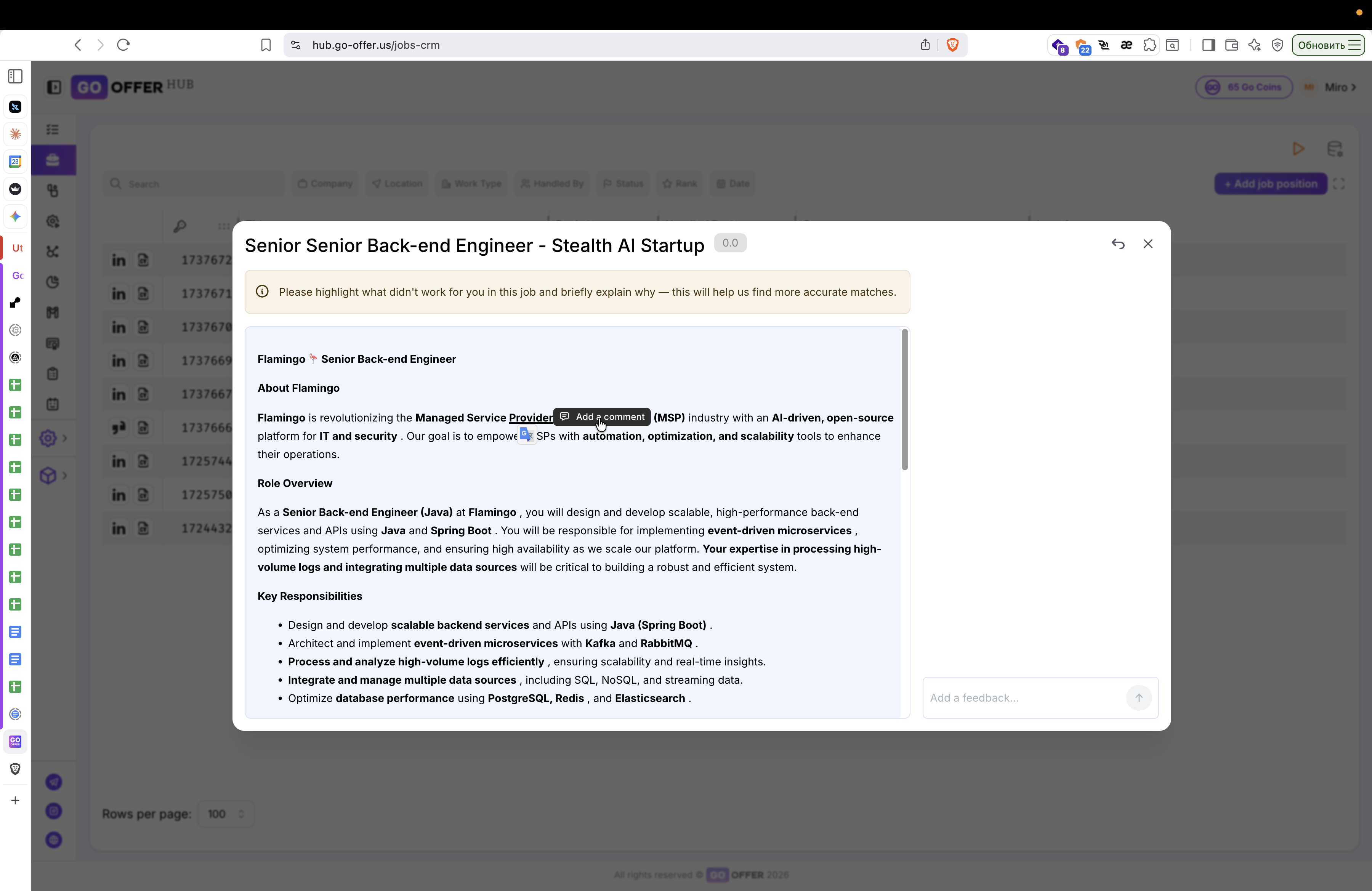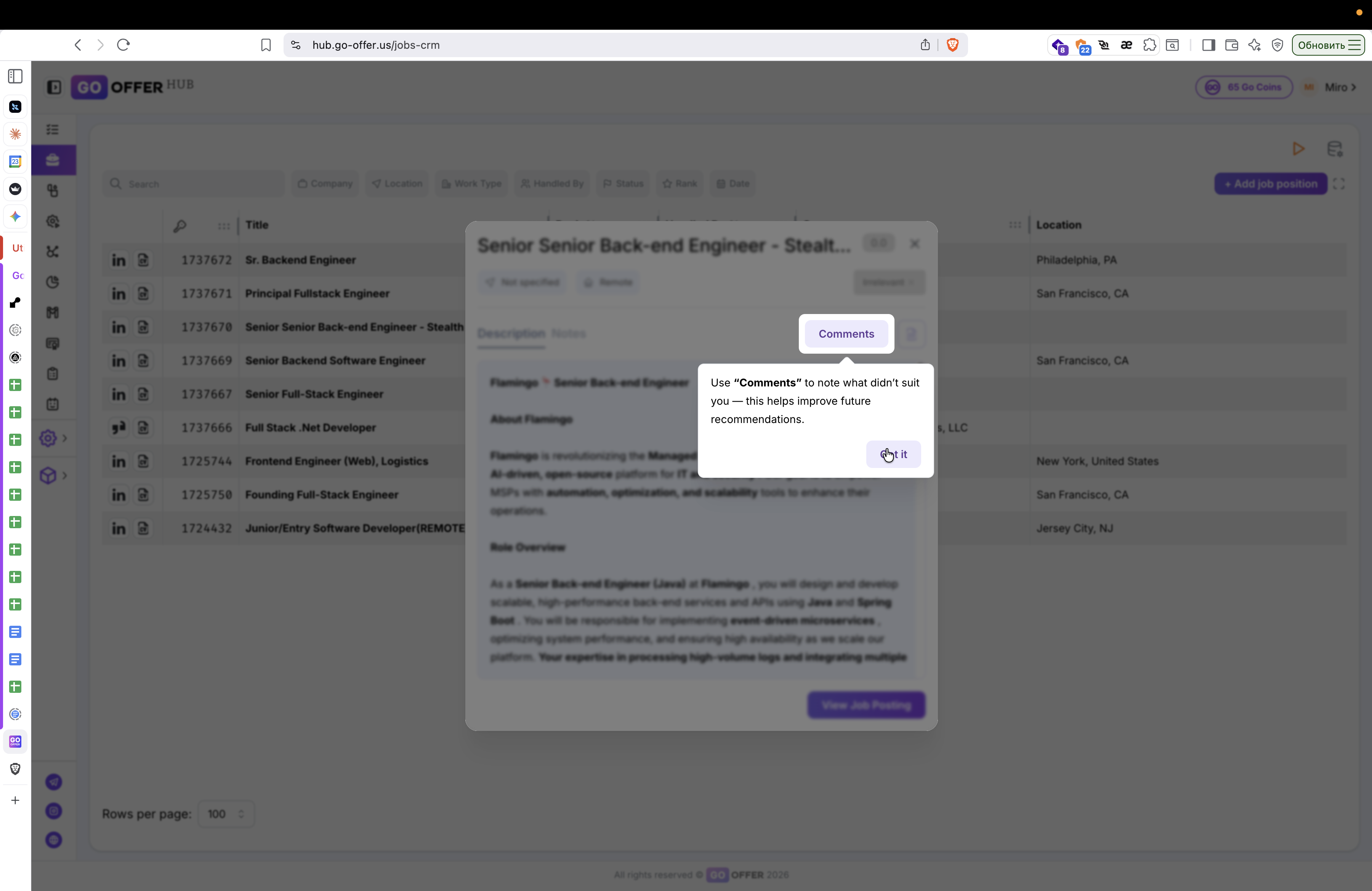 Завершив работу с комментариями, закройте карточку вакансии, нажав на крестик в правом верхнем углу.