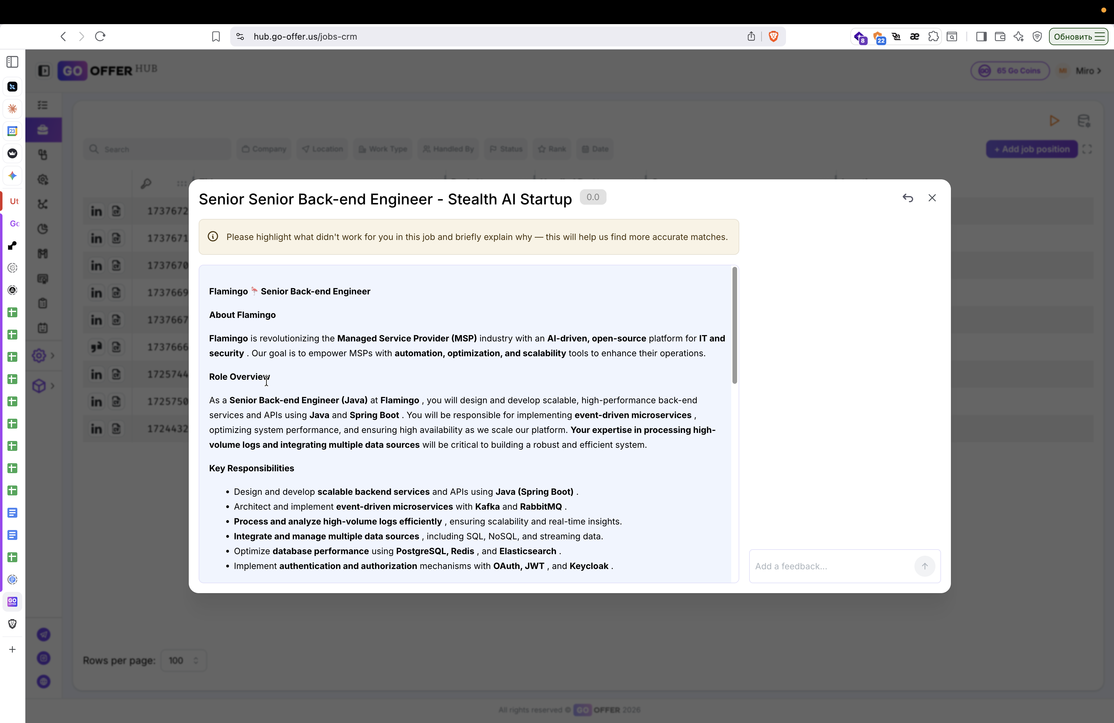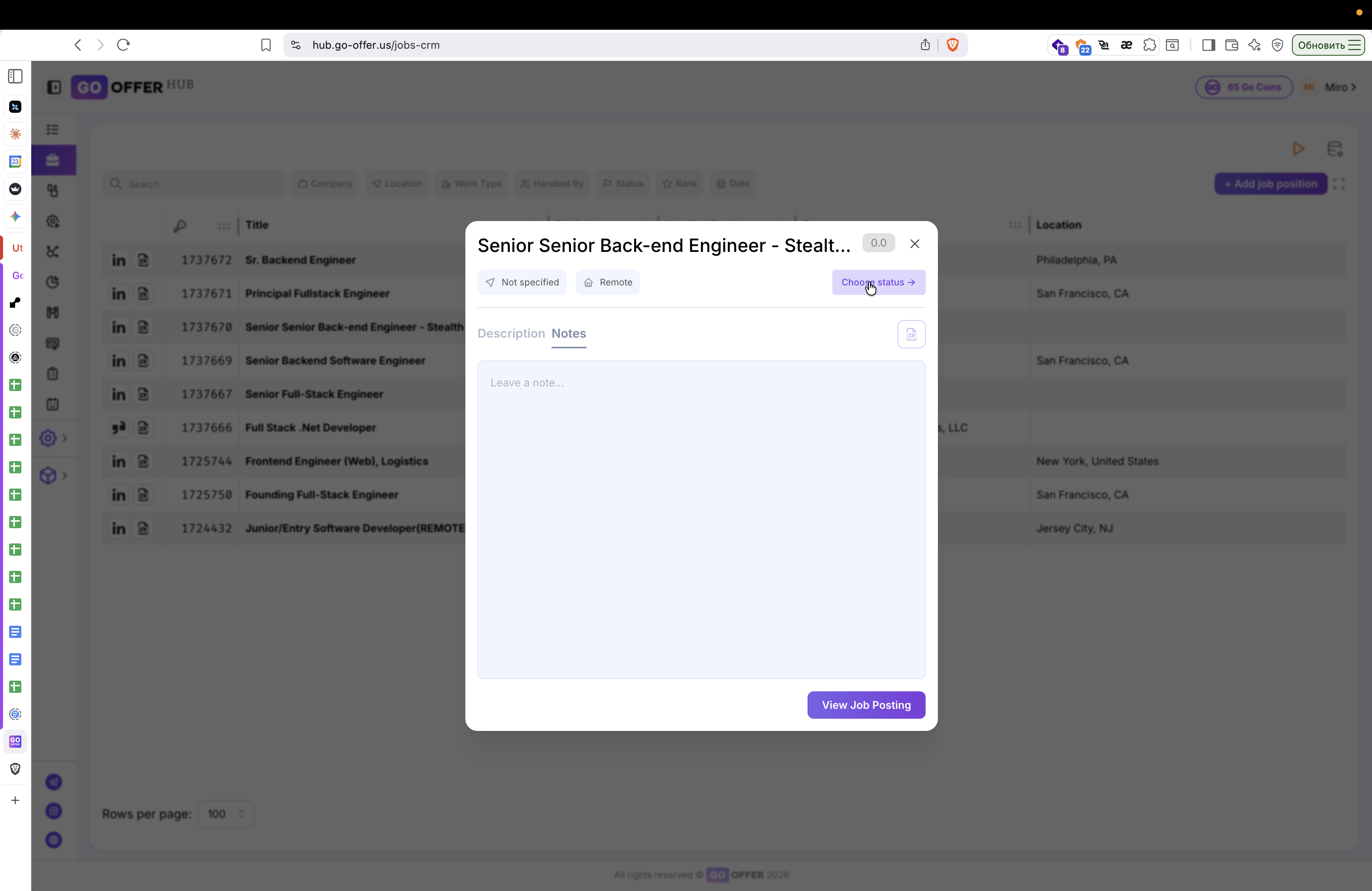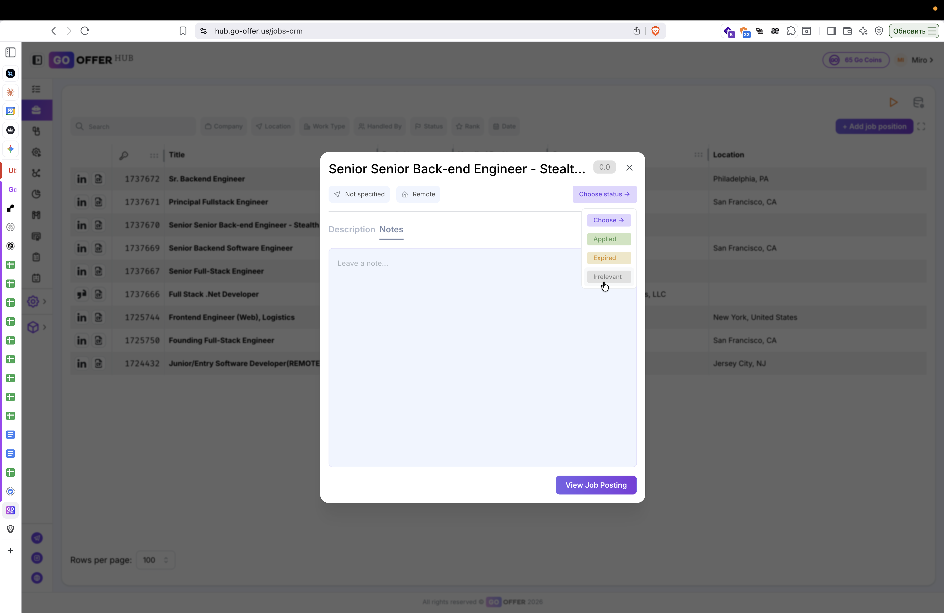 Завершив работу с комментариями, закройте карточку вакансии, нажав на крестик в правом верхнем углу.