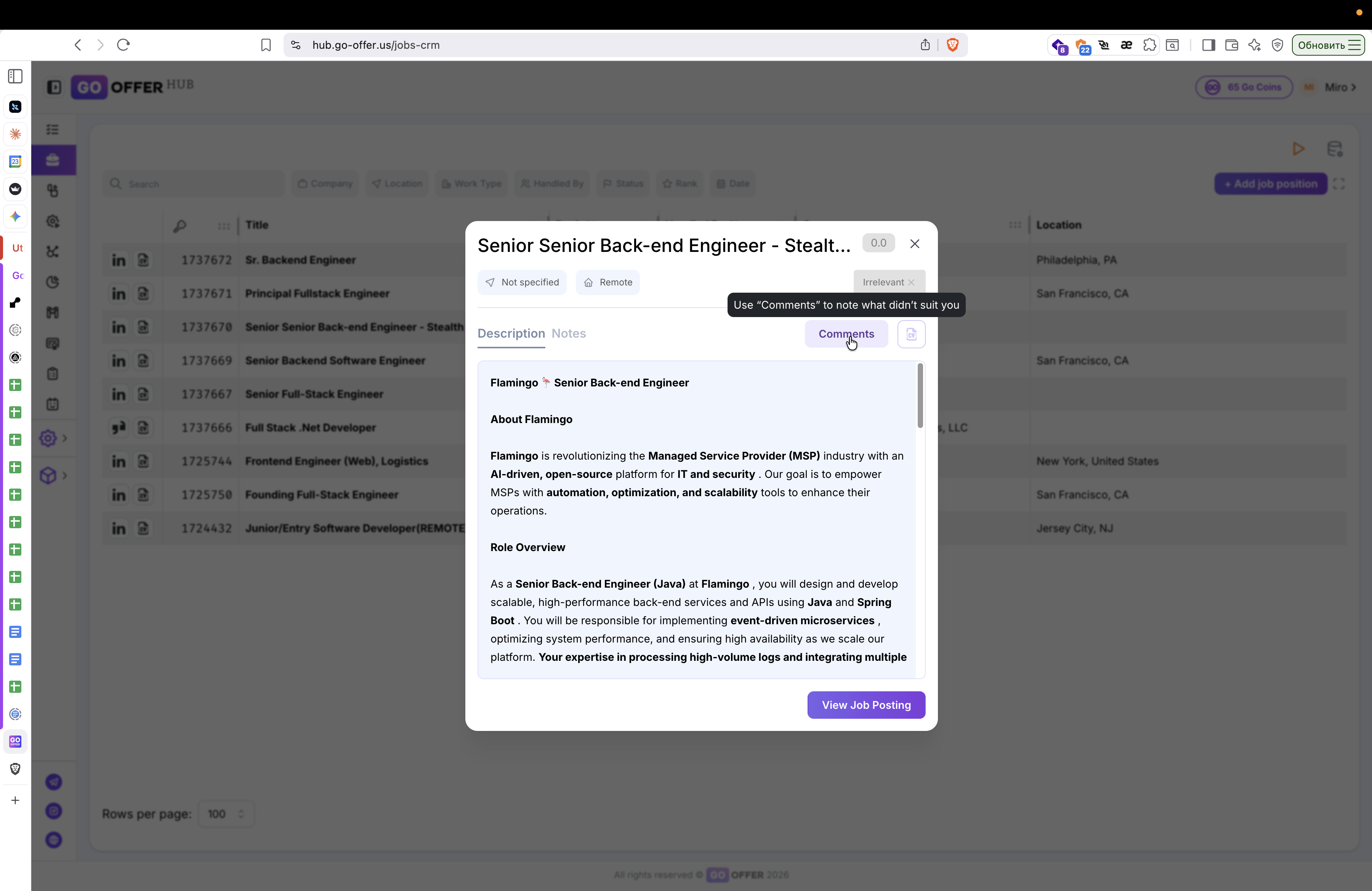 Перейдите на вкладку Comments, чтобы указать причину, по которой вакансия не подходит.