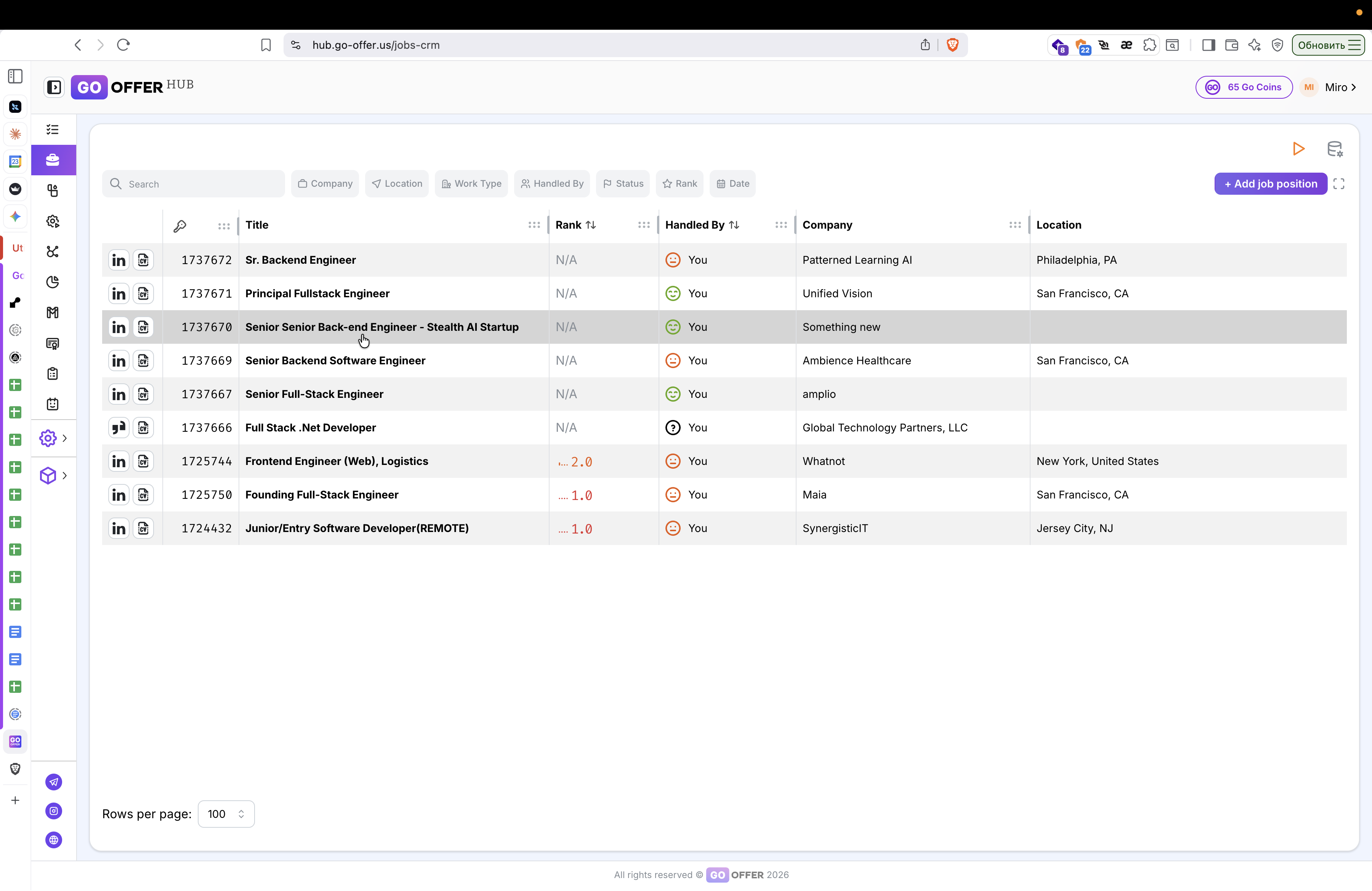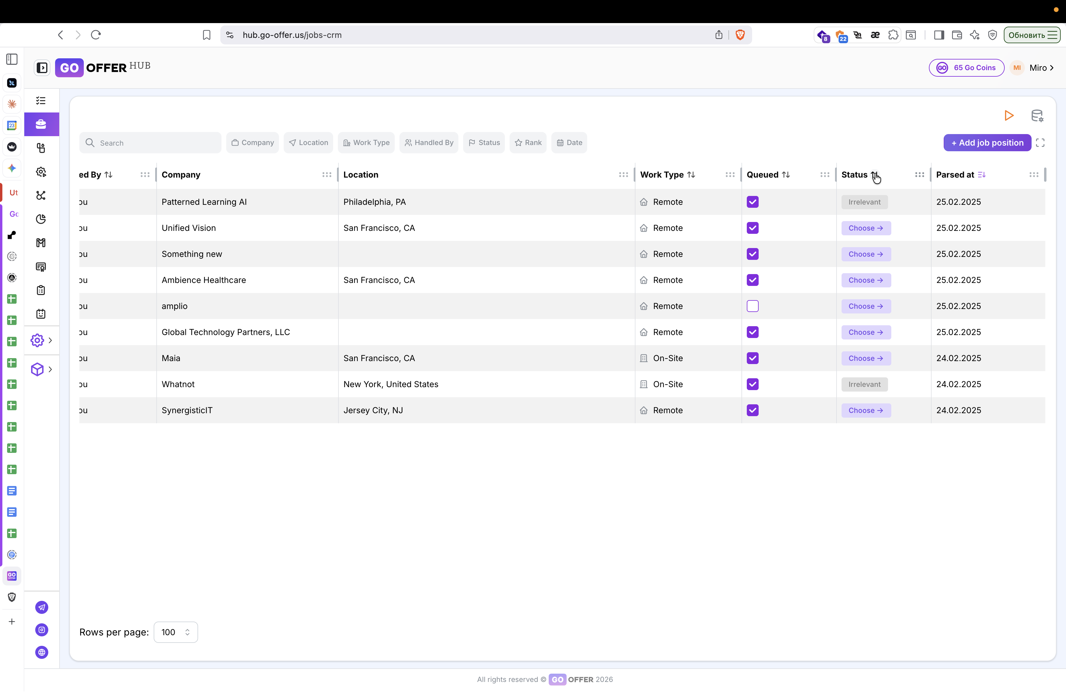 Если при изменении статуса на Irrelevant вакансия сразу перемещается в конец списка, это означает, что в таблице включена сортировка по статусу. Это стандартное поведение системы.