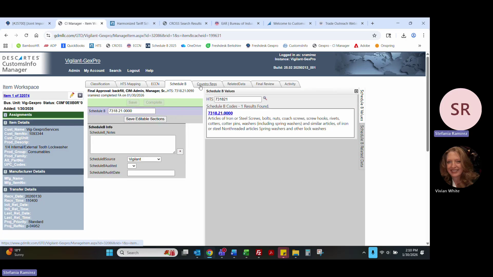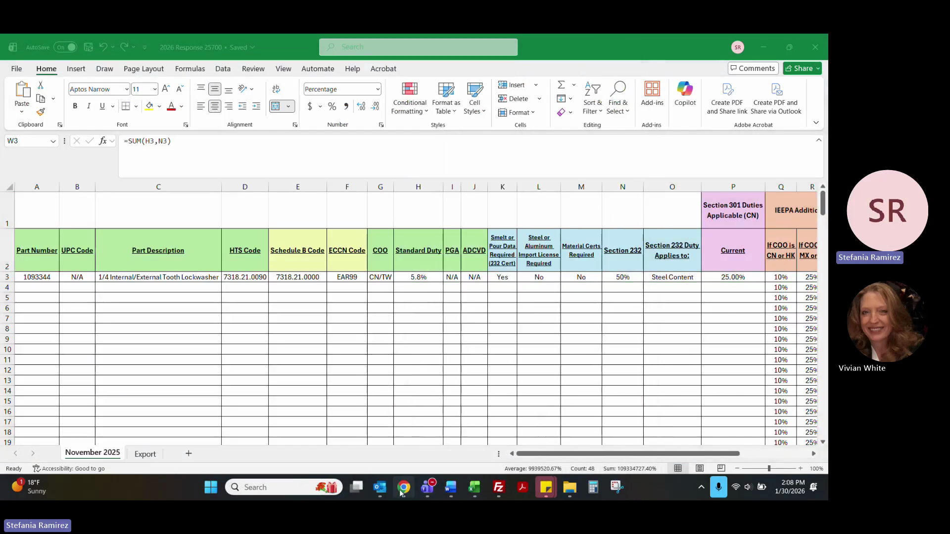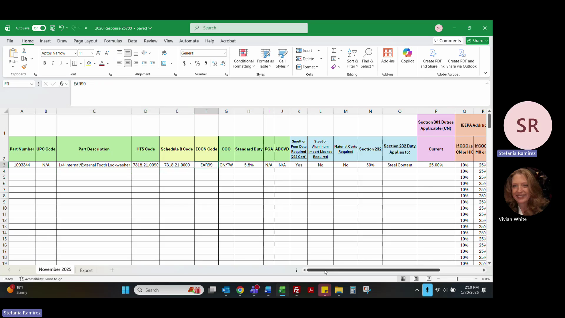 Copy the updated HTS, Schedule B, ECCN, and duty/tariff data (including Section 232 and 301 duties) into your Excel response template.