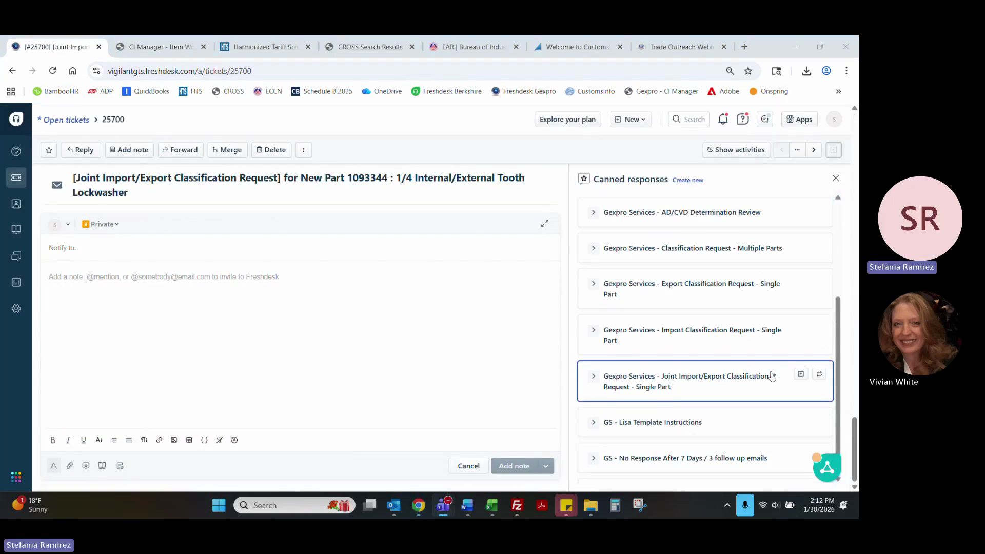 Insert the appropriate canned response template (e.g., Joint Import/Export).
