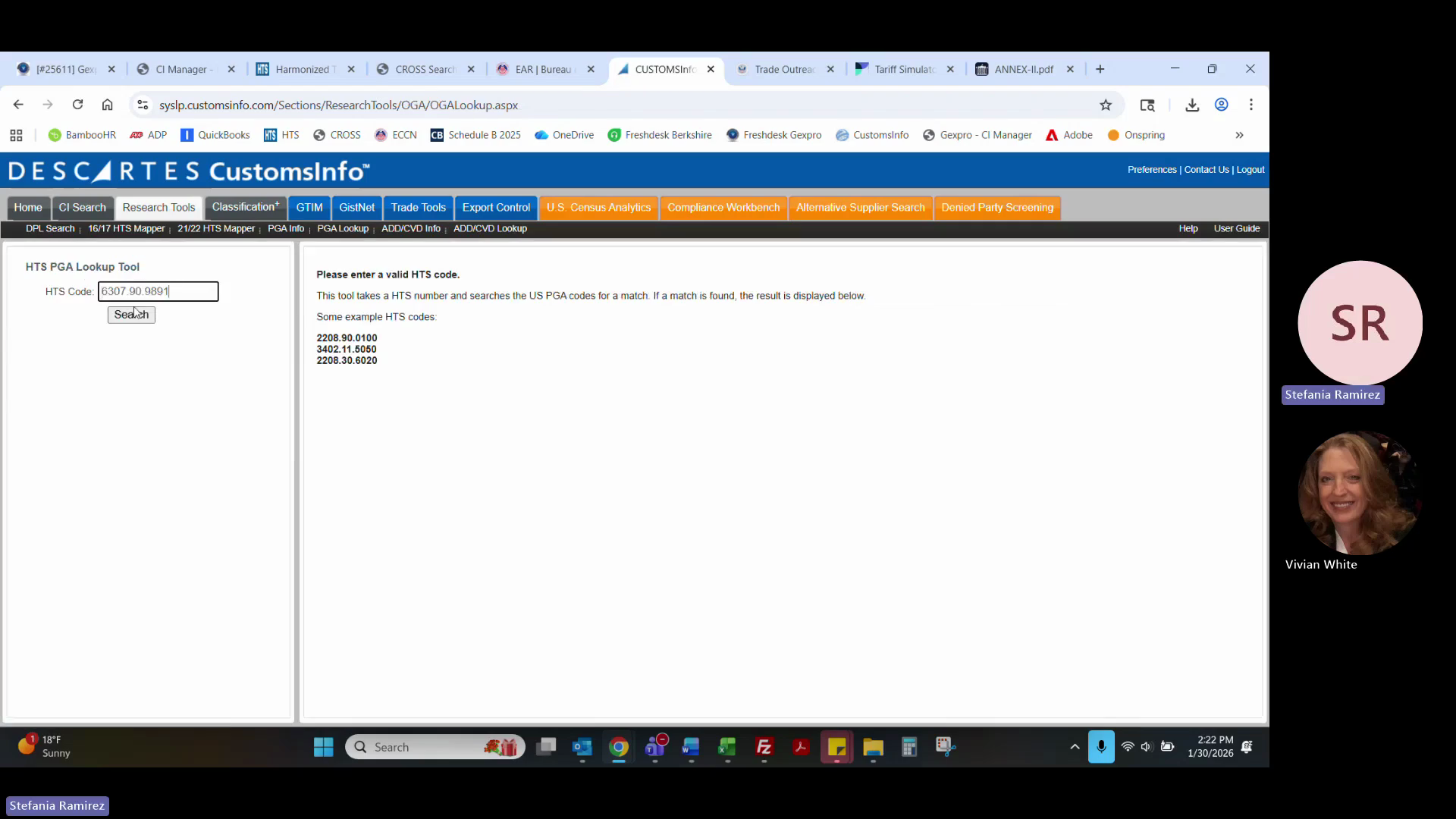 Run separate searches for Classifications, HTS Mappings, ECCN, Schedule B, and Country Regs.