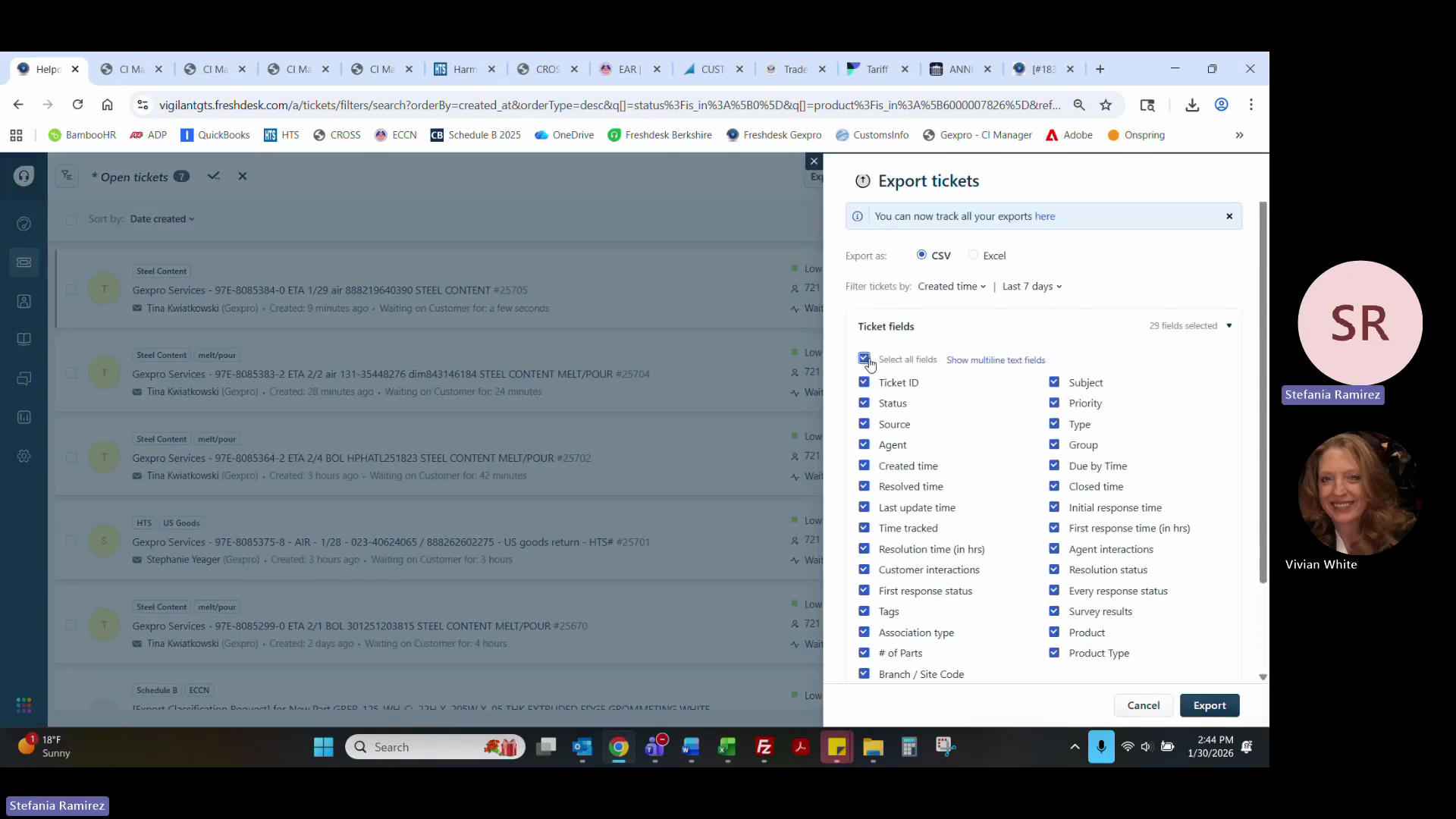 Select Show all ticket fields and initiate the export.