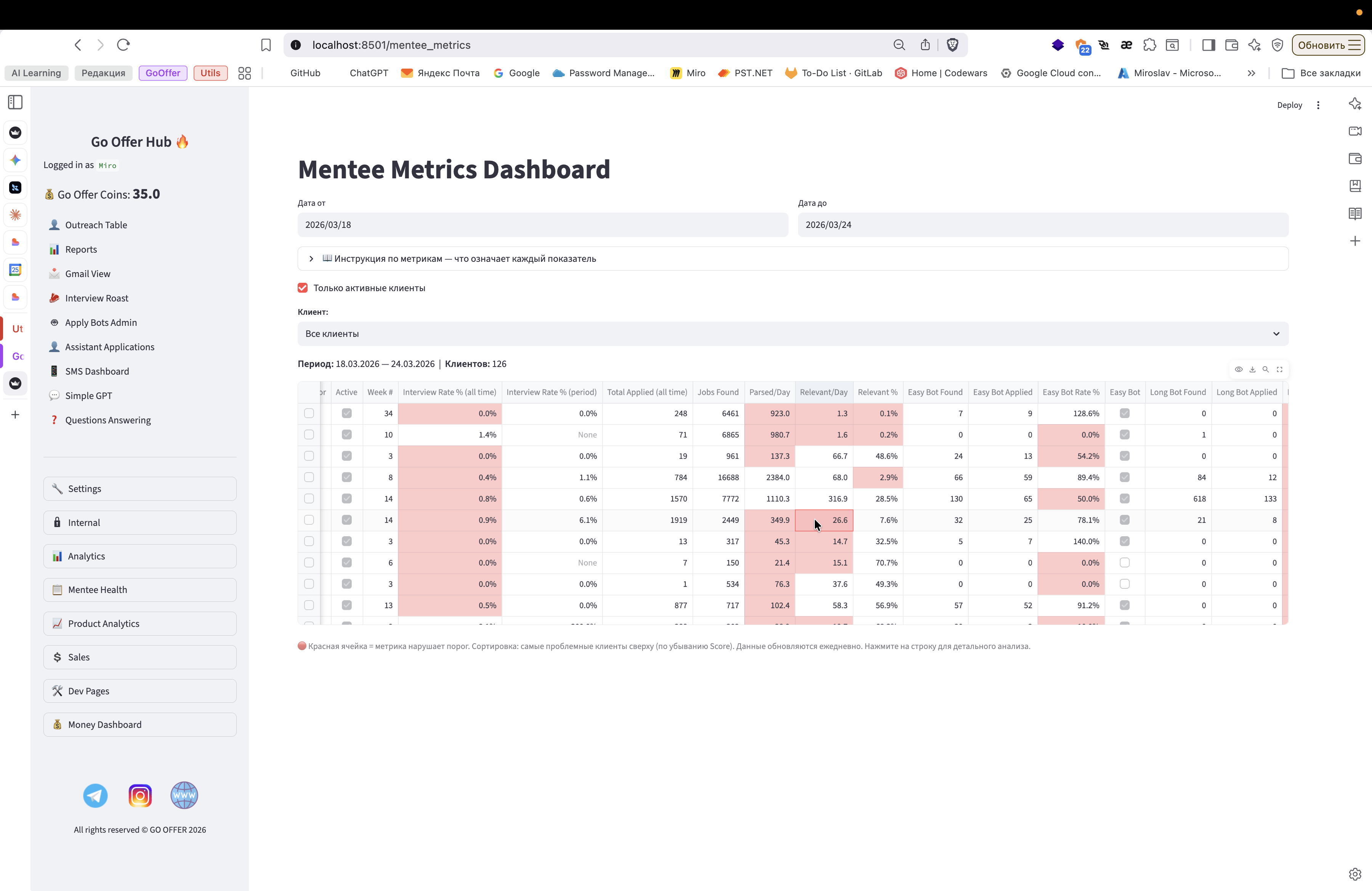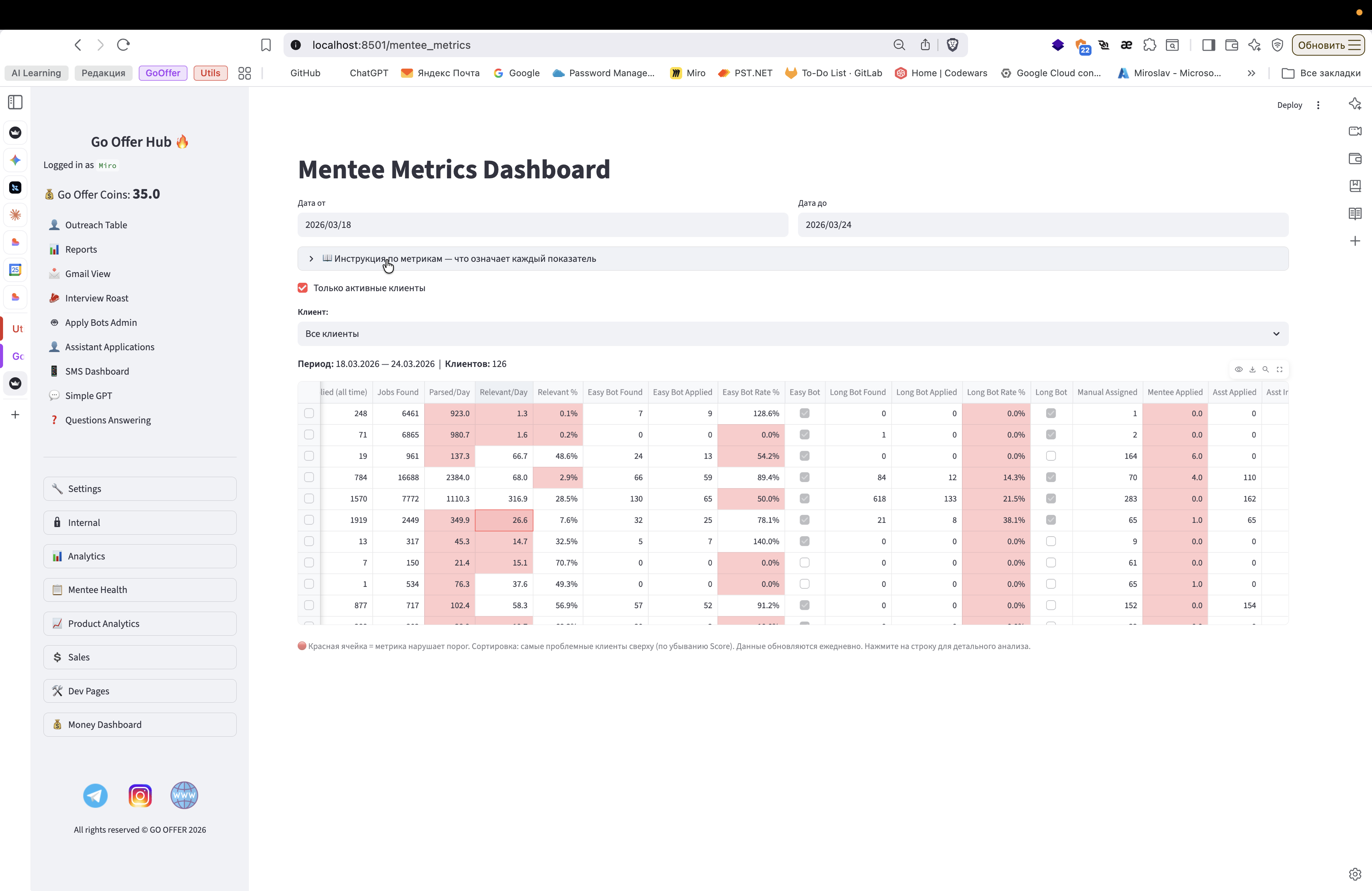 И все эти метрики действительно нужны, мы их обсуждали. Вот. Красным выделяются проблемы, и затем ставится финальная отметка. . У этих клиентов есть проблемы. Можно посмотреть, какие именно.
