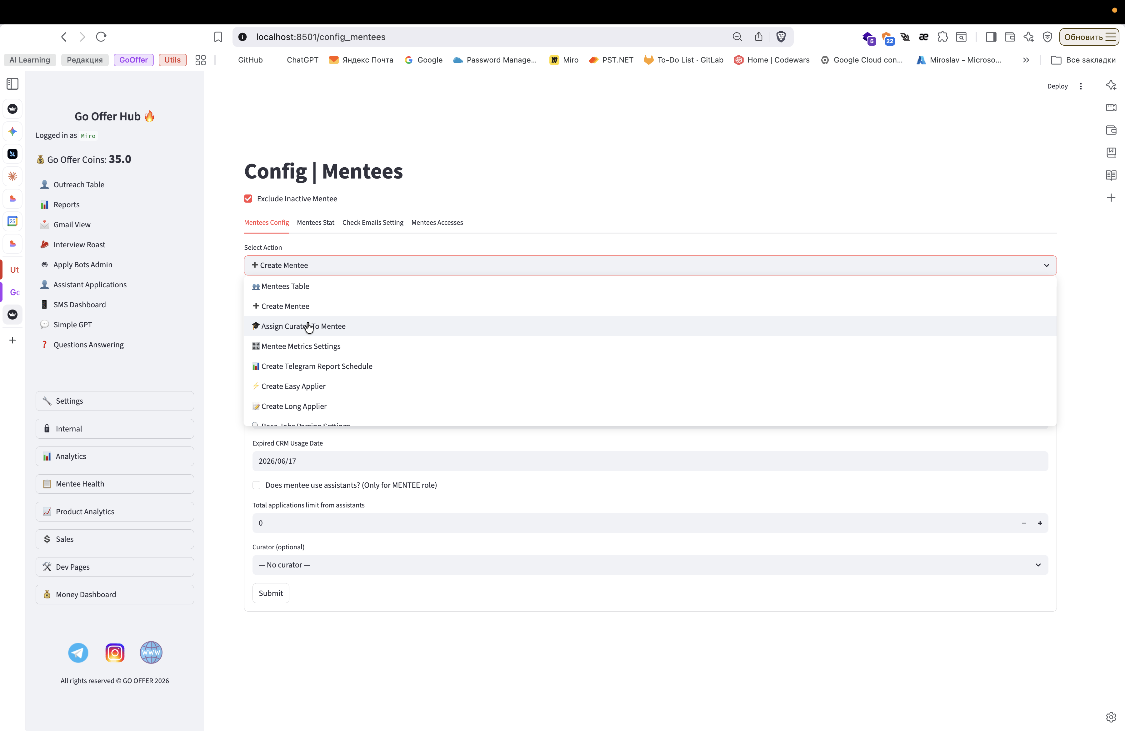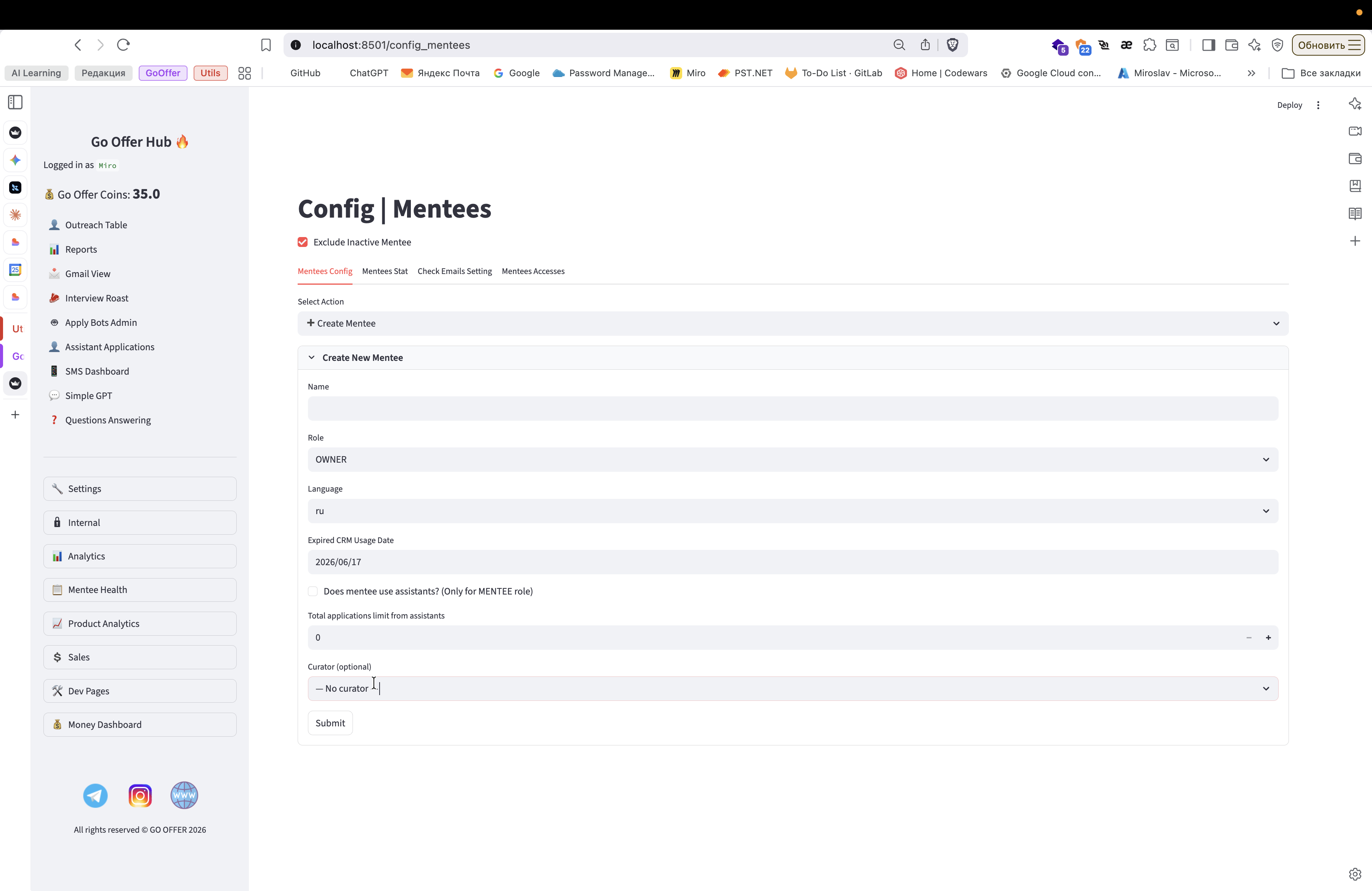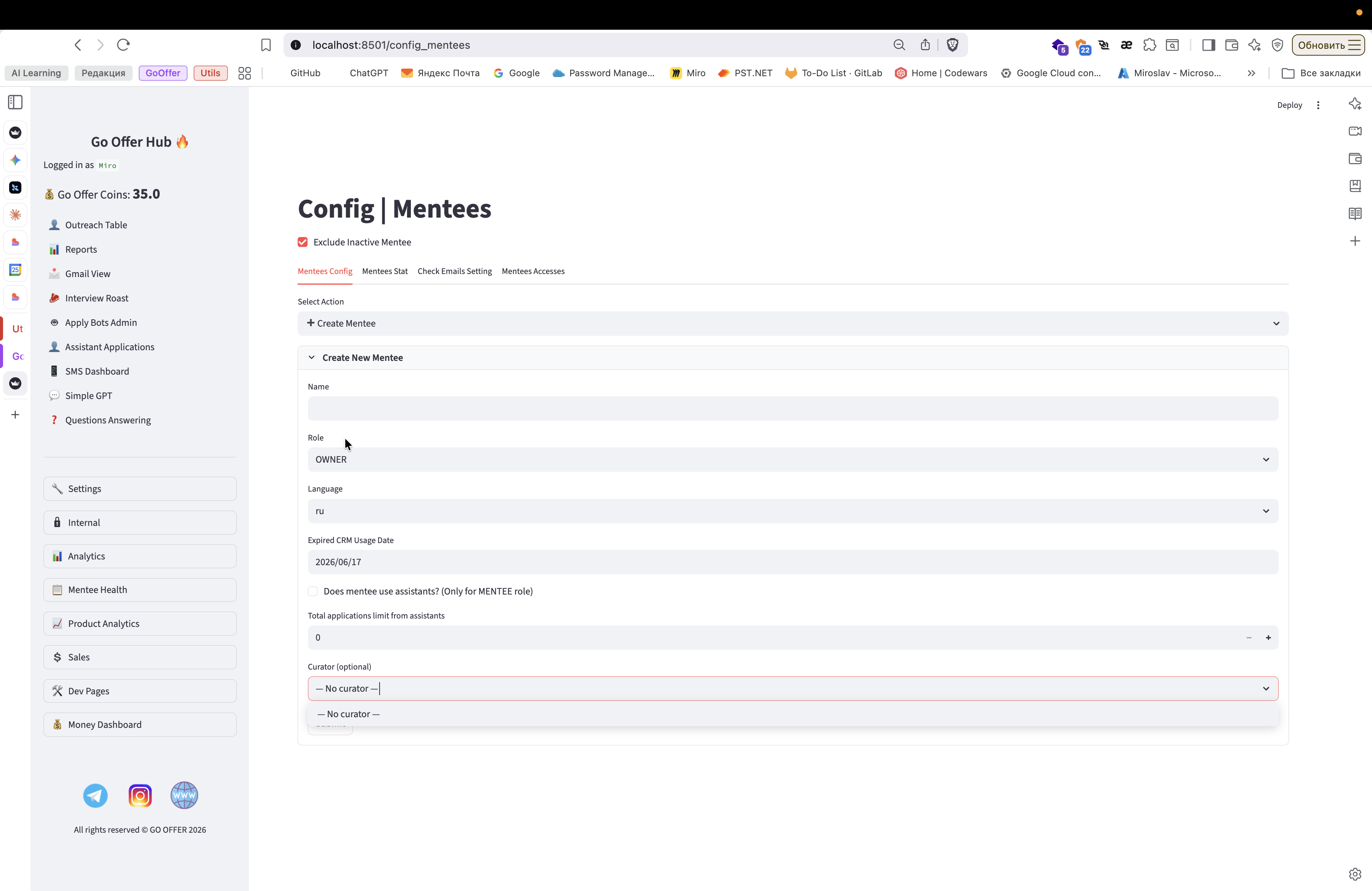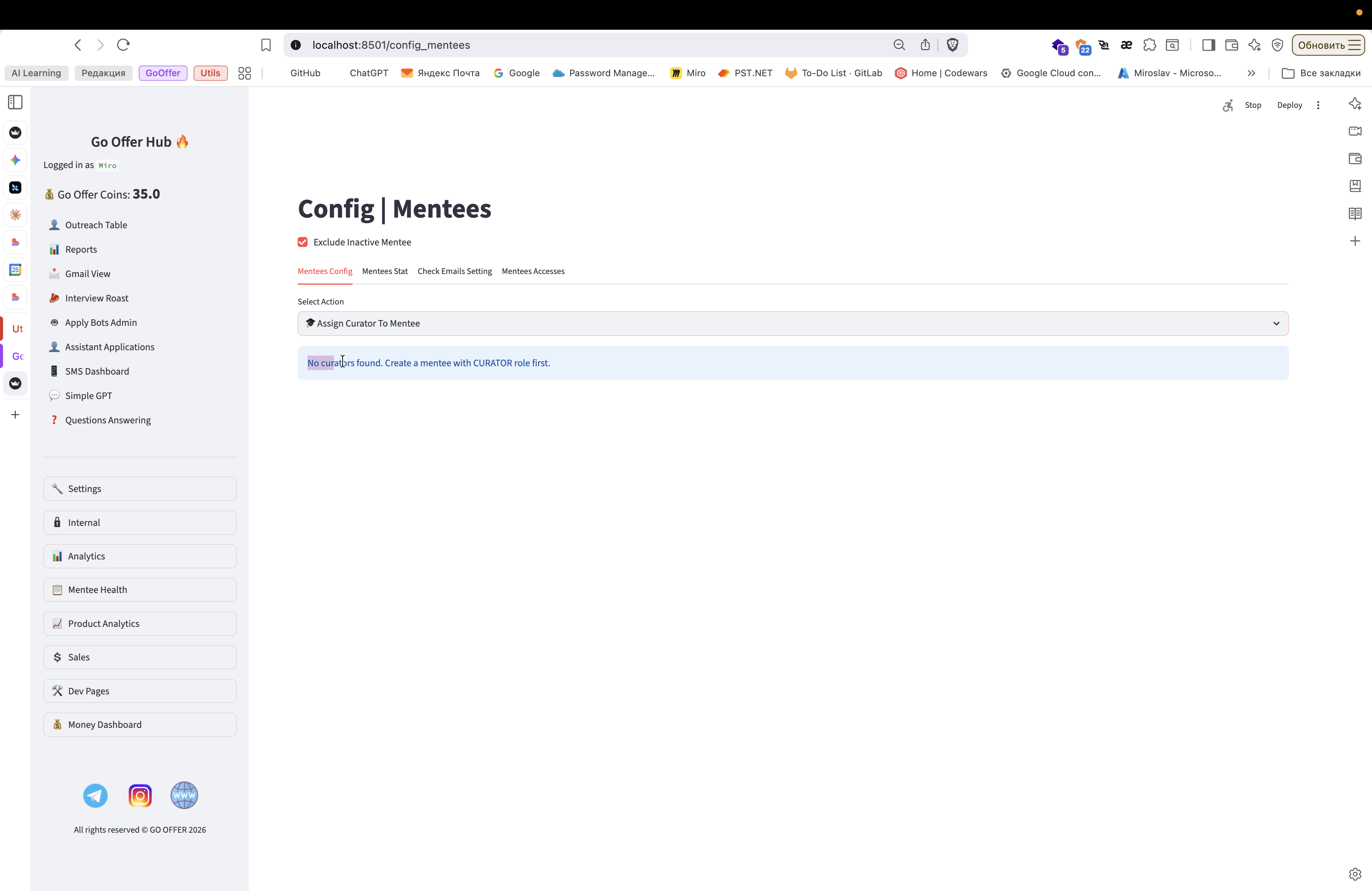 Вот. А, но здесь я не покажу функциональность, потому что в системе еще нет ни одного куратора. В целом интерфейс очень понятный.