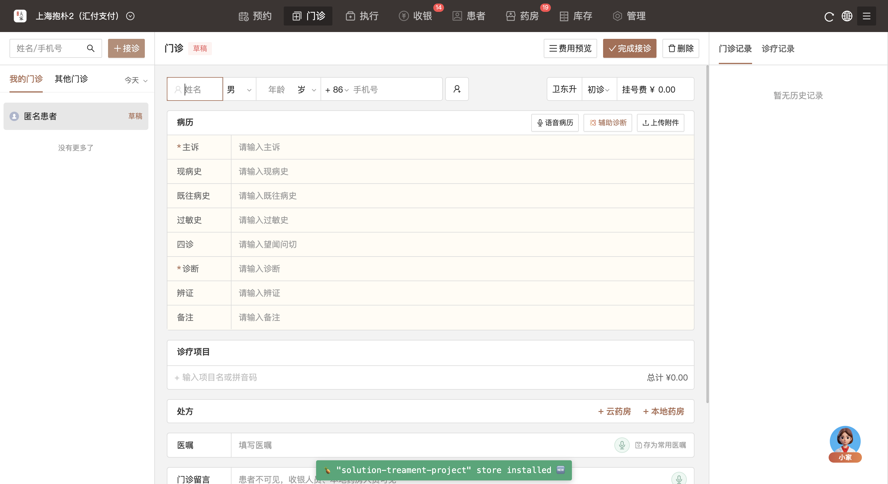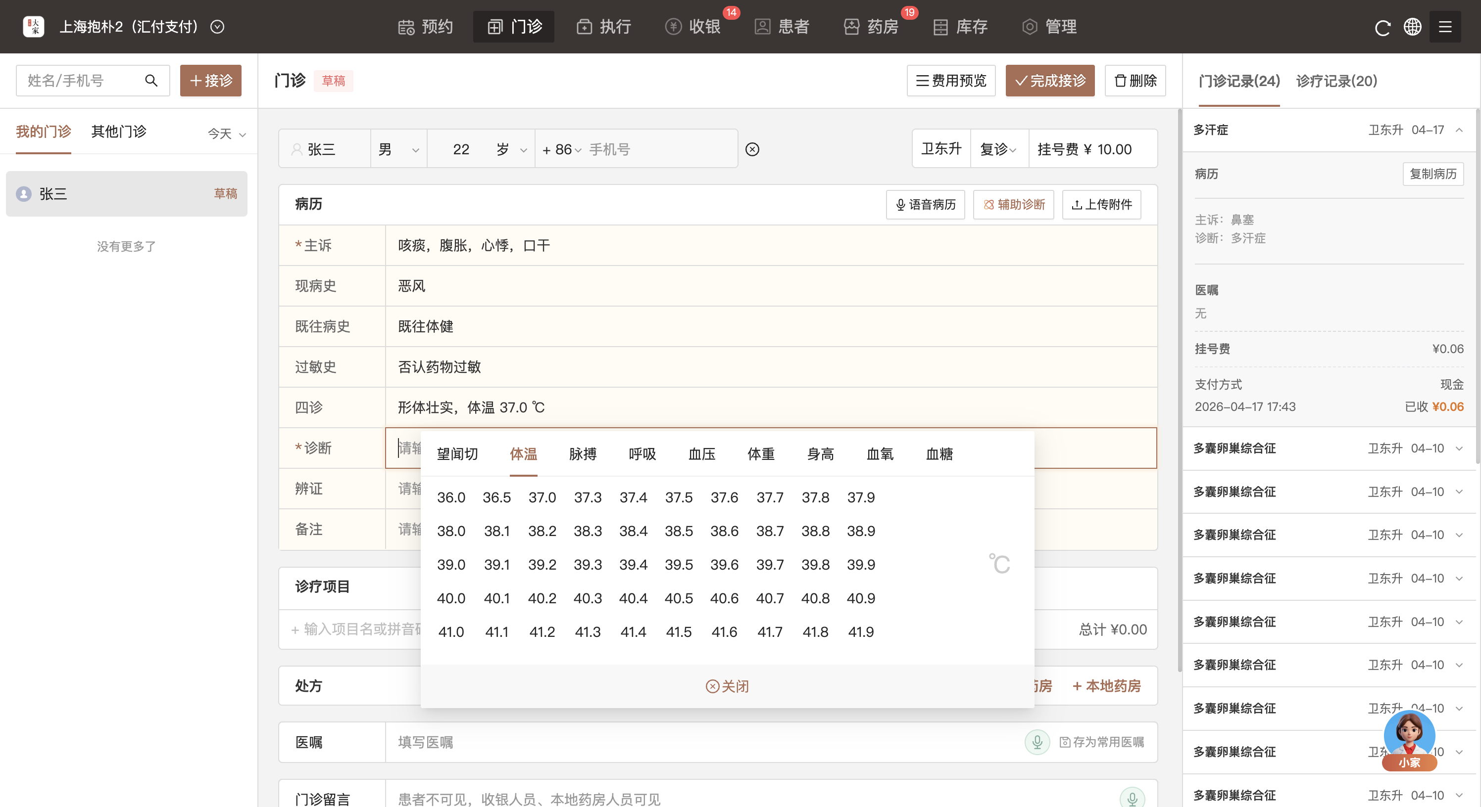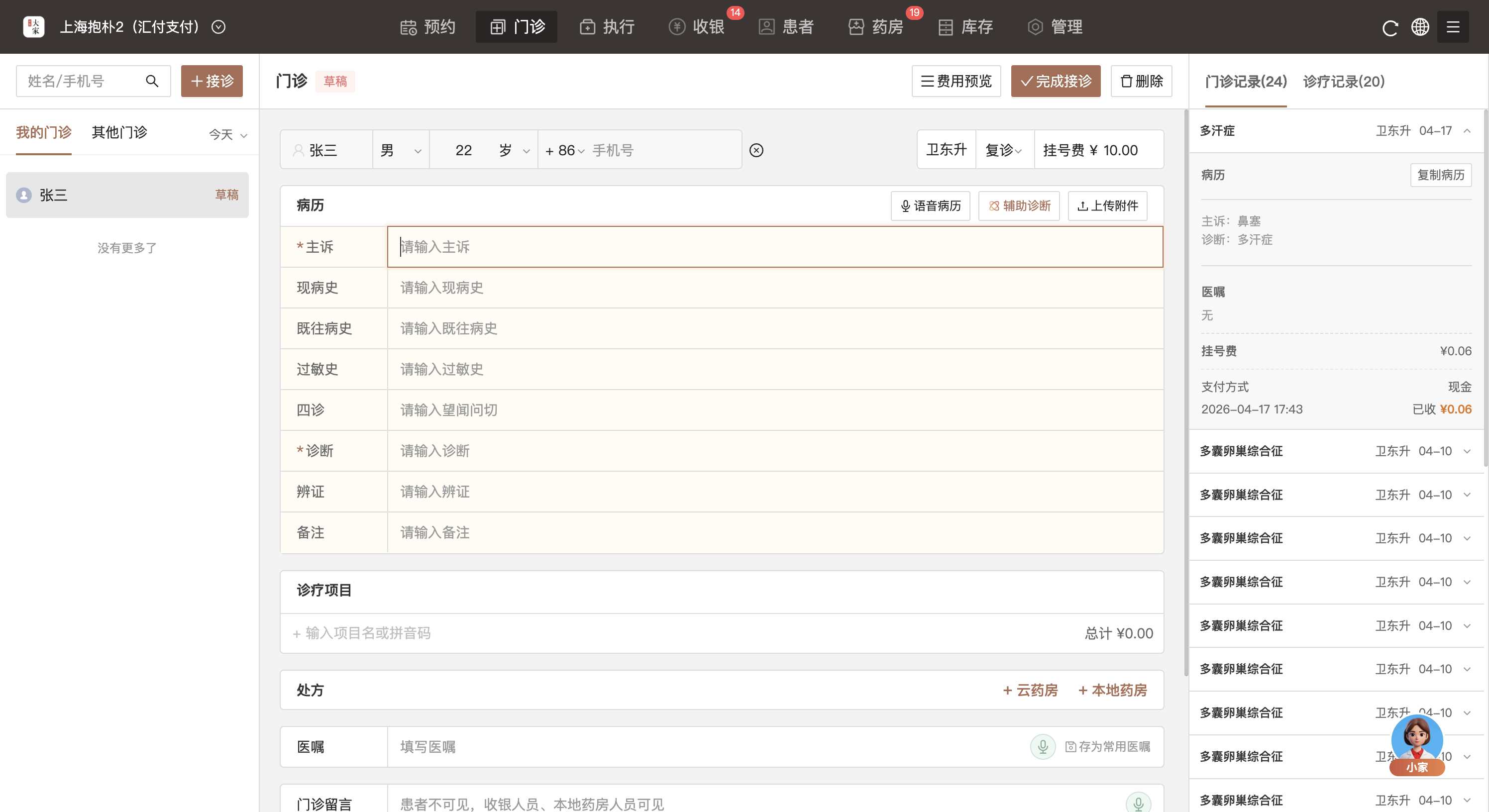 点击左上角的 + 接诊 按钮,开启一个新的看诊记录。