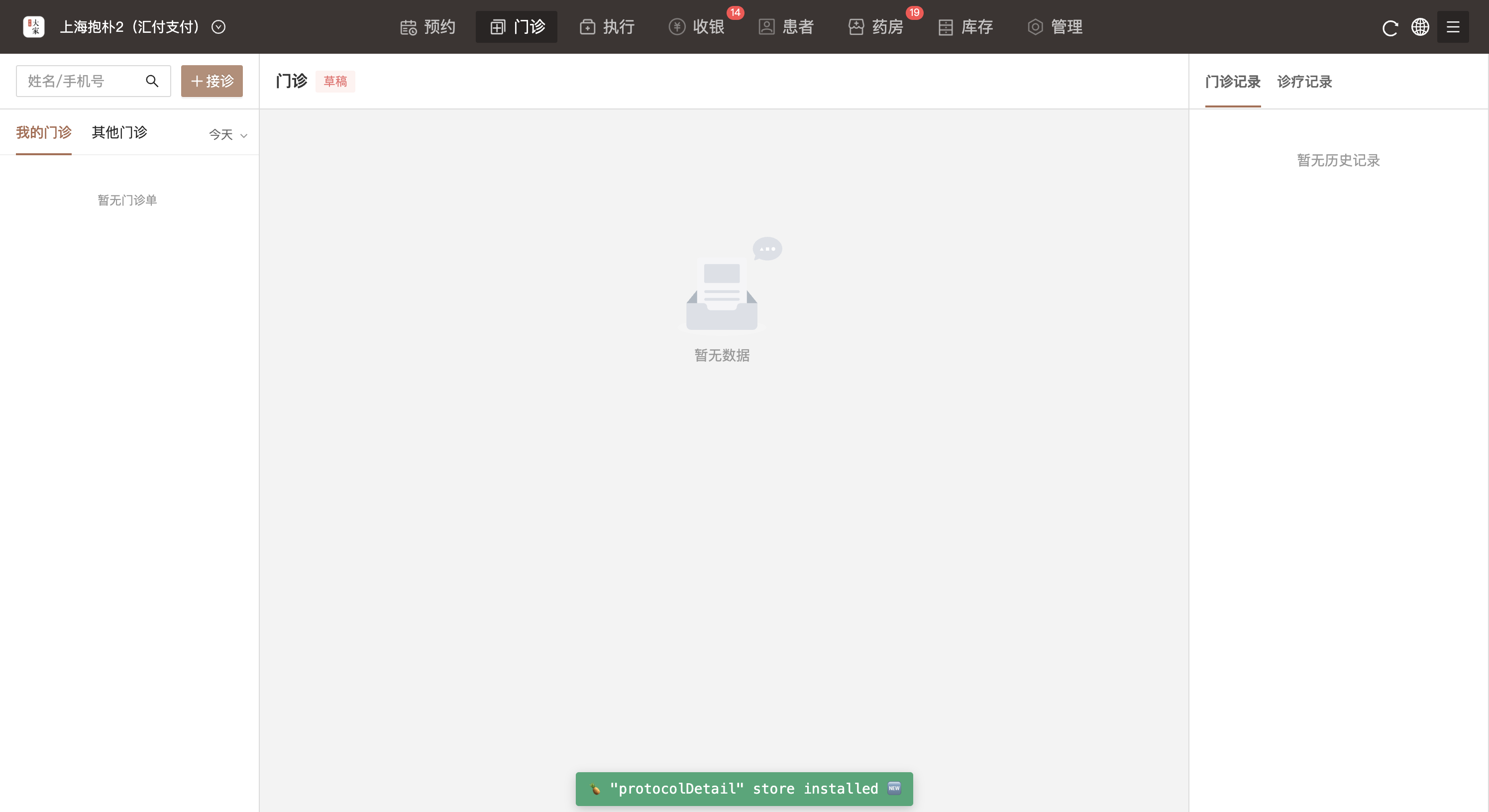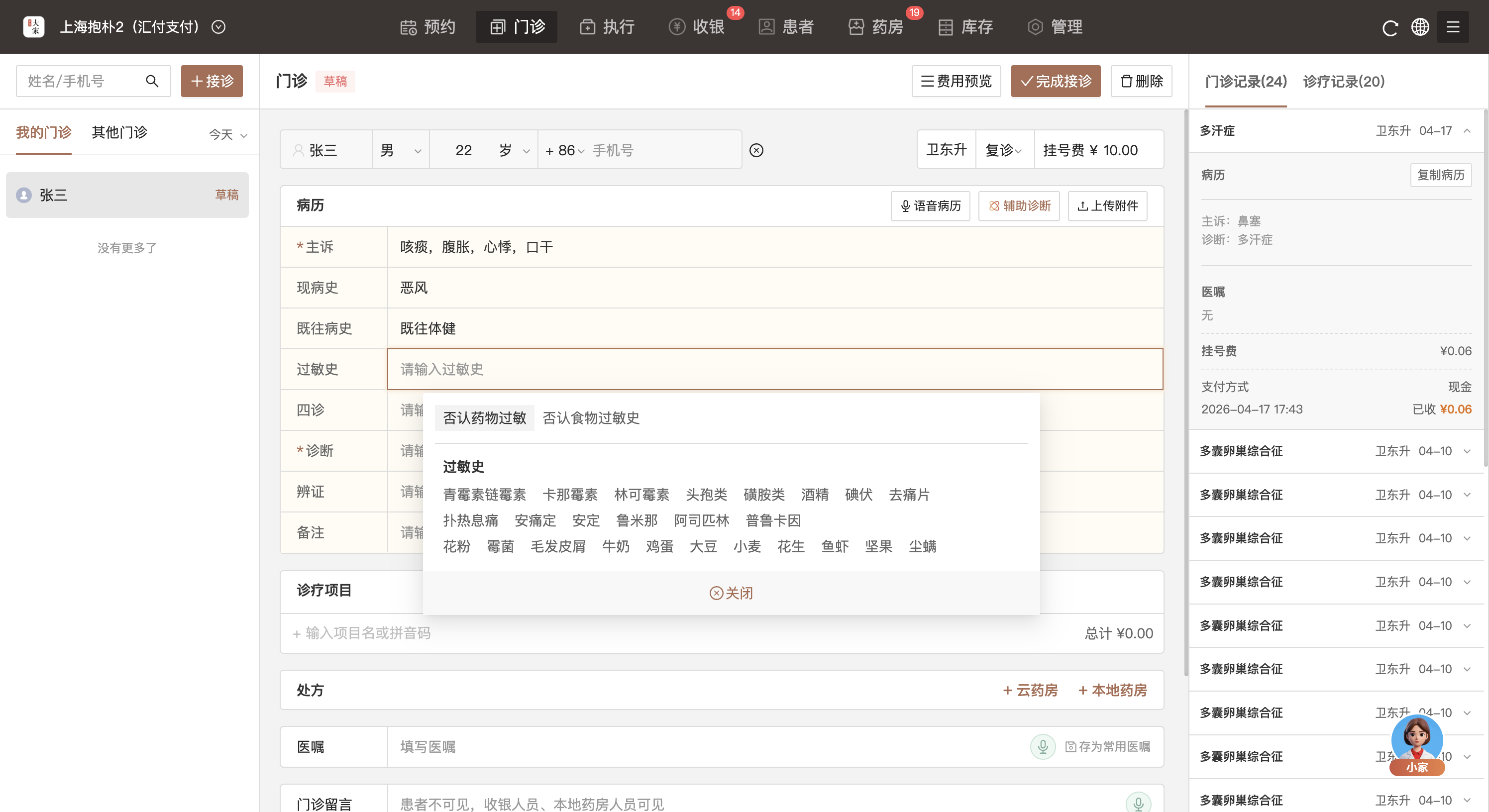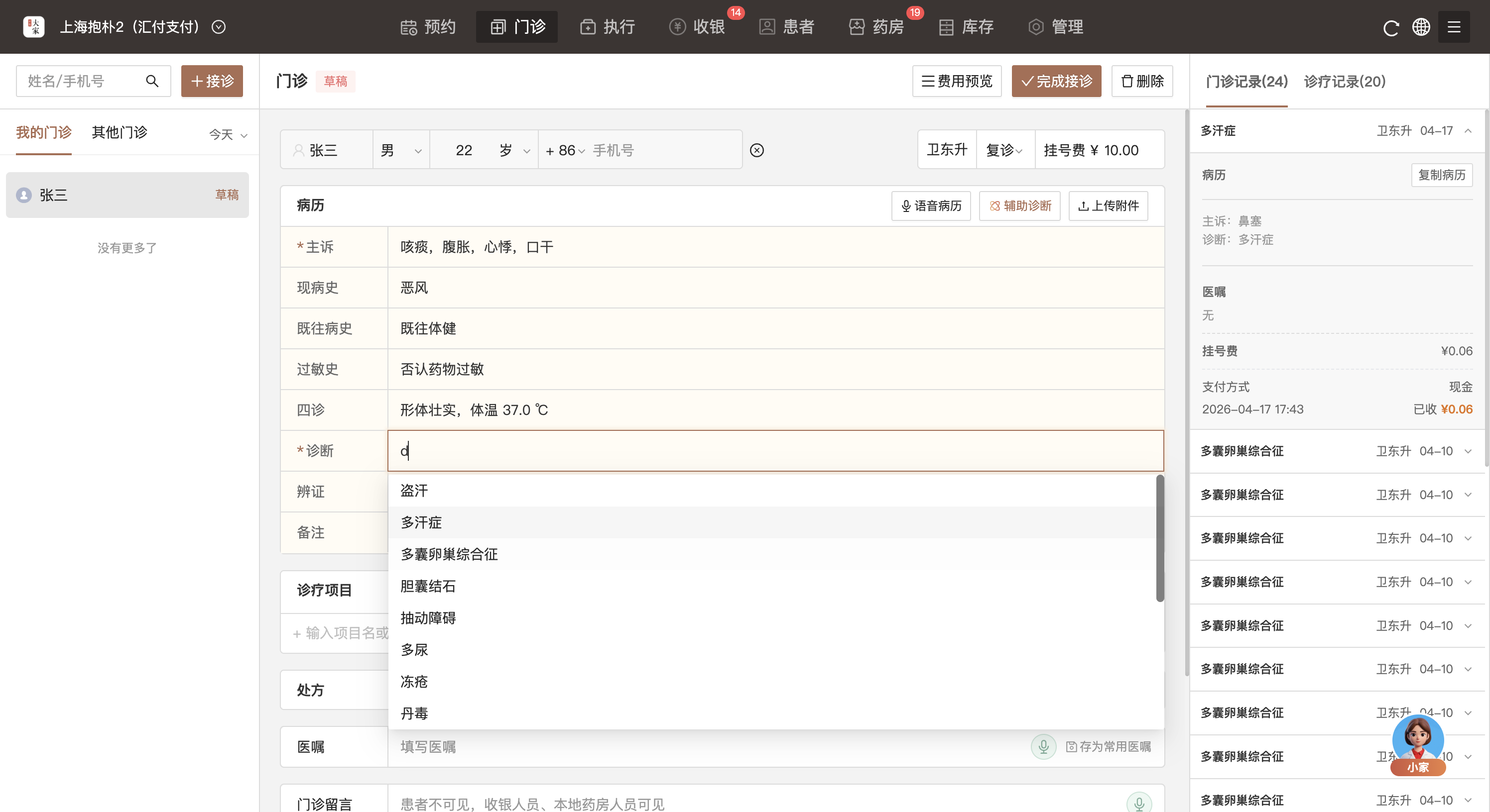 点击左上角的 + 接诊 按钮,开启一个新的看诊记录。