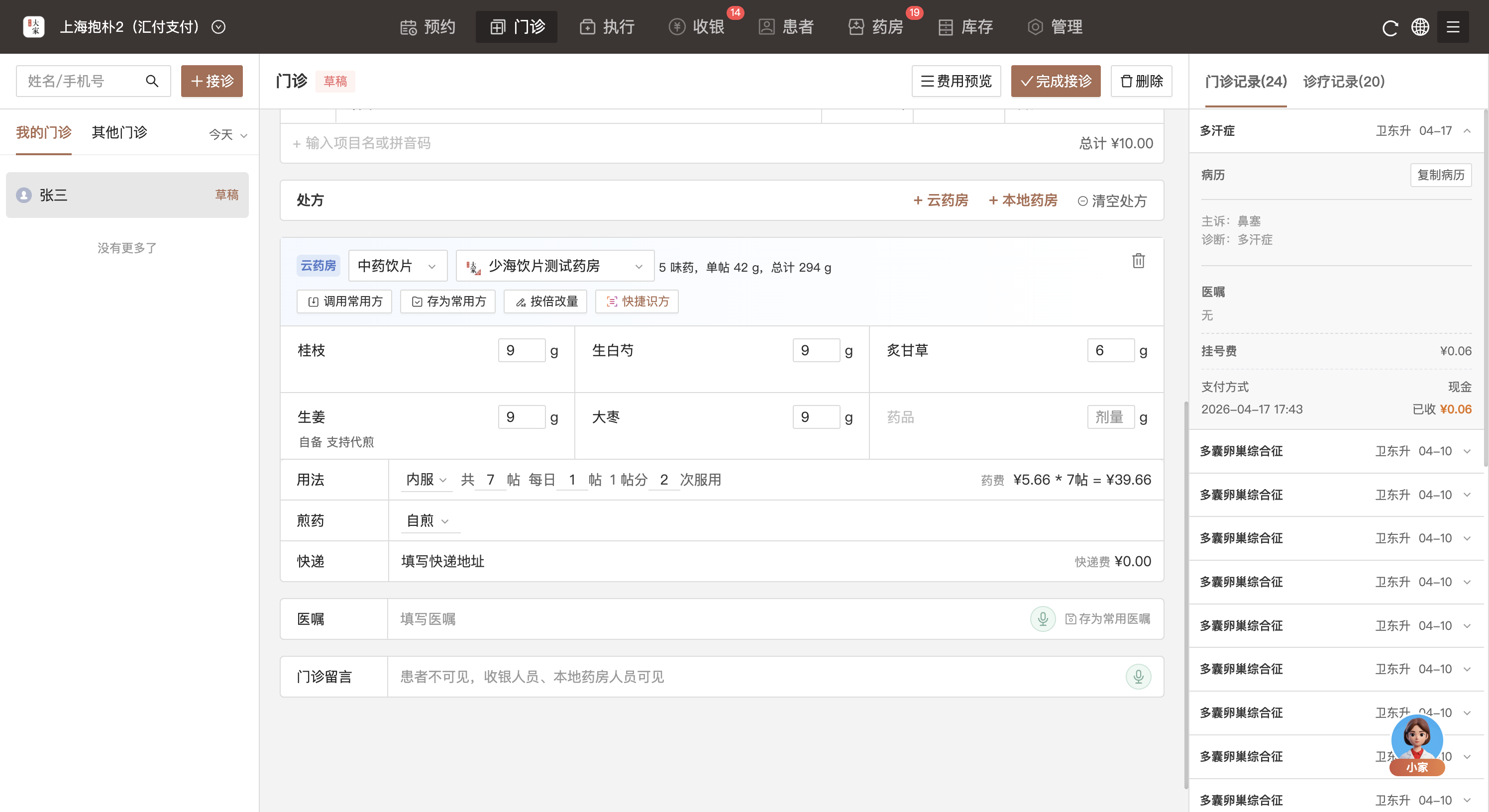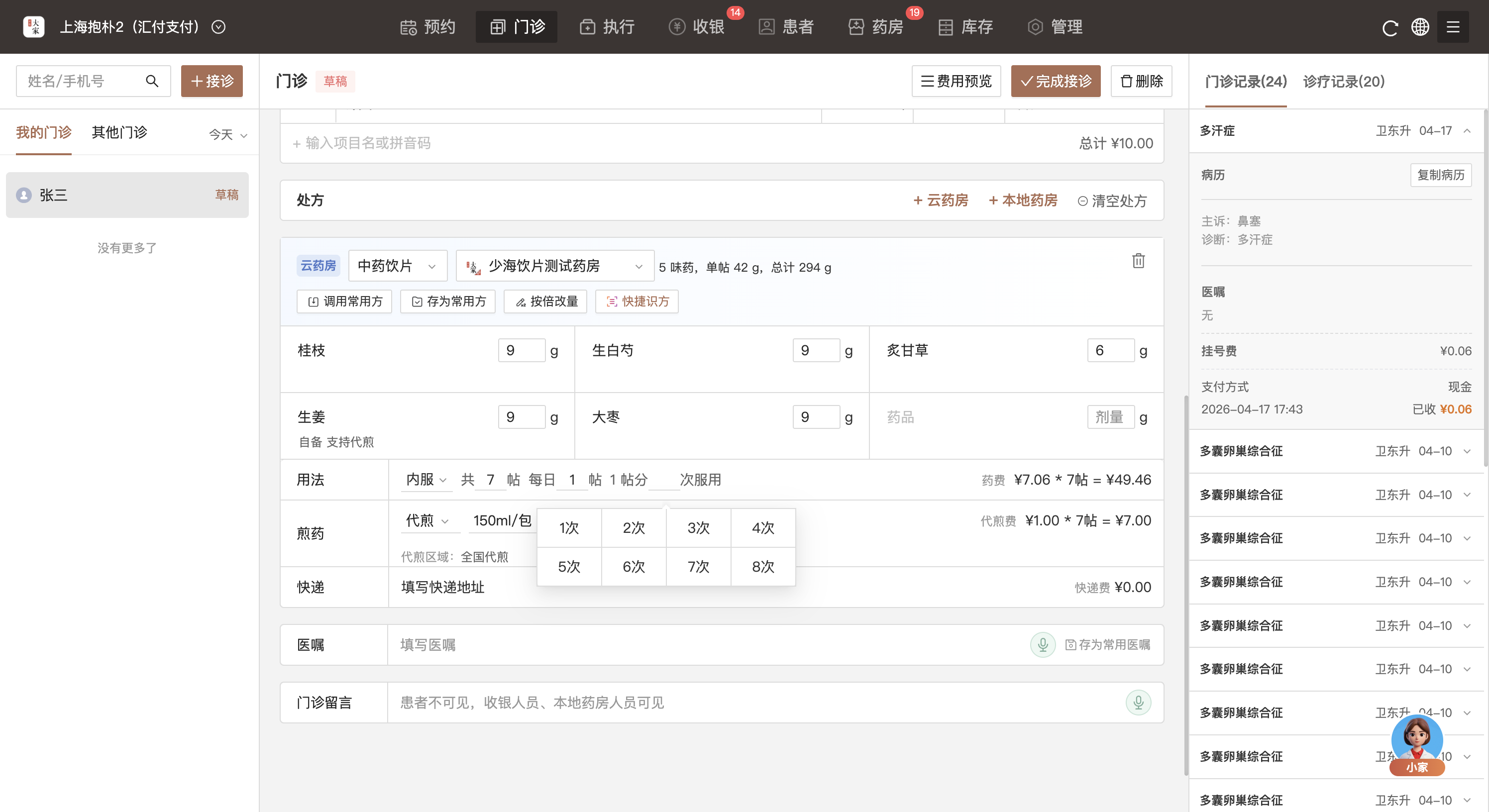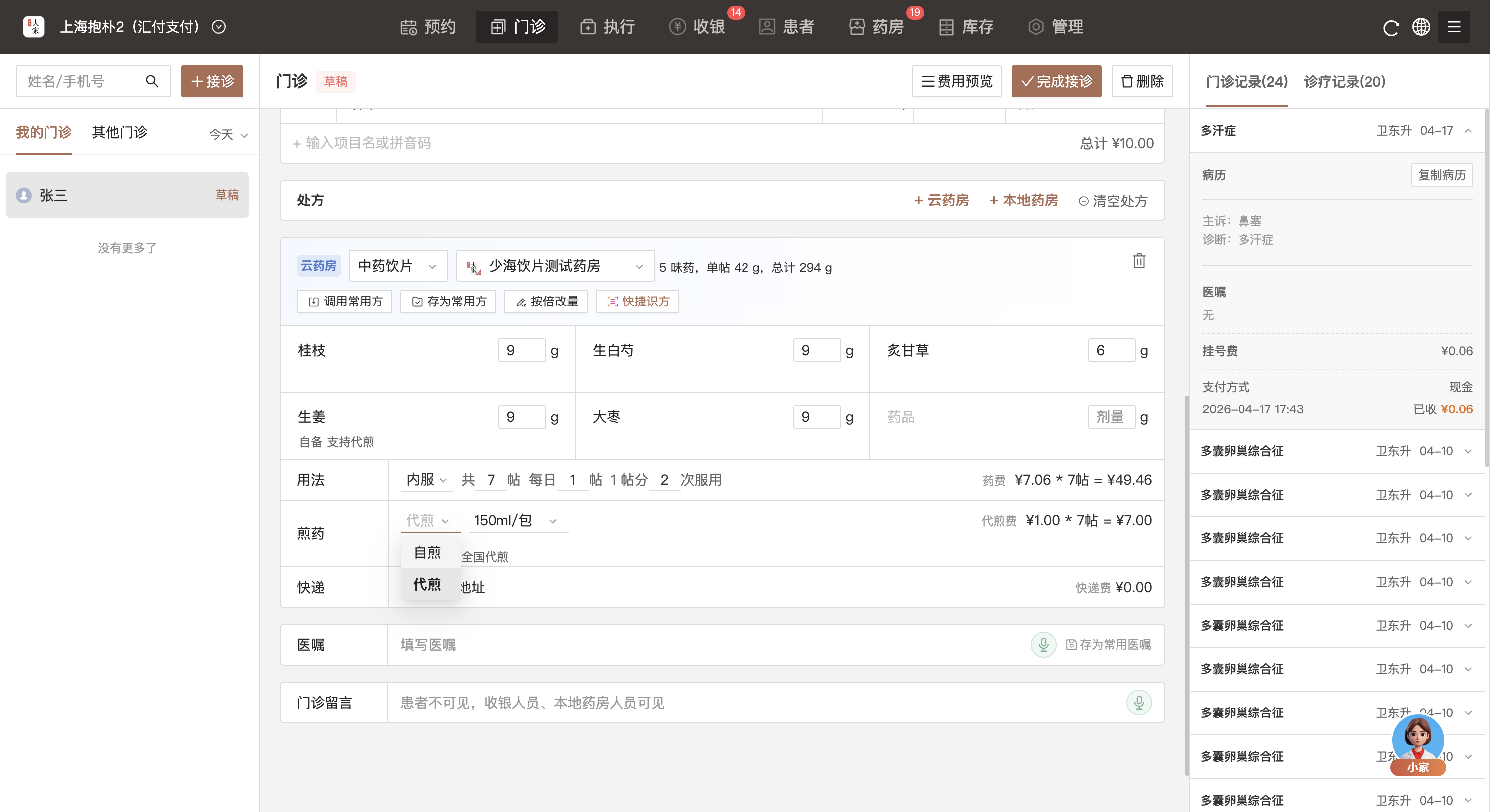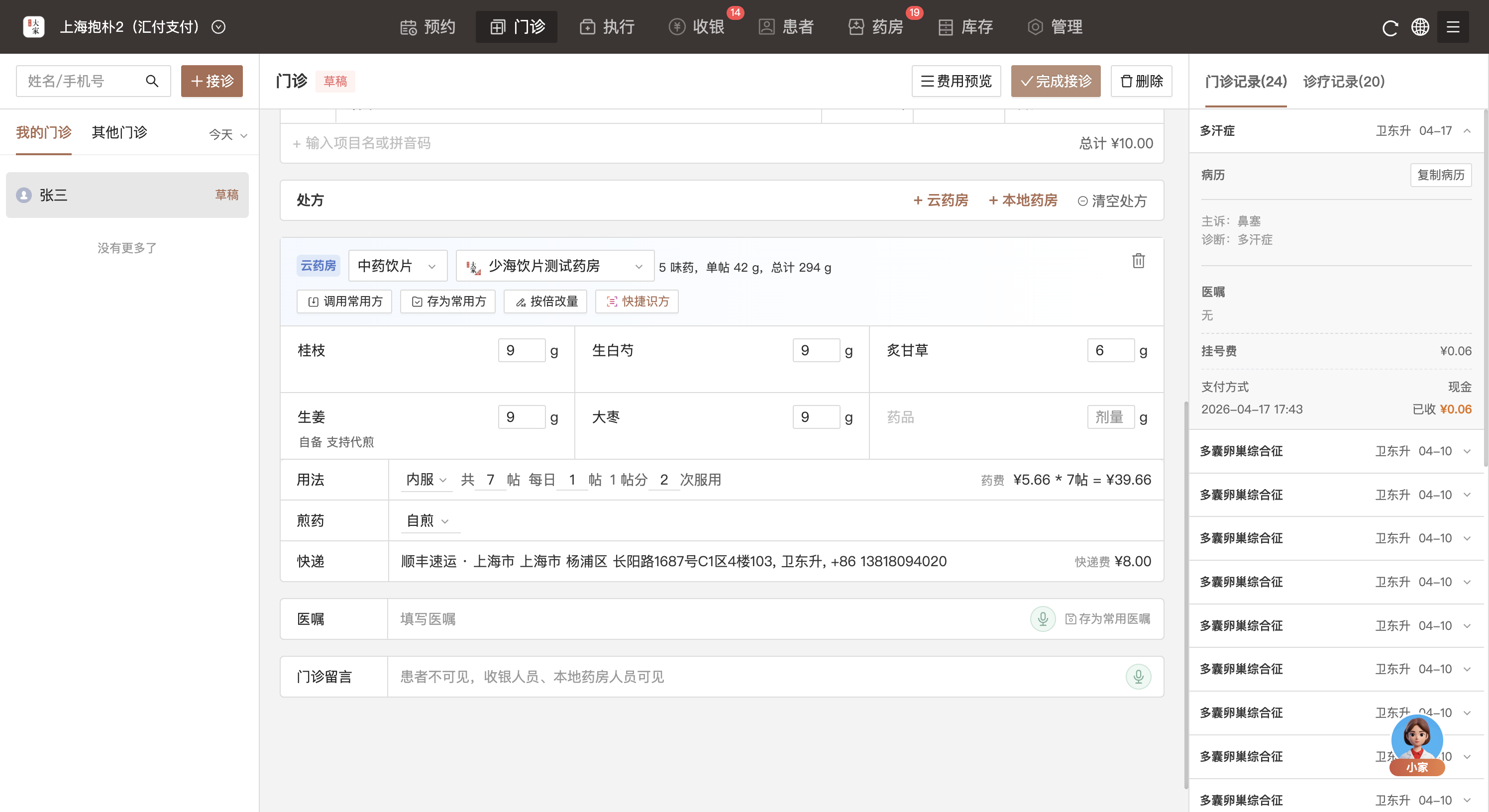 详细讲解如何在云诊所管理系统中完成接诊流程,包括快速调用患者信息、填写中医电子病历、开具中药处方以及设置快递寄药,提升门诊接诊效率。