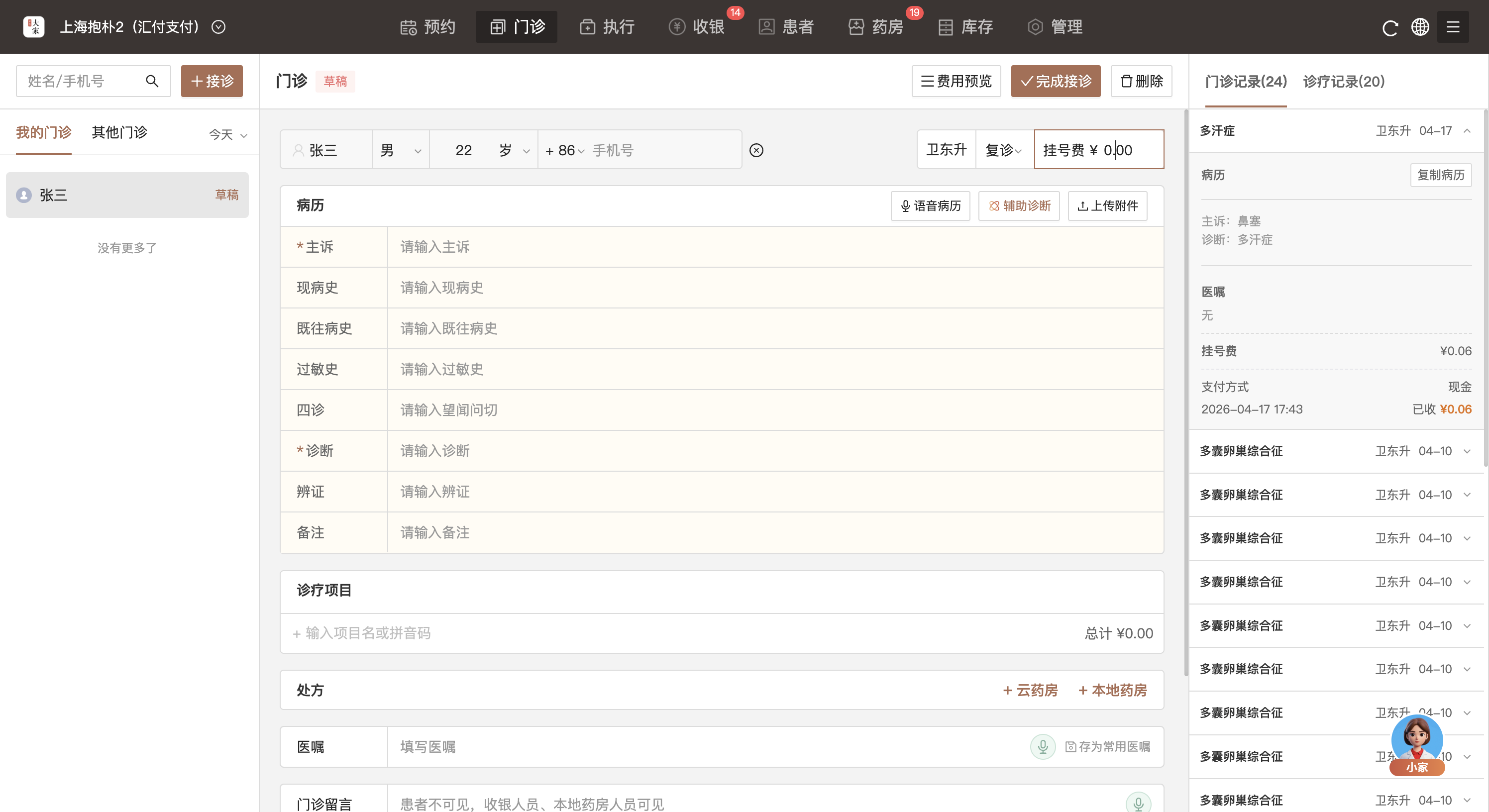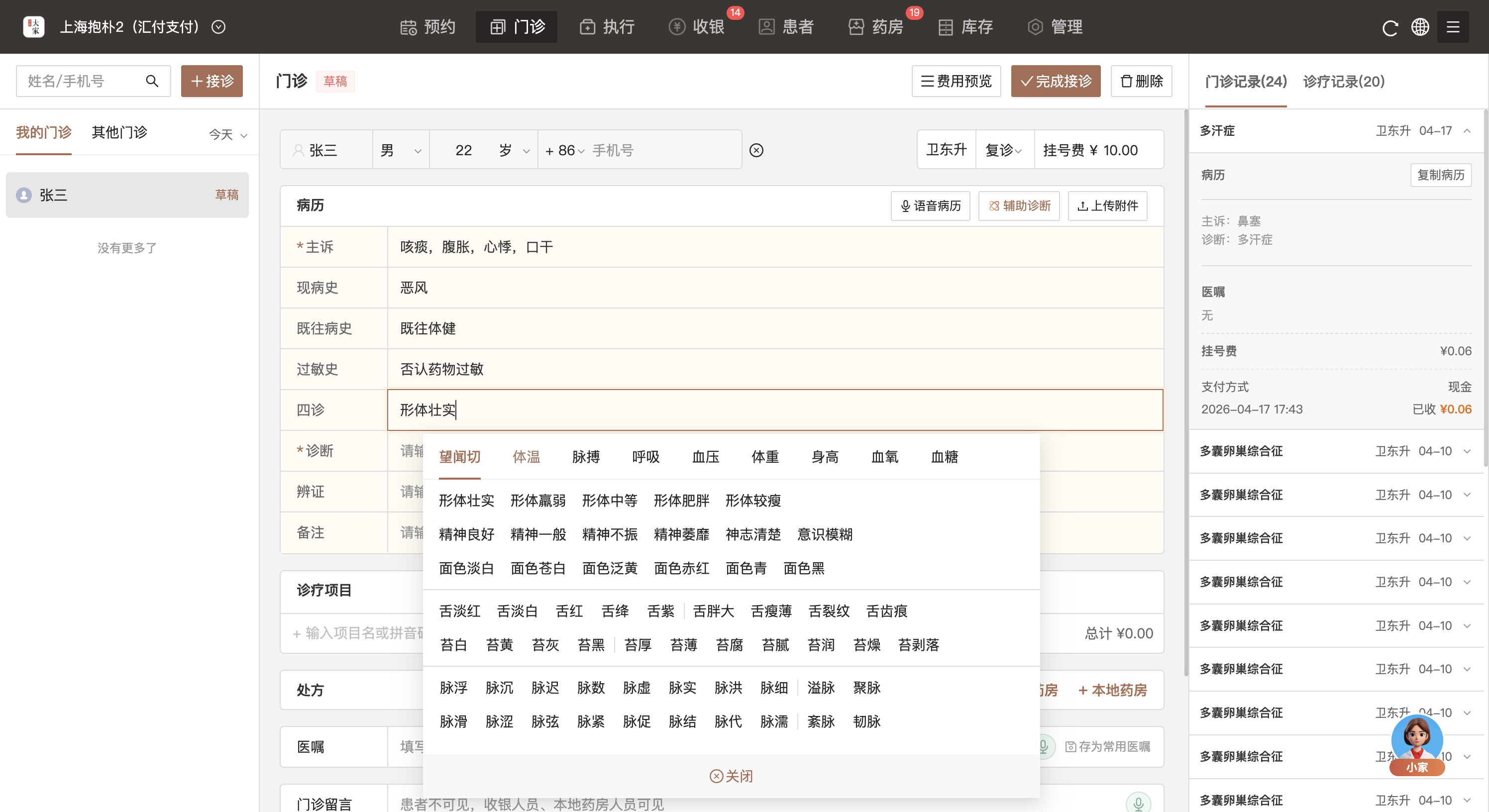 本指南将带您了解在门诊系统中完成全流程接诊的标准操作,涵盖患者建档调出、电子病历录入(含中医四诊)、开具中药/理疗处方以及配置药房发药与邮寄服务。