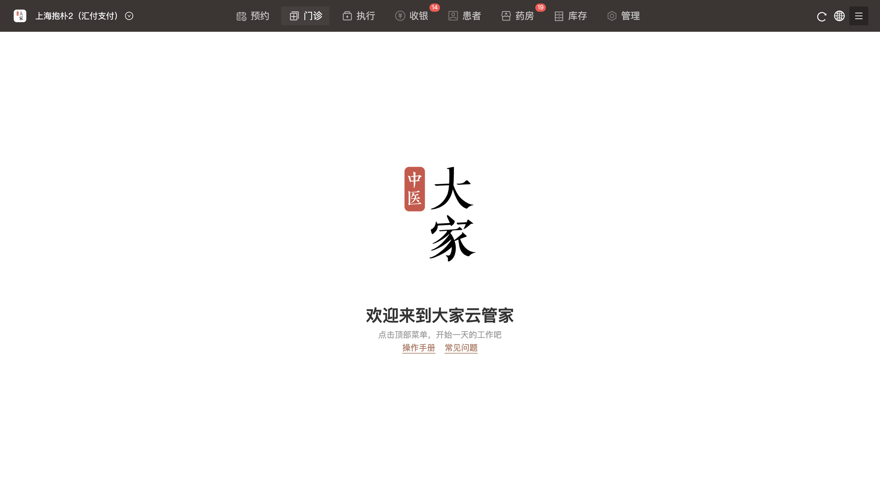 在系统顶部导航栏中,点击 门诊 进入工作台。