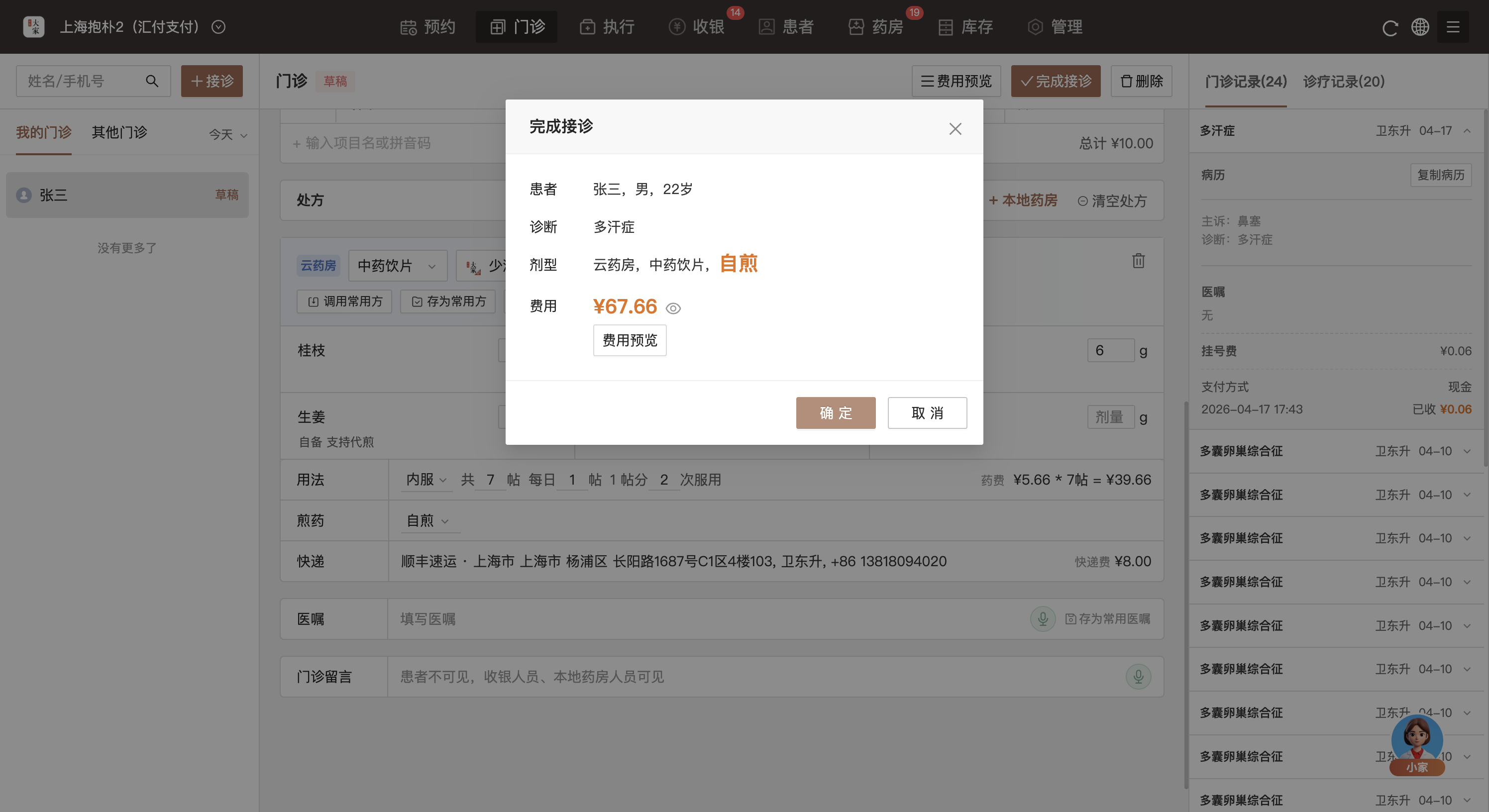 所有看诊记录与处方费用核对完毕后,点击页面右下角的 √ 完成接诊 按钮。