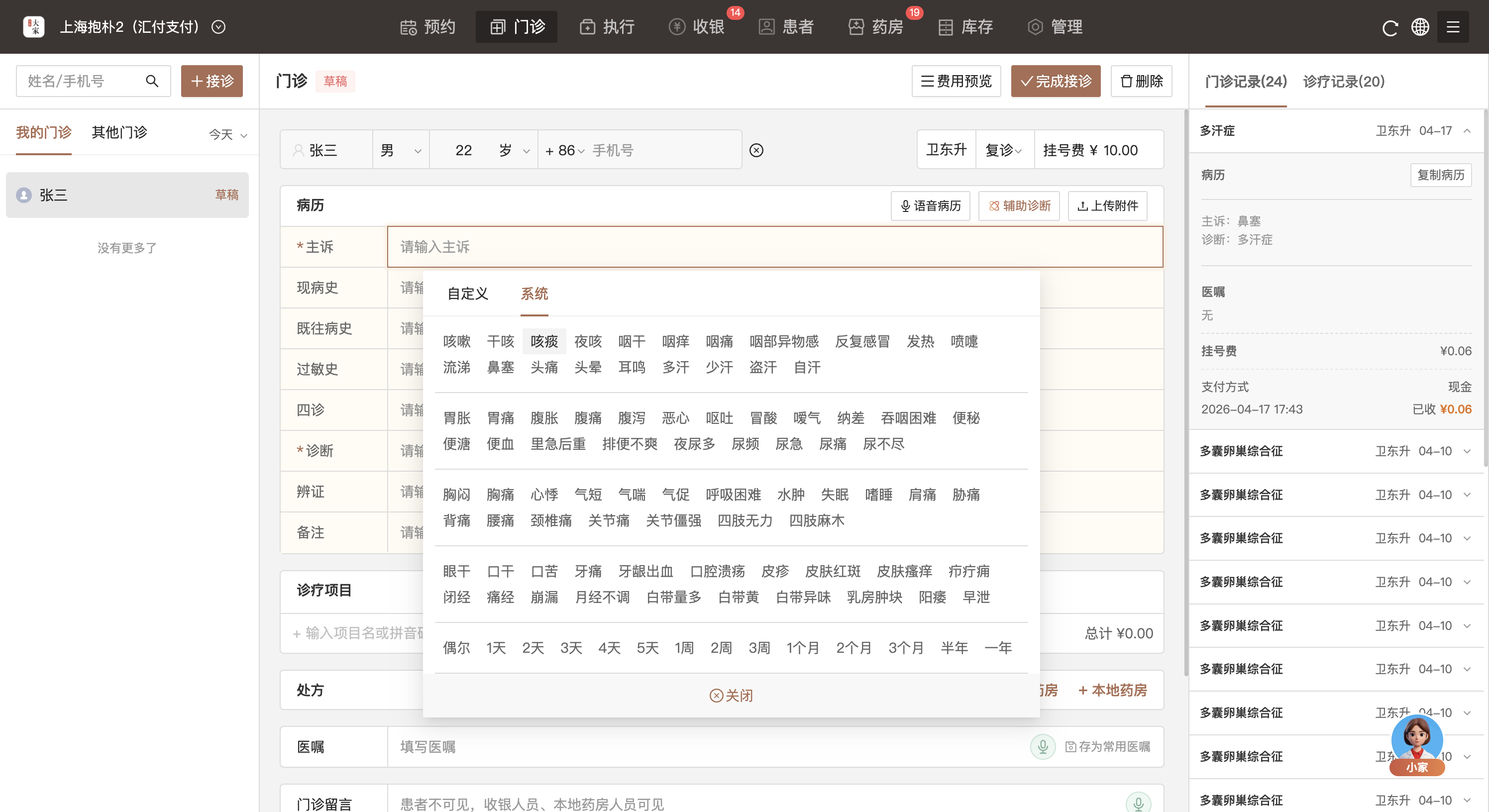 系统会弹出常见症状选择器,点击对应的症状标签(如“咳嗽”、“咽痛”等)快速填入。