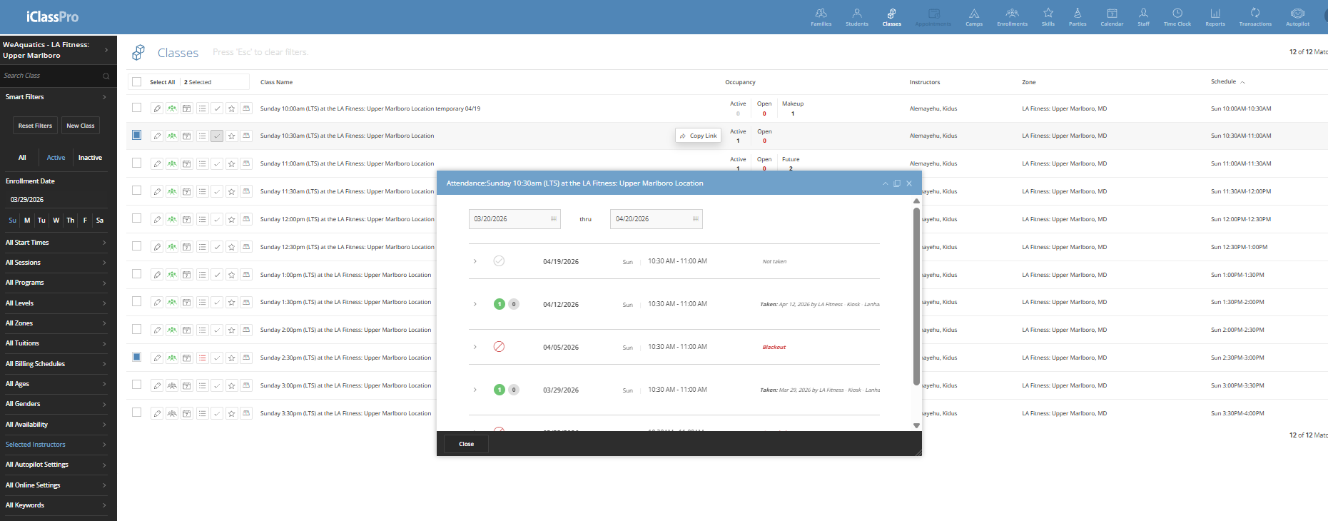 In the iClass “Classes” tab, select the appropriate filters including location, date, day, and the respective instructor and review the first and last active student enrollments for the specified date.
