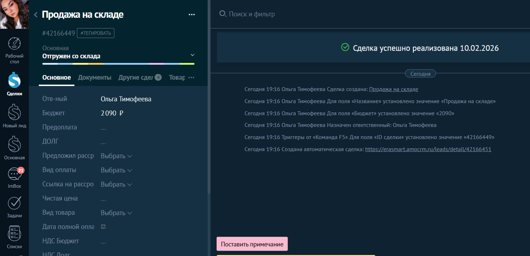 Все, ты создала новую сделку. Теперь ты переходишь в нее.