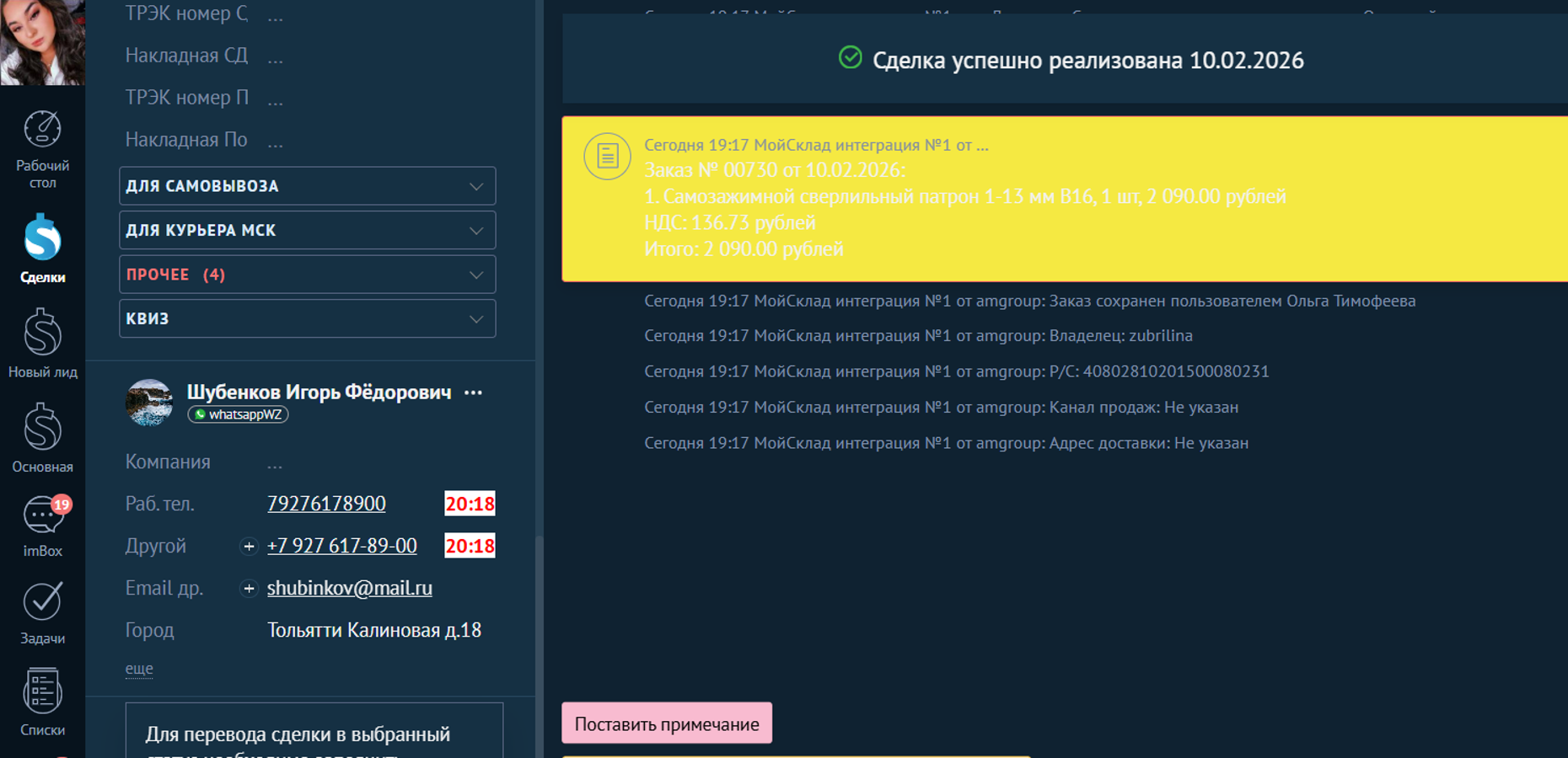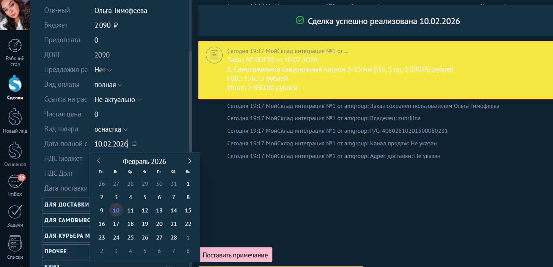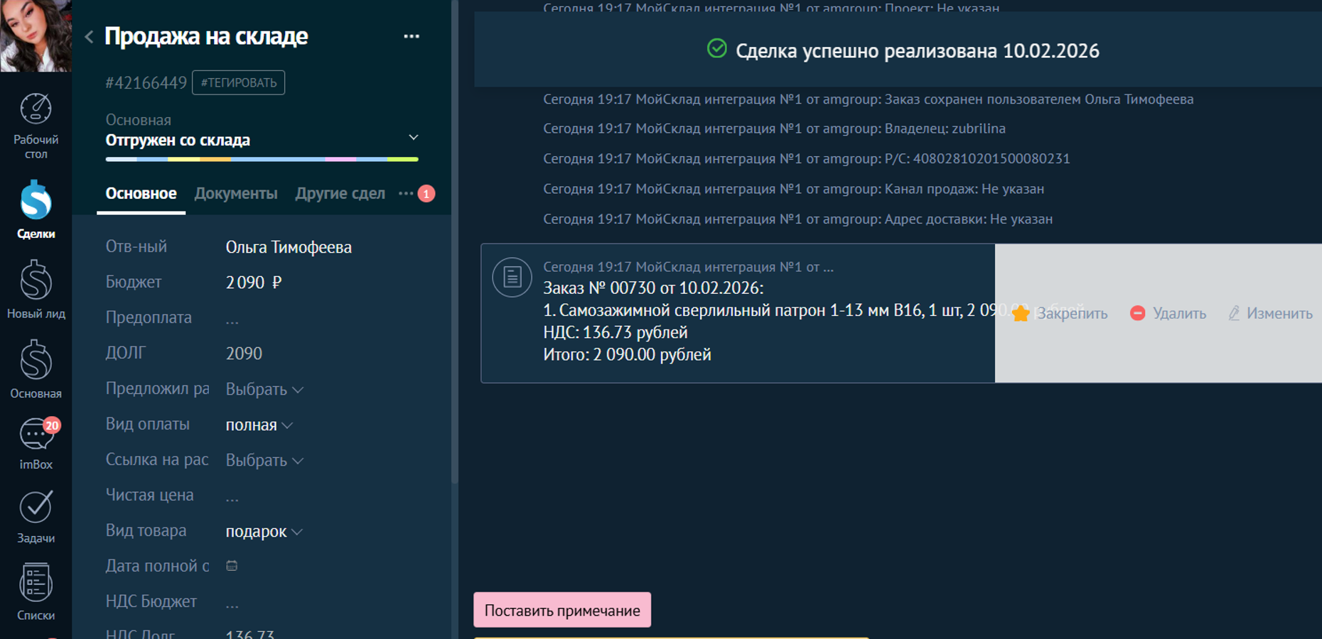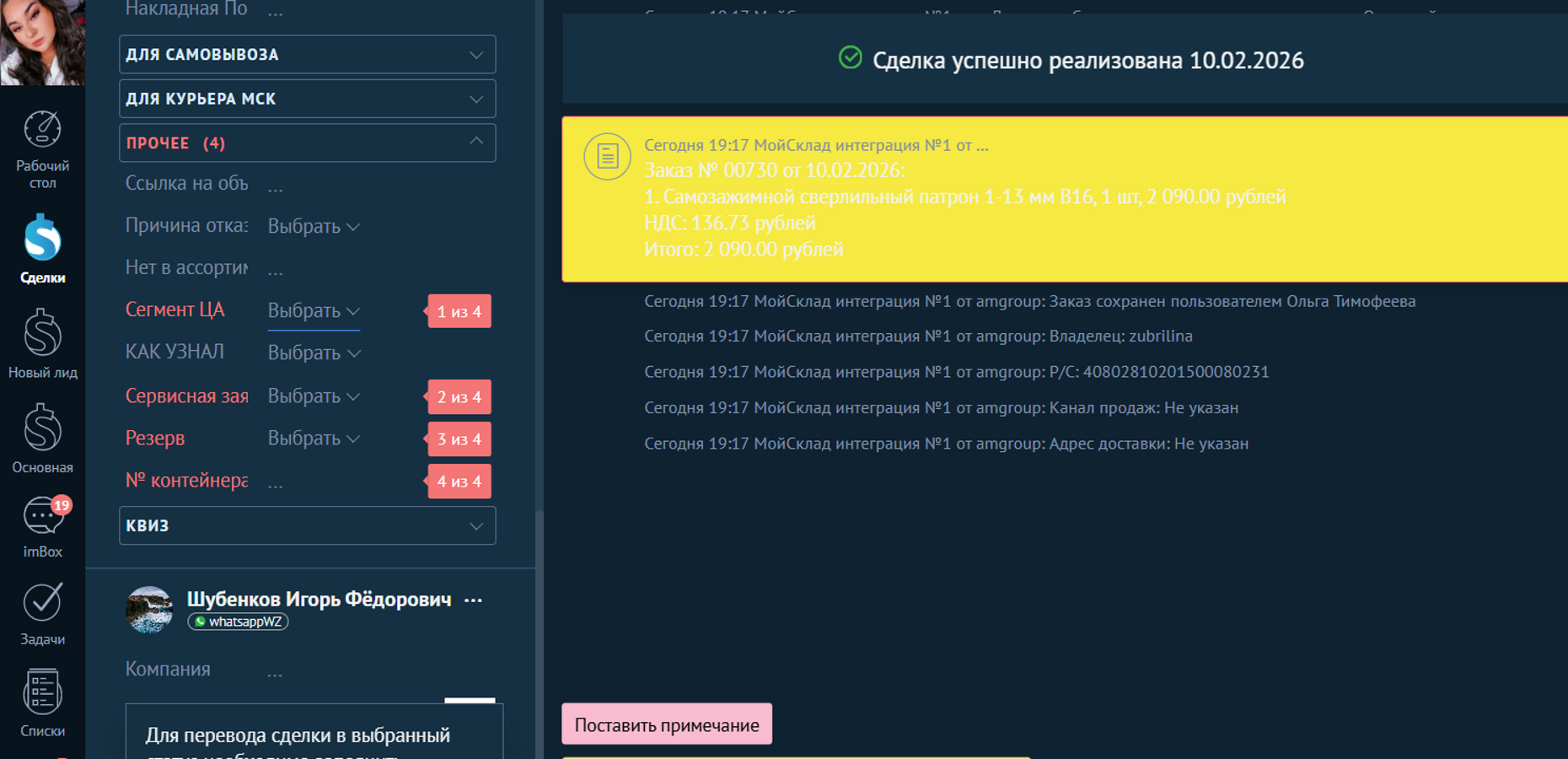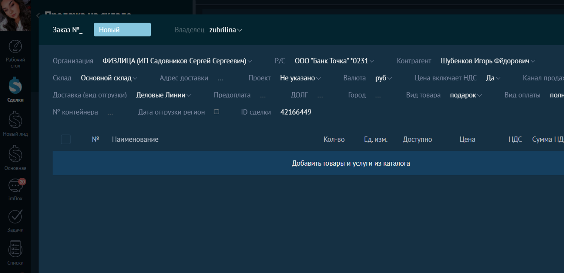 Узнайте, как правильно оформить сделку, создать заказ, добавить товары и услуги, указать оплату и завершить сделку в CRM. Подробная инструкция для работы с основной воронкой продаж и самовывозом.