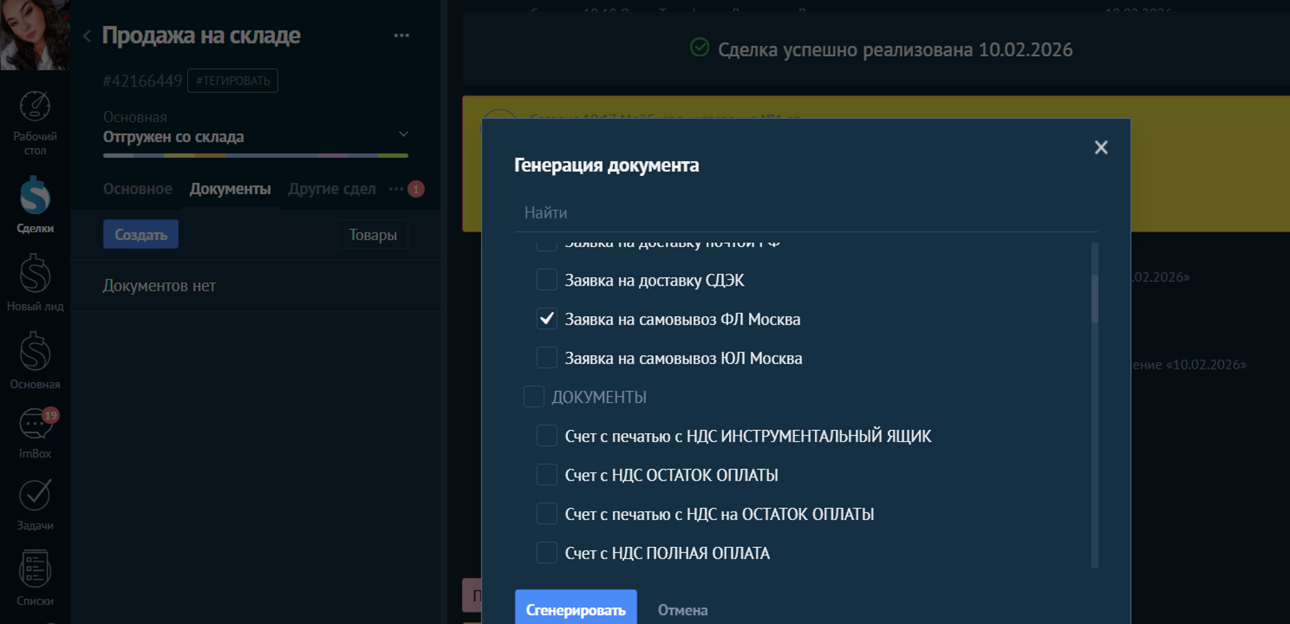 Вот у тебя как бы создалась сделка. Дальше зайди в документы.