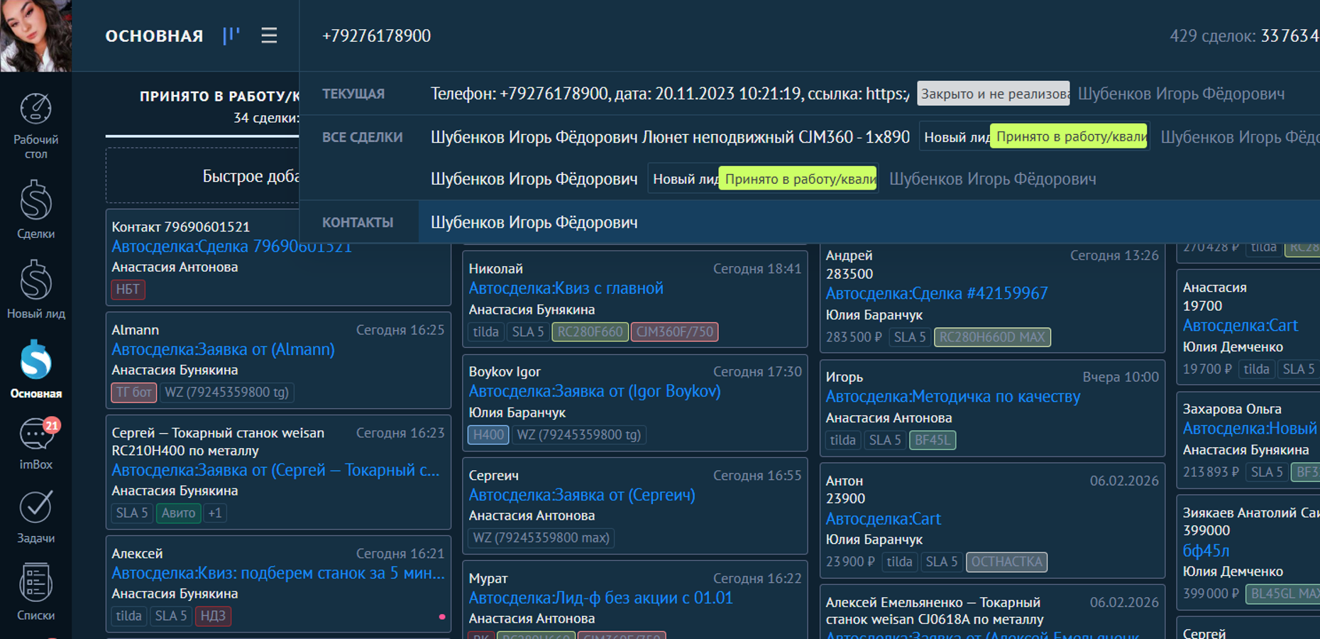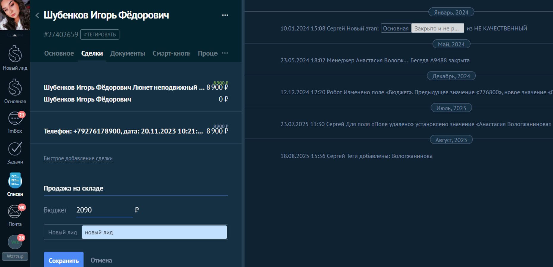 Здесь у тебя вся информация о нем, все, что заполнено. Ты заходишь в раздел «Сделки».