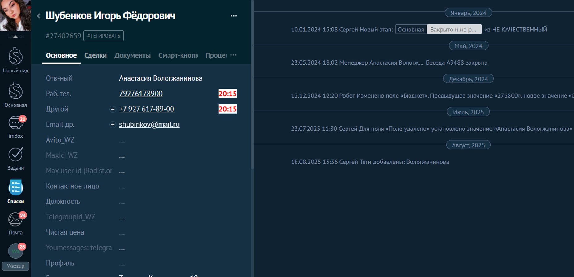 Вот поиск: отображаются все сделки по нему, текущие в воронке, а также контакты. Ты нажимаешь на контакт, переходишь к Шабенкову Игорю Федоровичу.