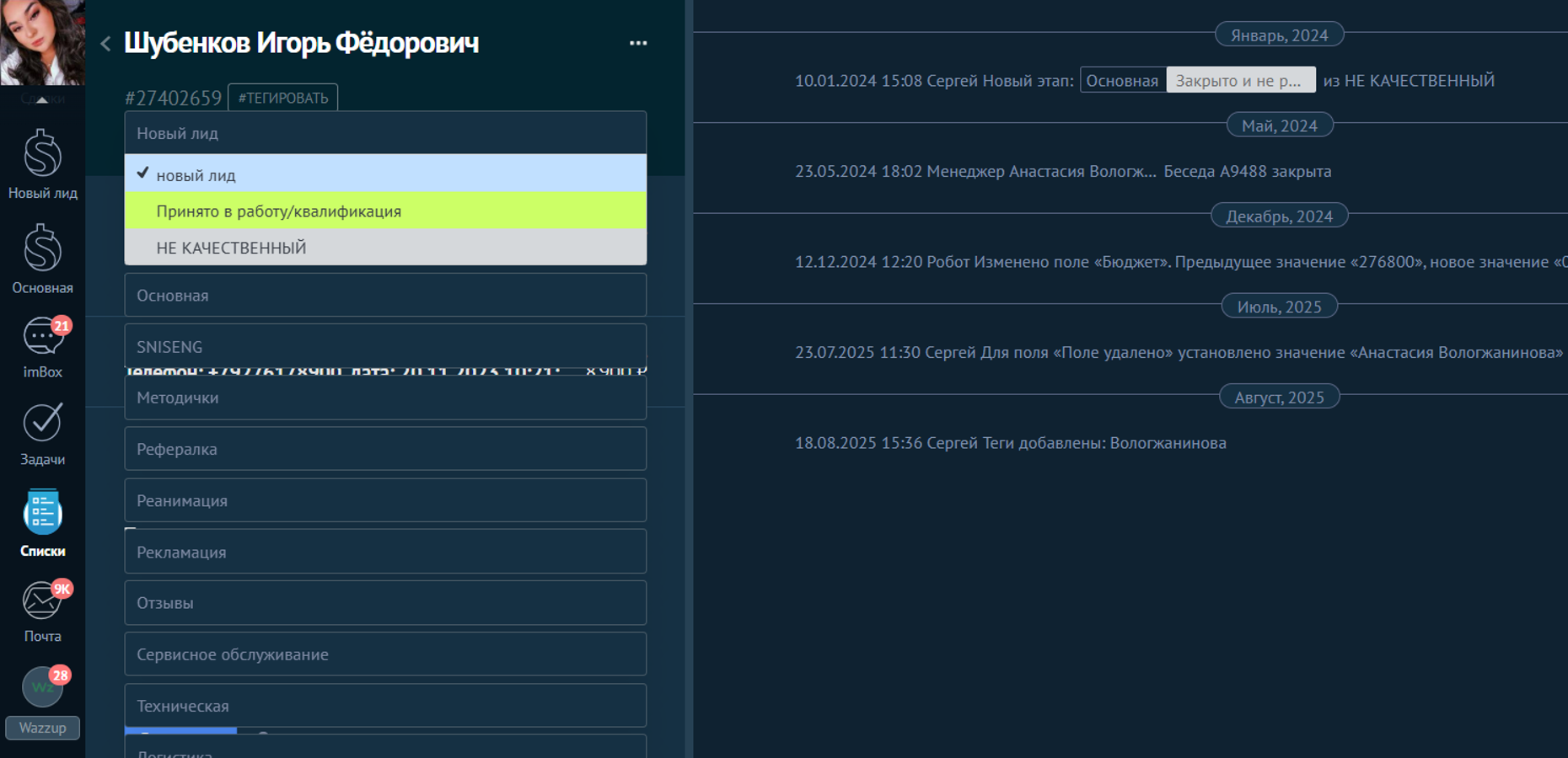 Так, вот основная воронка, в которой мы работаем и в которой ты будешь работать. Когда ты продал клиенту, у тебя есть его номер телефона, верно? То есть ты либо берёшь его у него, либо он уже есть у тебя из заявки, например, на самовывоз. Вот его номер телефона. Вводишь его сюда.