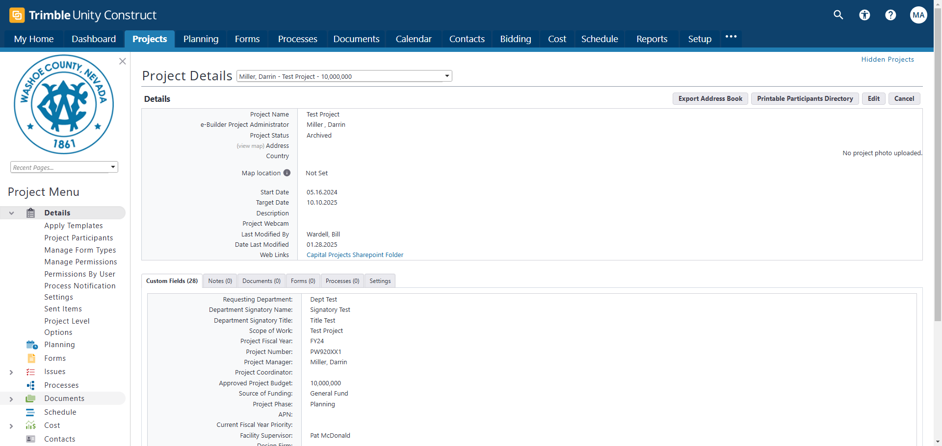 When you access the test project, you'll see high-level information like the project's name, status, start date, and target date. This information is usually entered when the project is created. At the bottom, you'll find the project attributes, including the requesting department, scope of work, fiscal year, project manager, and more. These attributes are also typically added when the project is created in eBuilder.