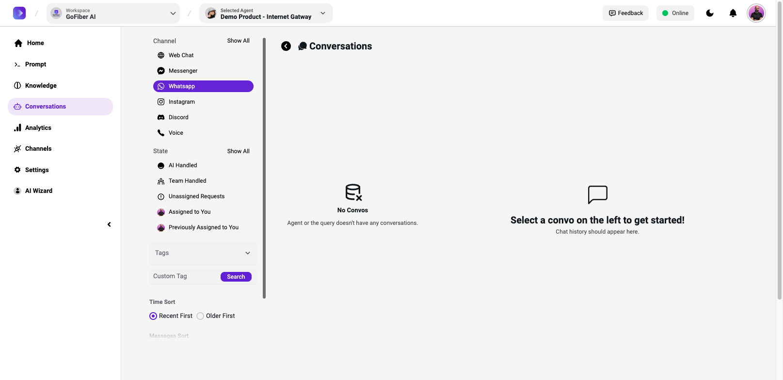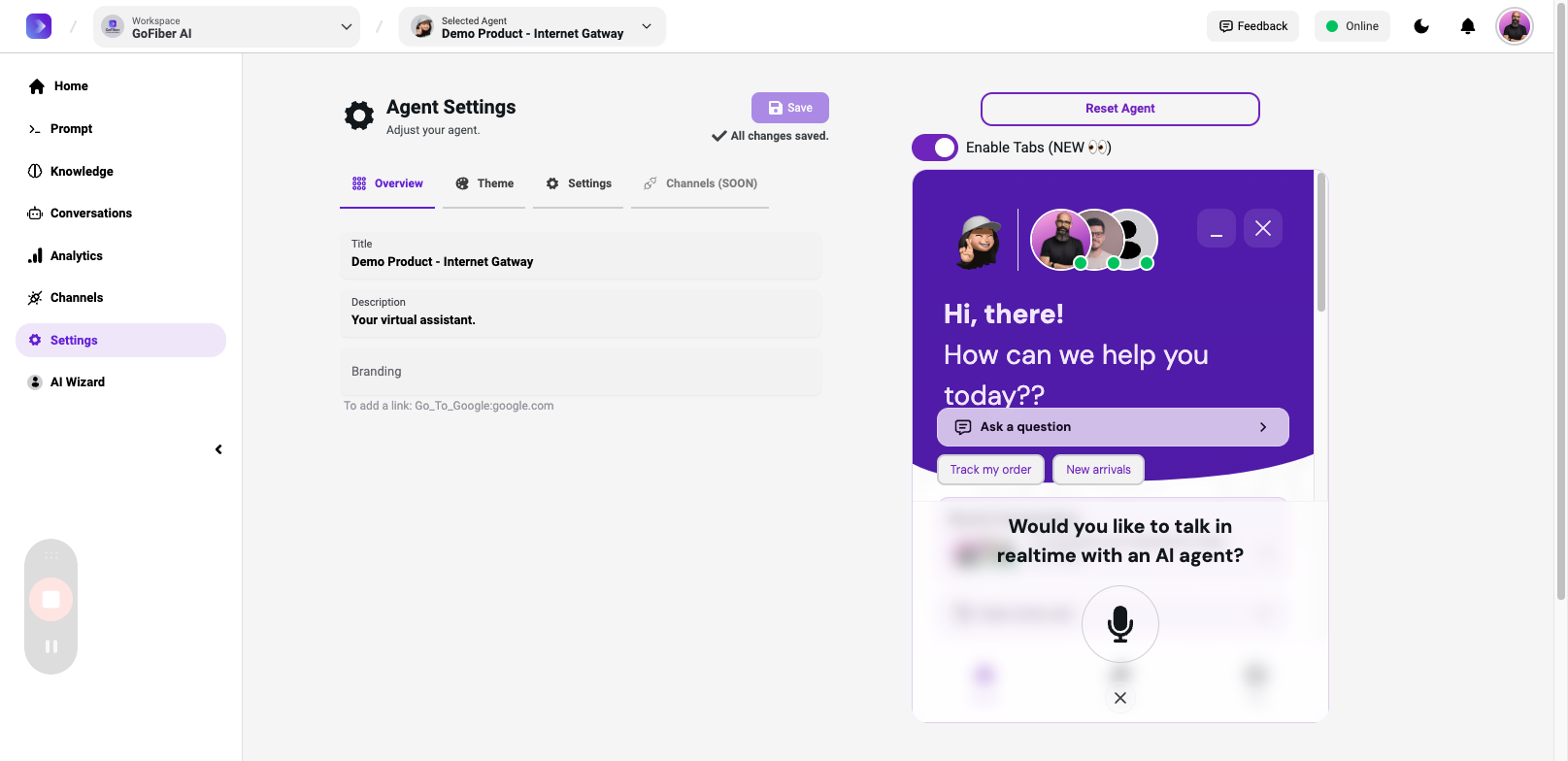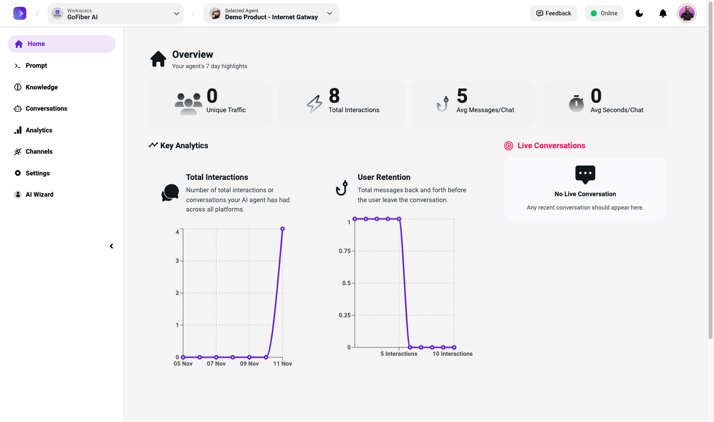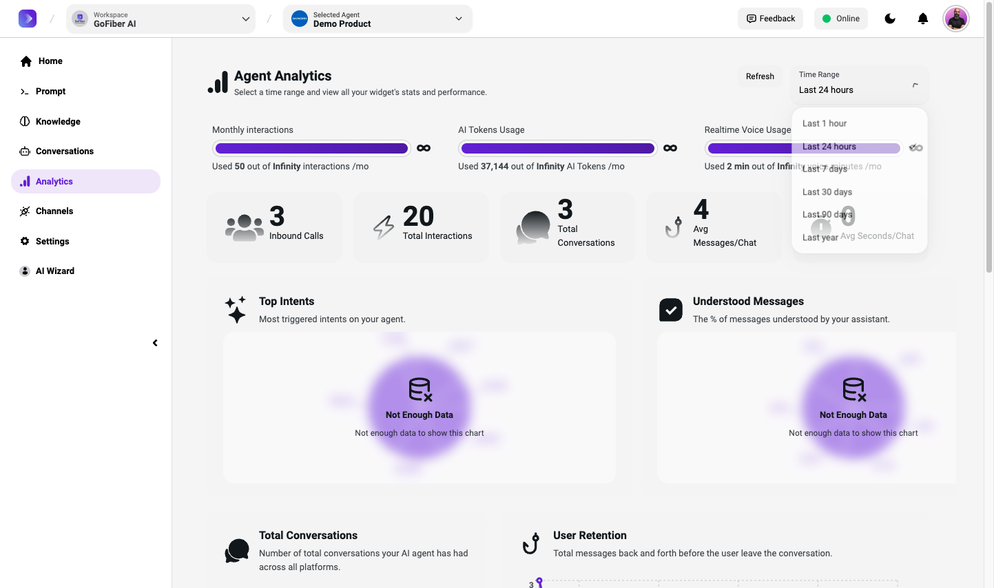 Explore the GoFiber AI system's management panel, analytics, and communication channels. Learn how to manage interactions and settings effectively.