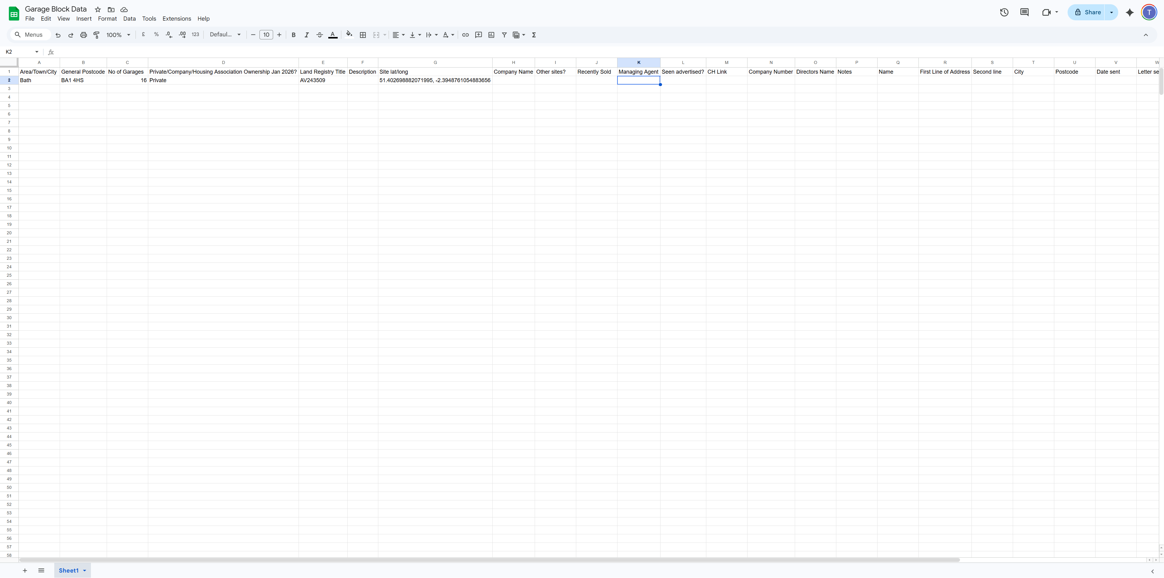 This guide explains how to identify blocks of garages, verify their ownership, and compile essential data for potential acquisition. You will use LandWorth to scout locations, PropertyData to check ownership details, Google Maps for coordinates and visual inspections, and Google Sheets to log your leads.