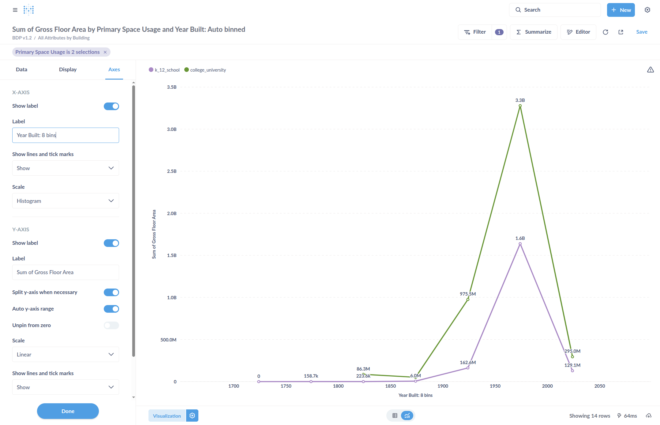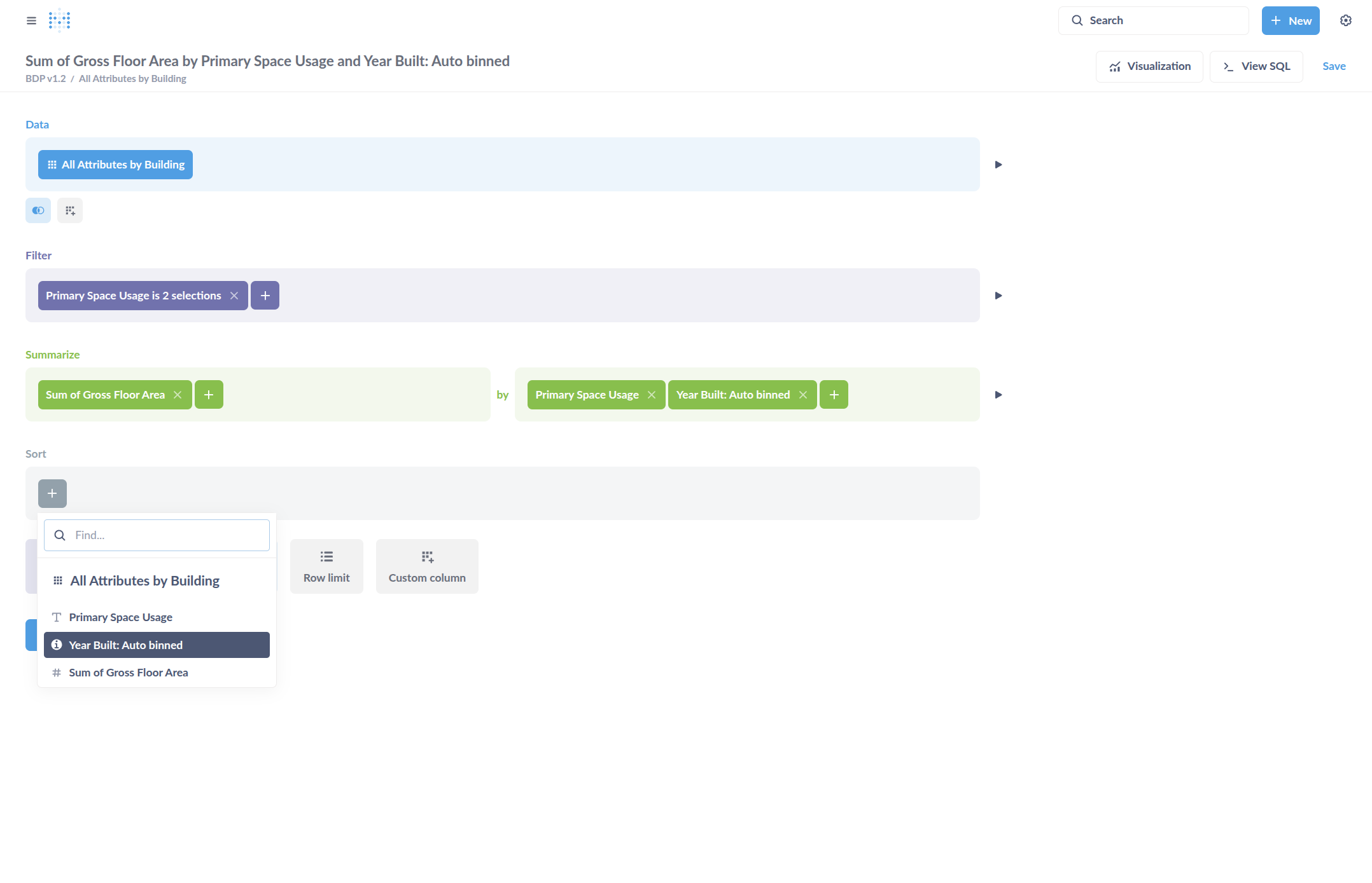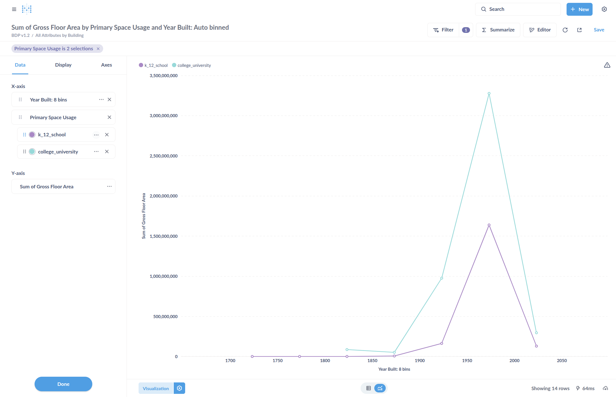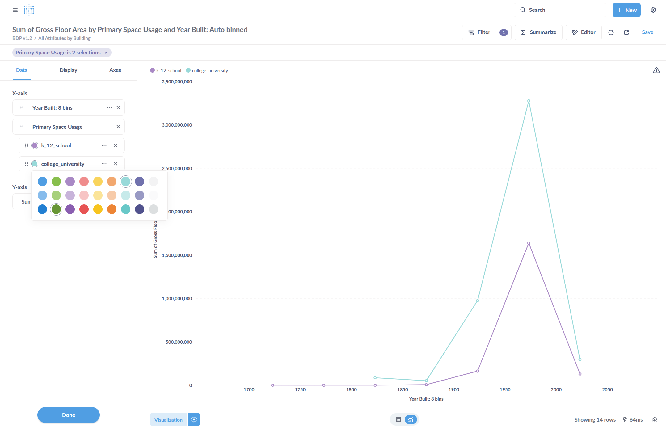 Here, we are designing a chart to compare two types of buildings by their gross floor area, based on the year they were built. The idea is to set the X axis as Year Built and the Y axis as total Gross Floor Area. We will use color coding to represent the type of Primary Space Usage. It helps to sort this by Year Built to help with charting the X axis in order from earliest to most recent.
