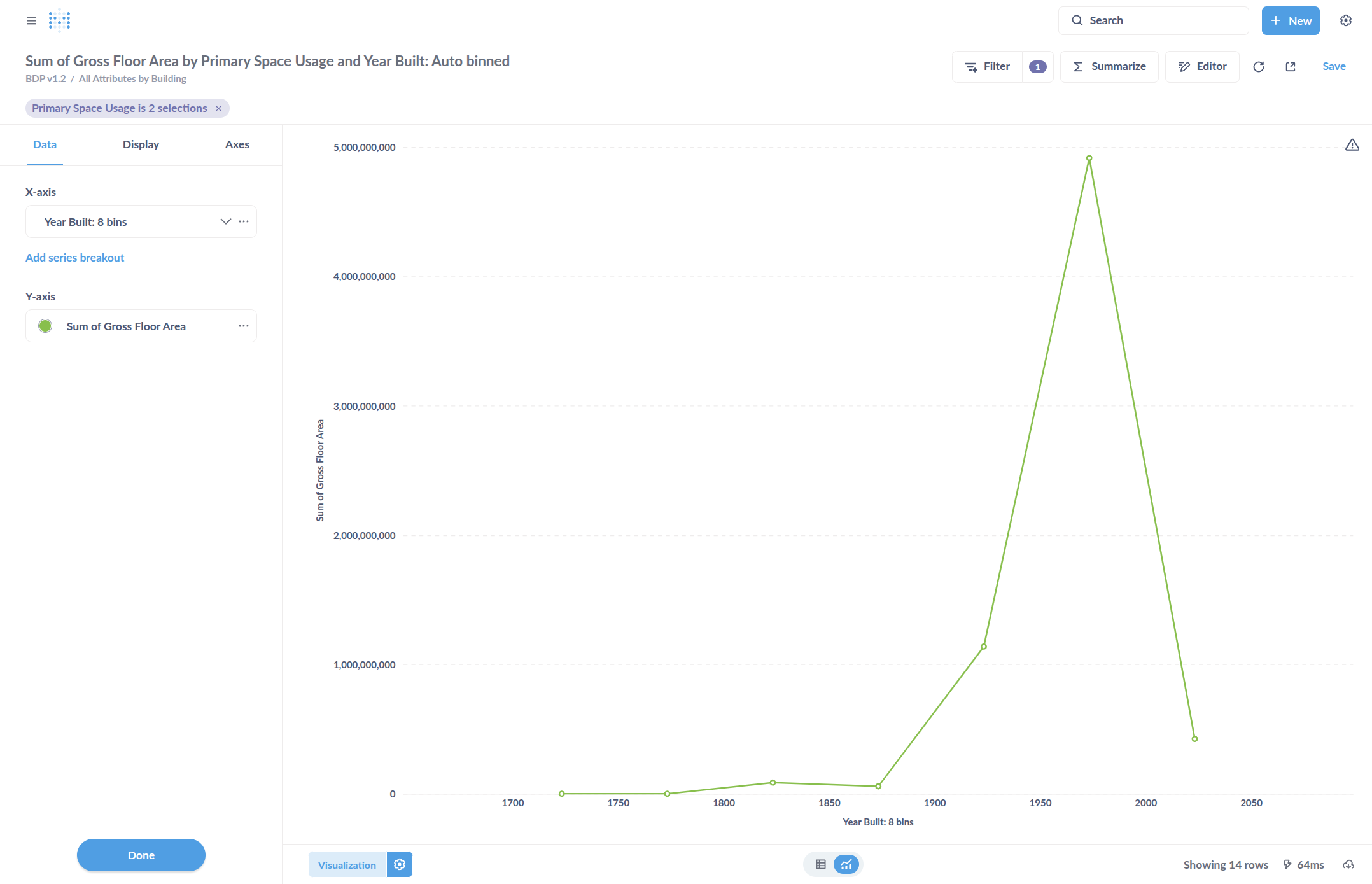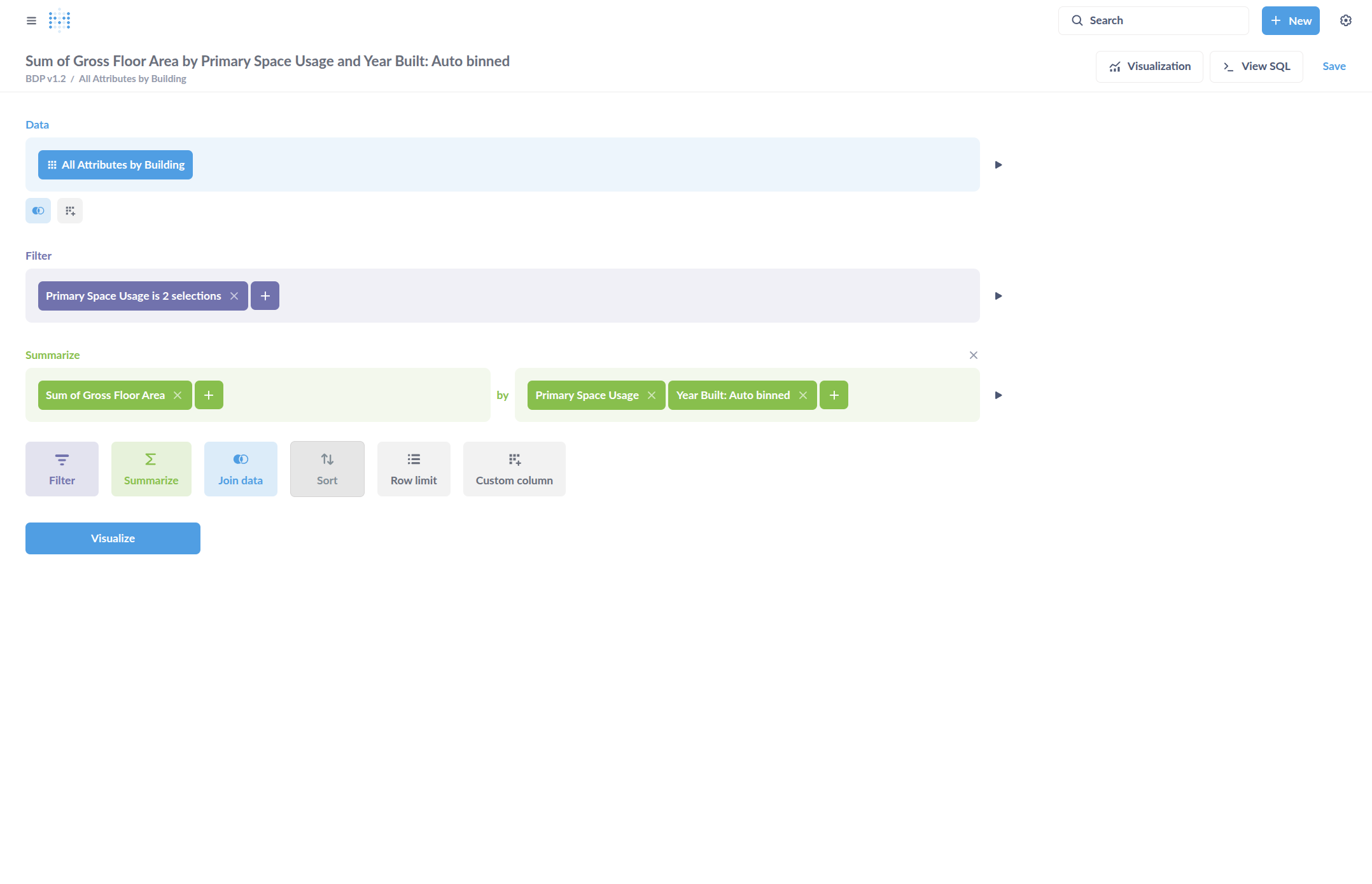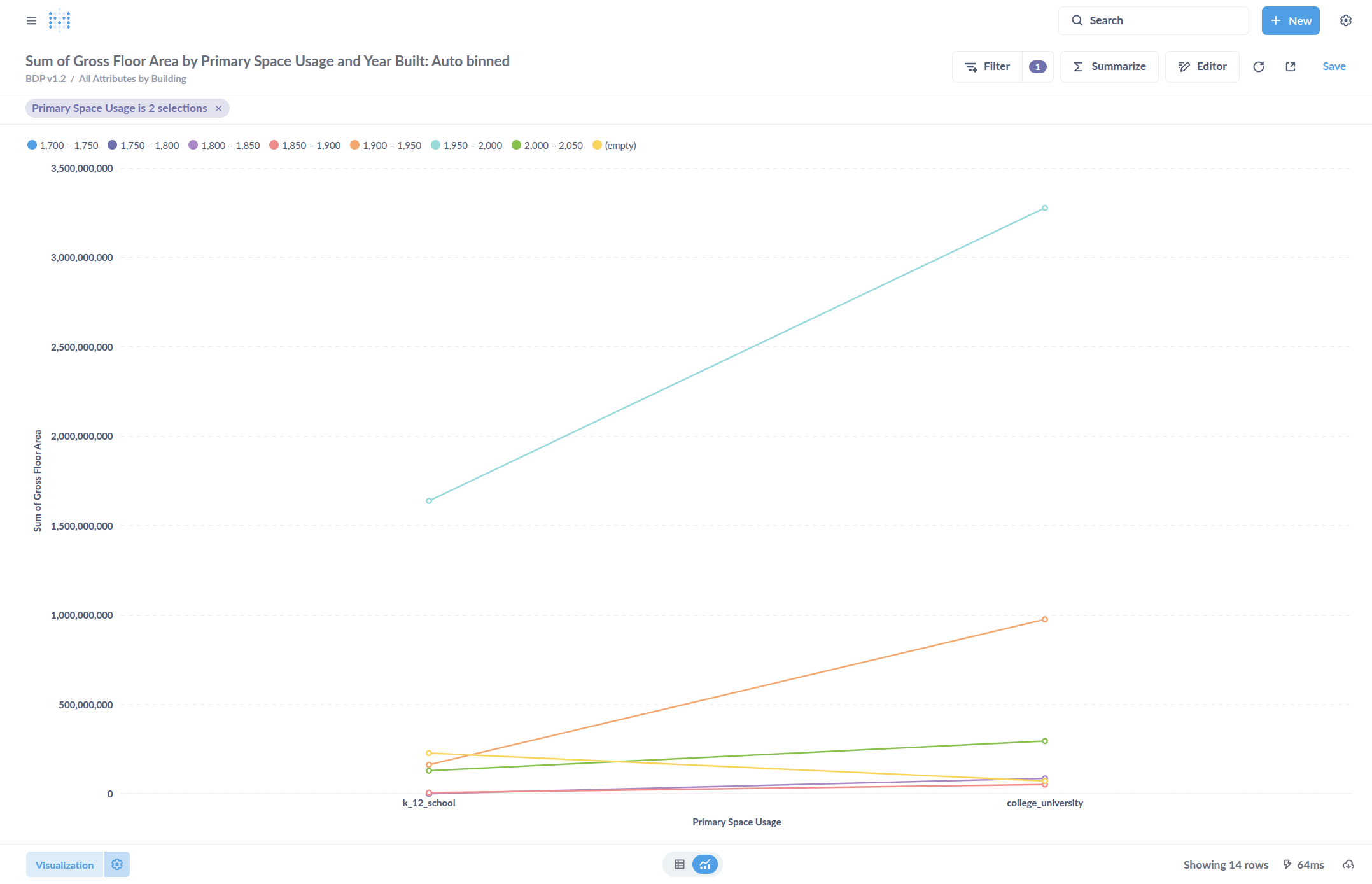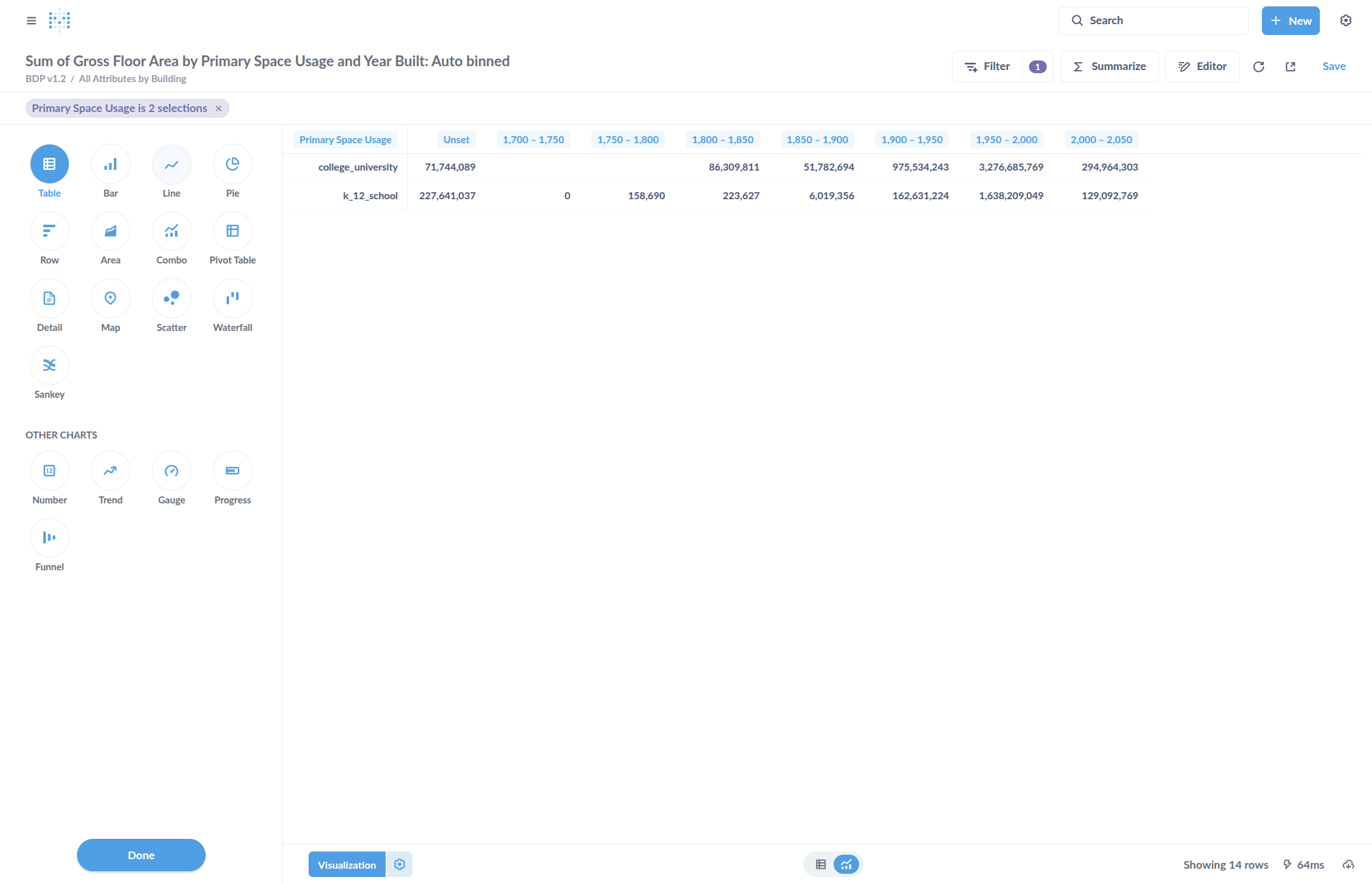 Here, we are designing a chart to compare two types of buildings by their gross floor area, based on the year they were built. The idea is to set the X axis as Year Built and the Y axis as total Gross Floor Area. We will use color coding to represent the type of Primary Space Usage. It helps to sort this by Year Built to help with charting the X axis in order from earliest to most recent.