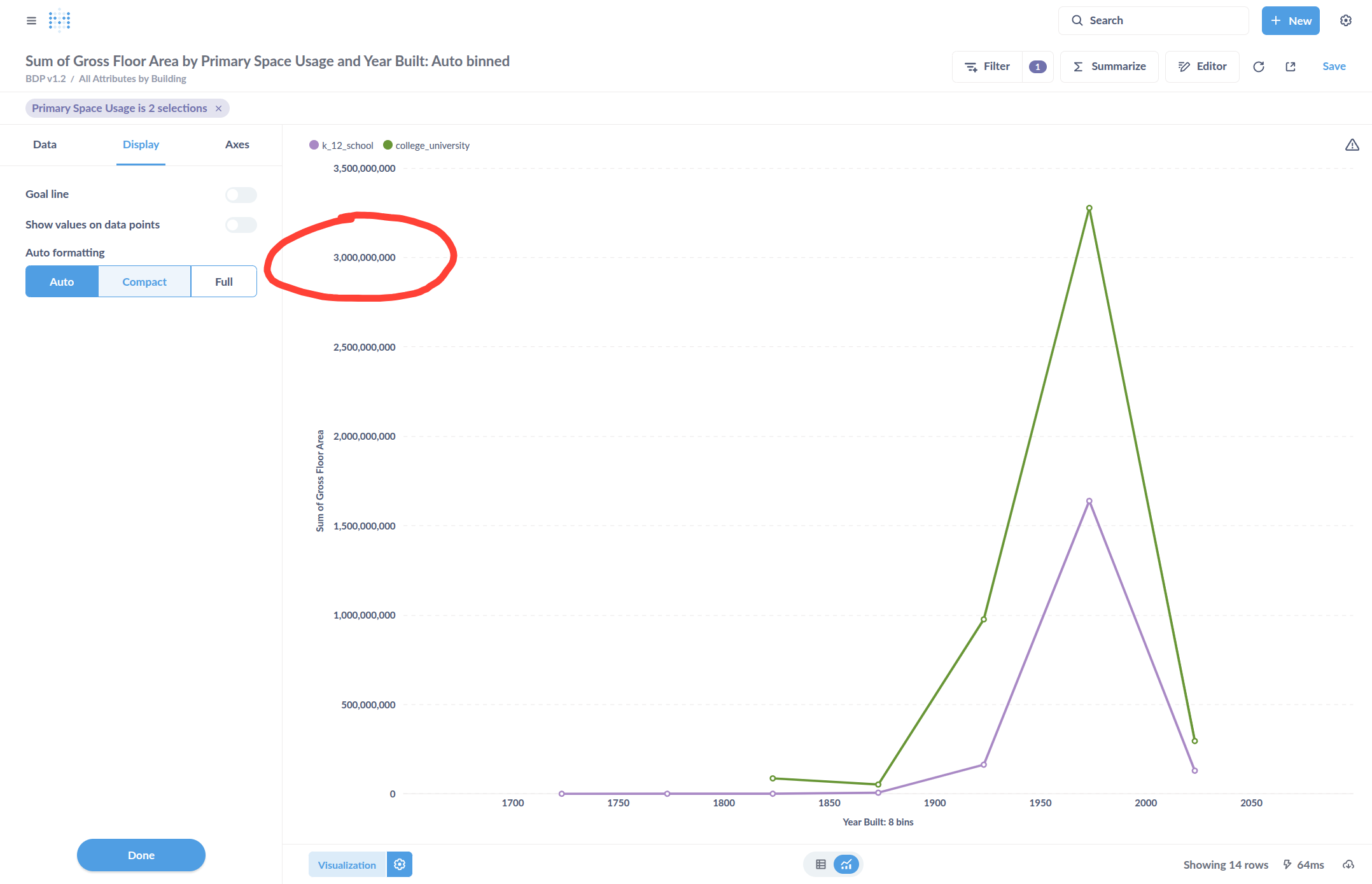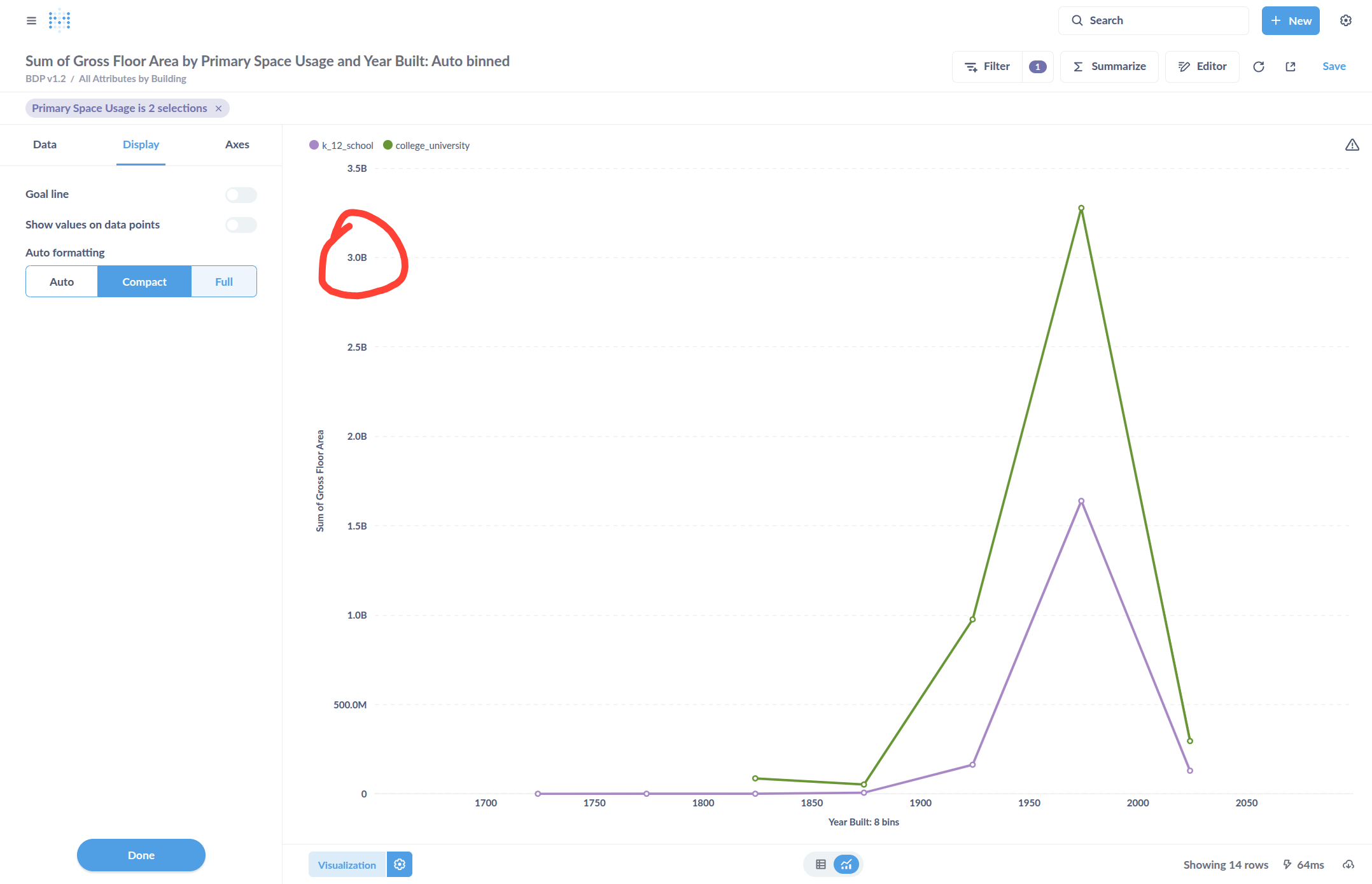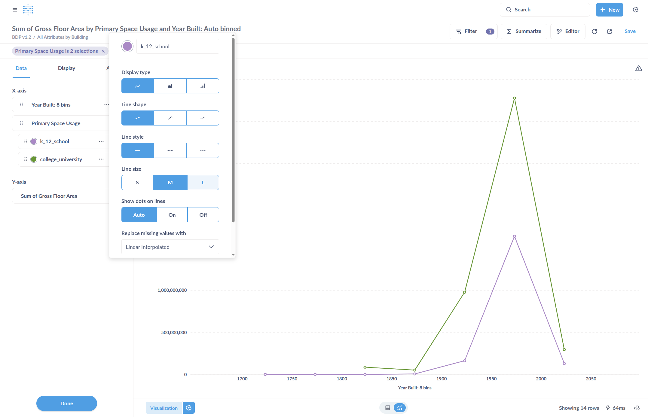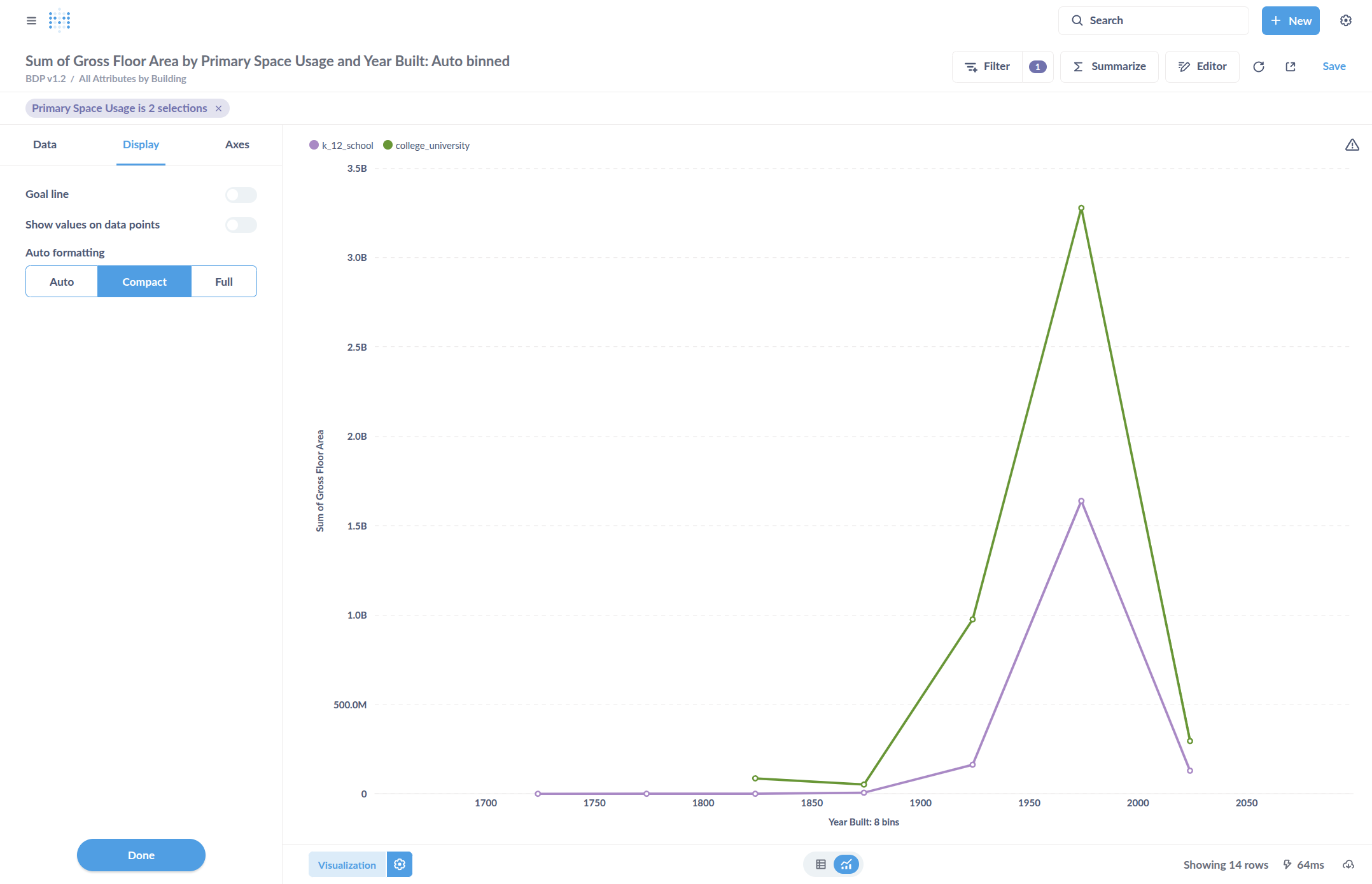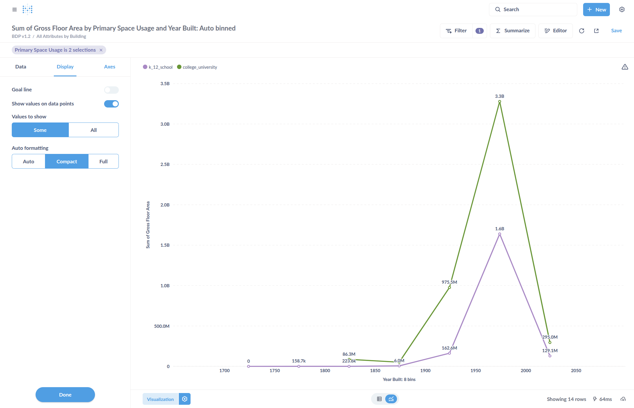 Here, we are designing a chart to compare two types of buildings by their gross floor area, based on the year they were built. The idea is to set the X axis as Year Built and the Y axis as total Gross Floor Area. We will use color coding to represent the type of Primary Space Usage. It helps to sort this by Year Built to help with charting the X axis in order from earliest to most recent.