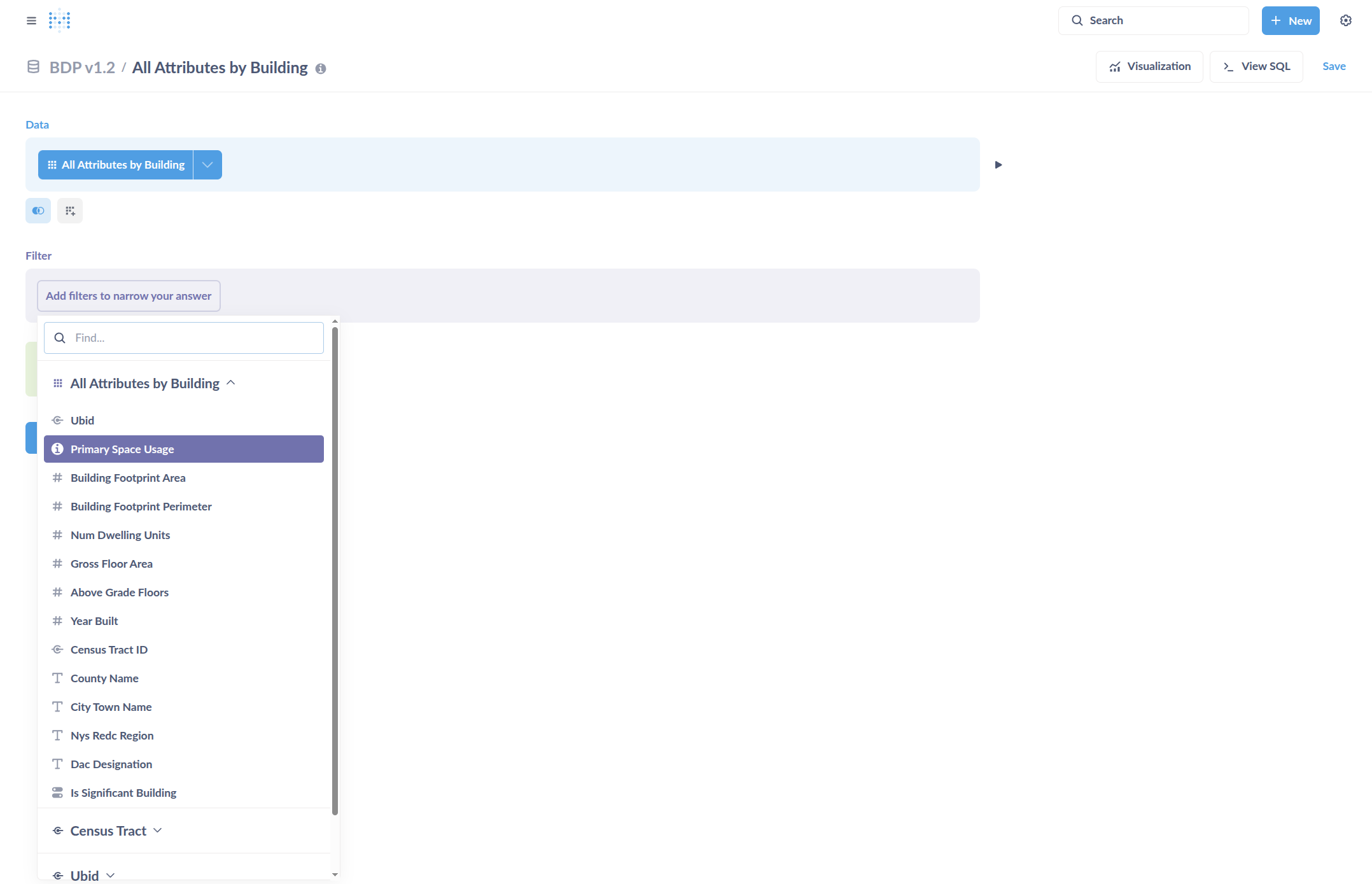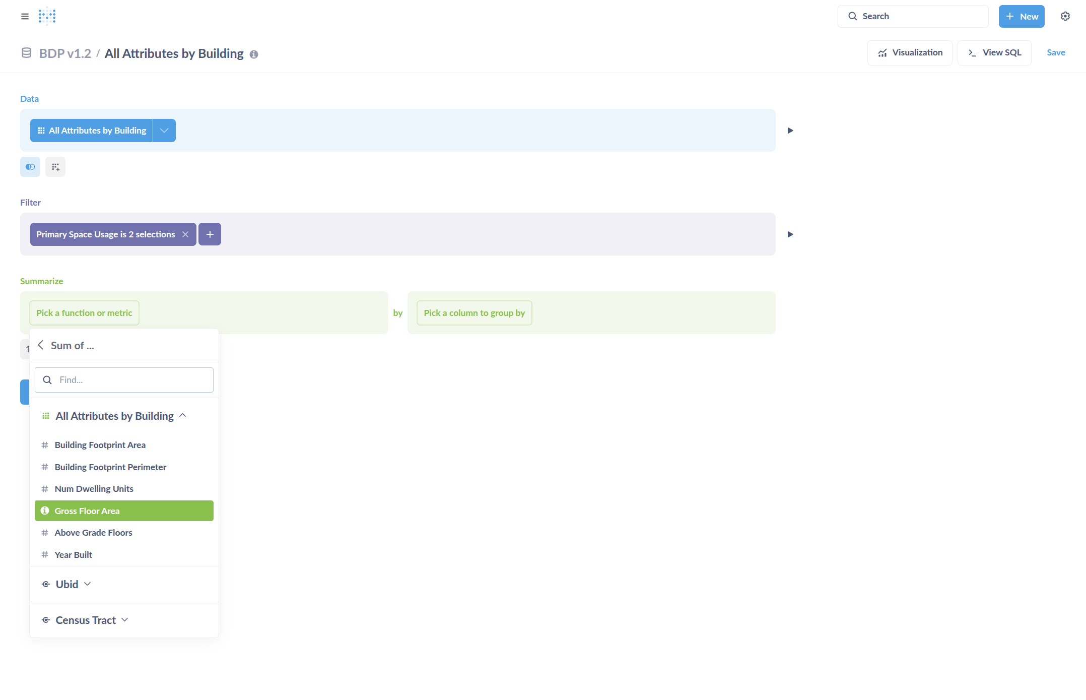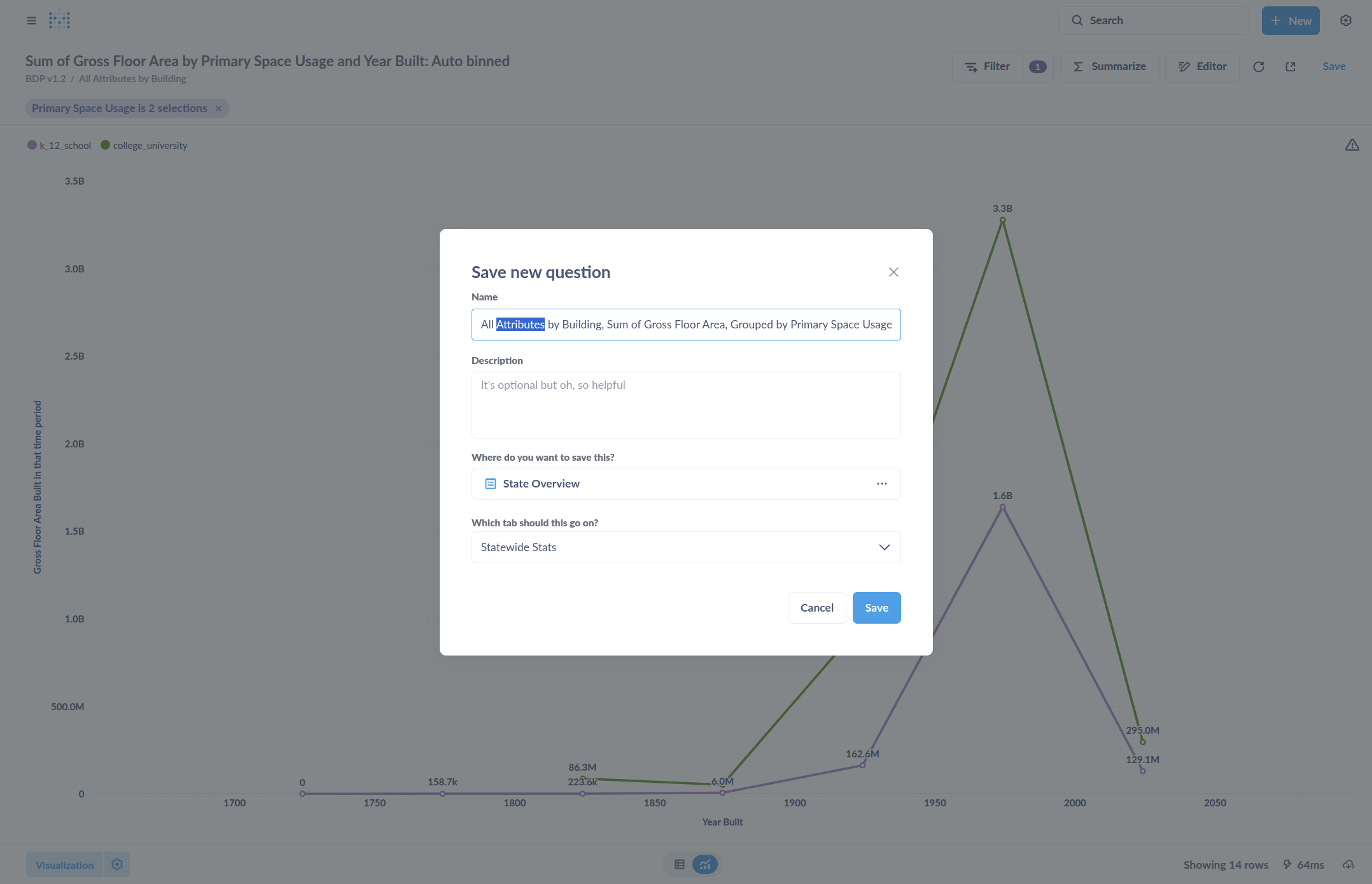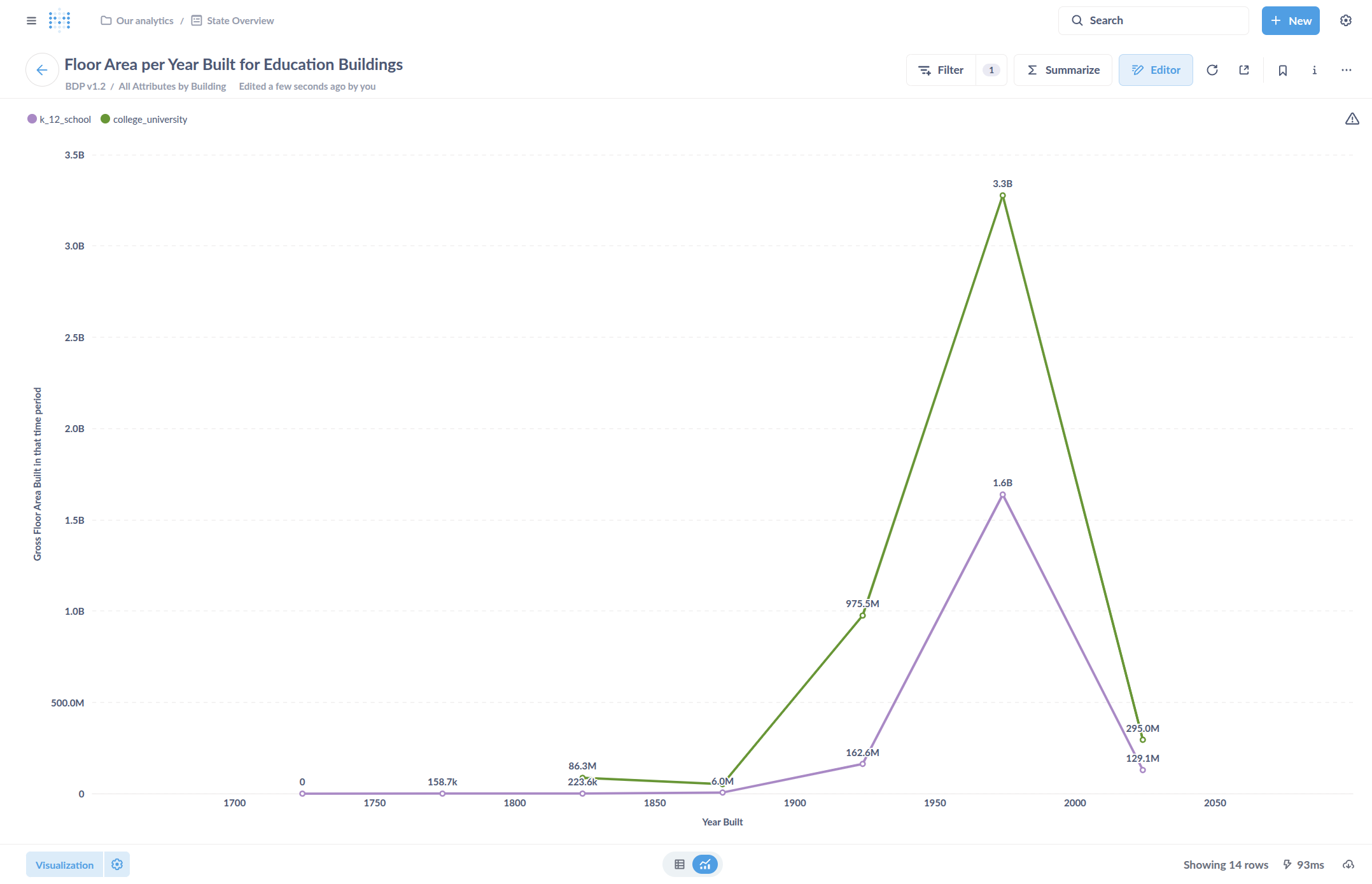 Here, we are designing a chart to compare two types of buildings by their gross floor area, based on the year they were built. The idea is to set the X axis as Year Built and the Y axis as total Gross Floor Area. We will use color coding to represent the type of Primary Space Usage. It helps to sort this by Year Built to help with charting the X axis in order from earliest to most recent.