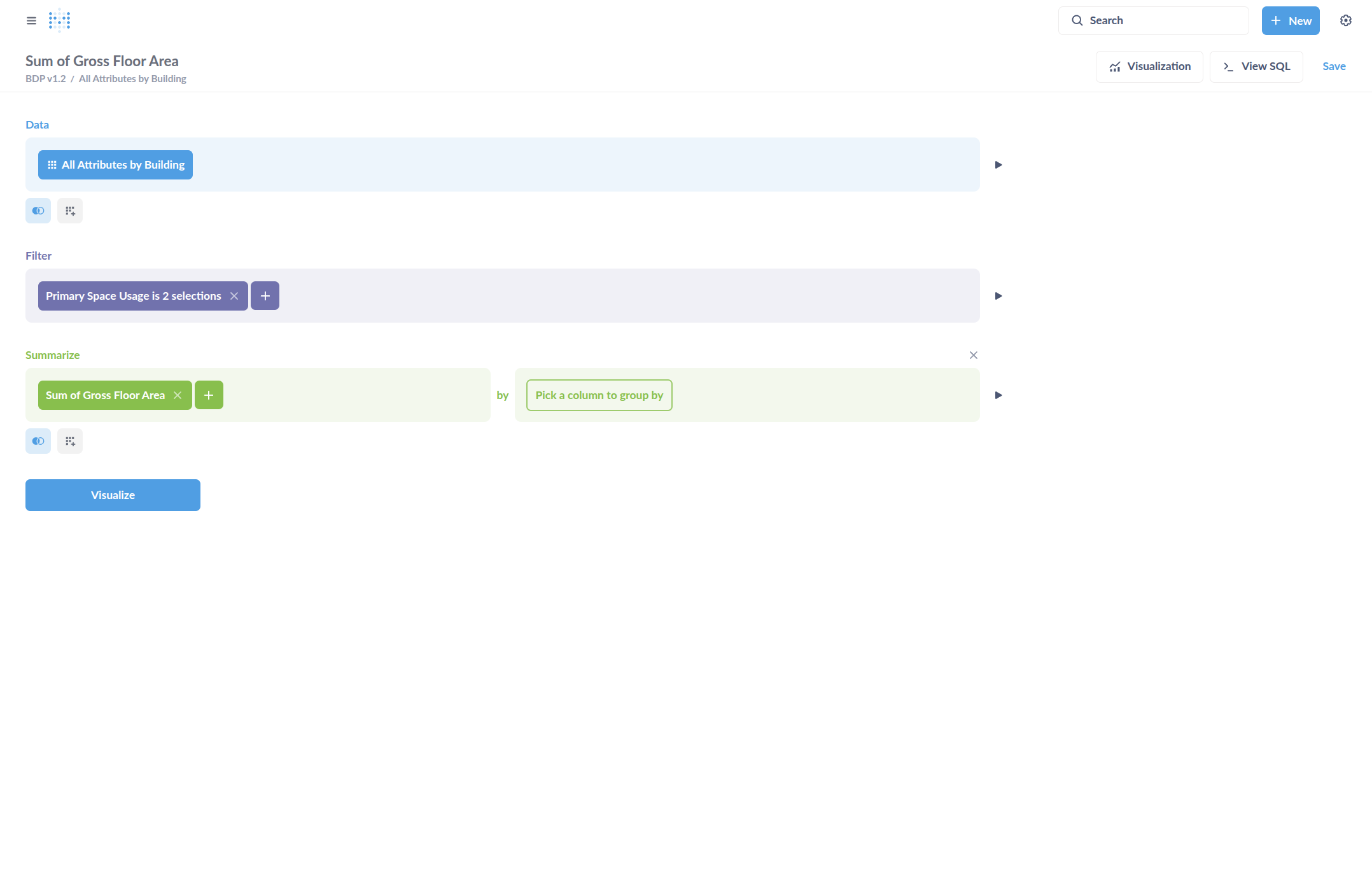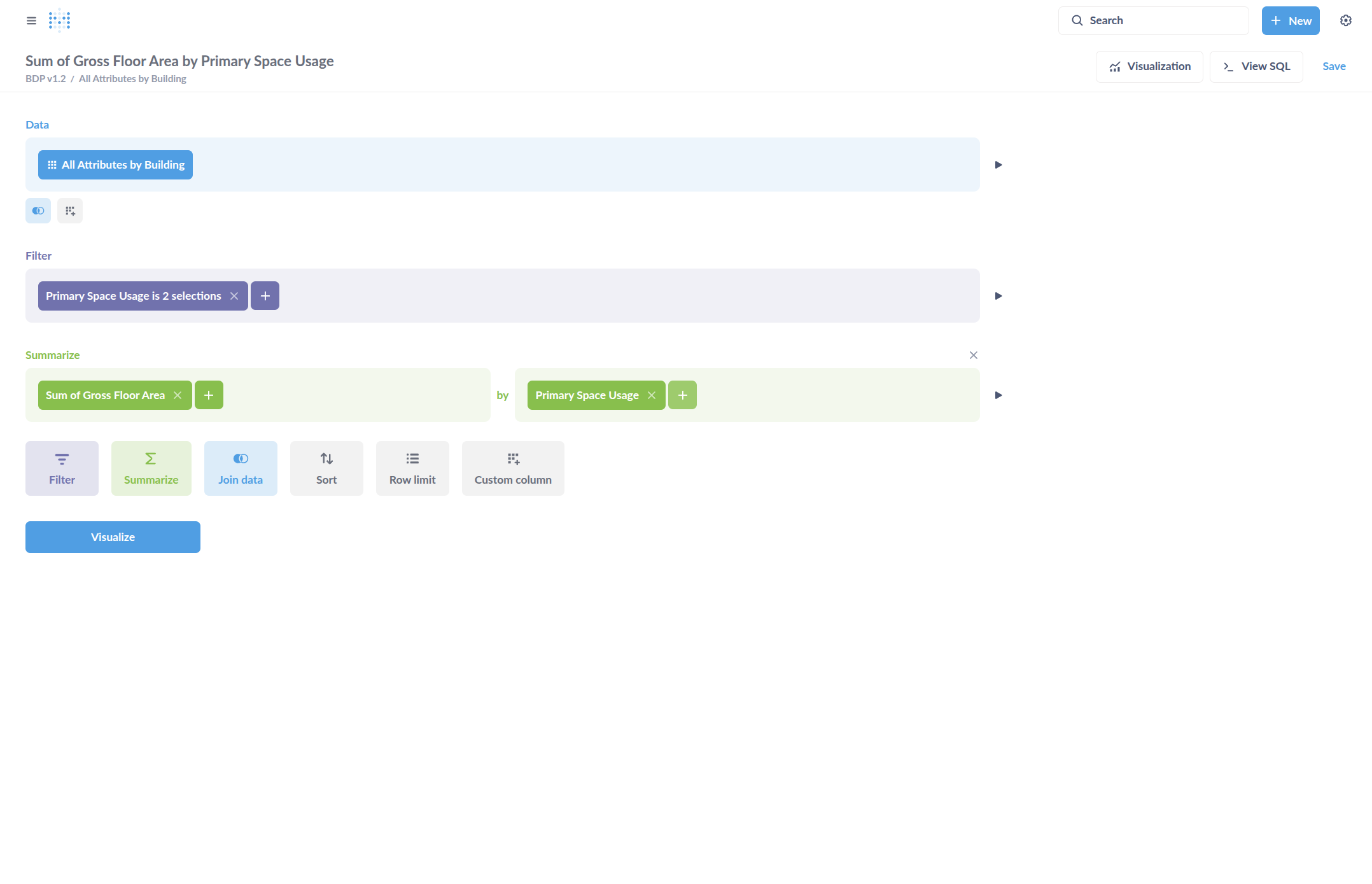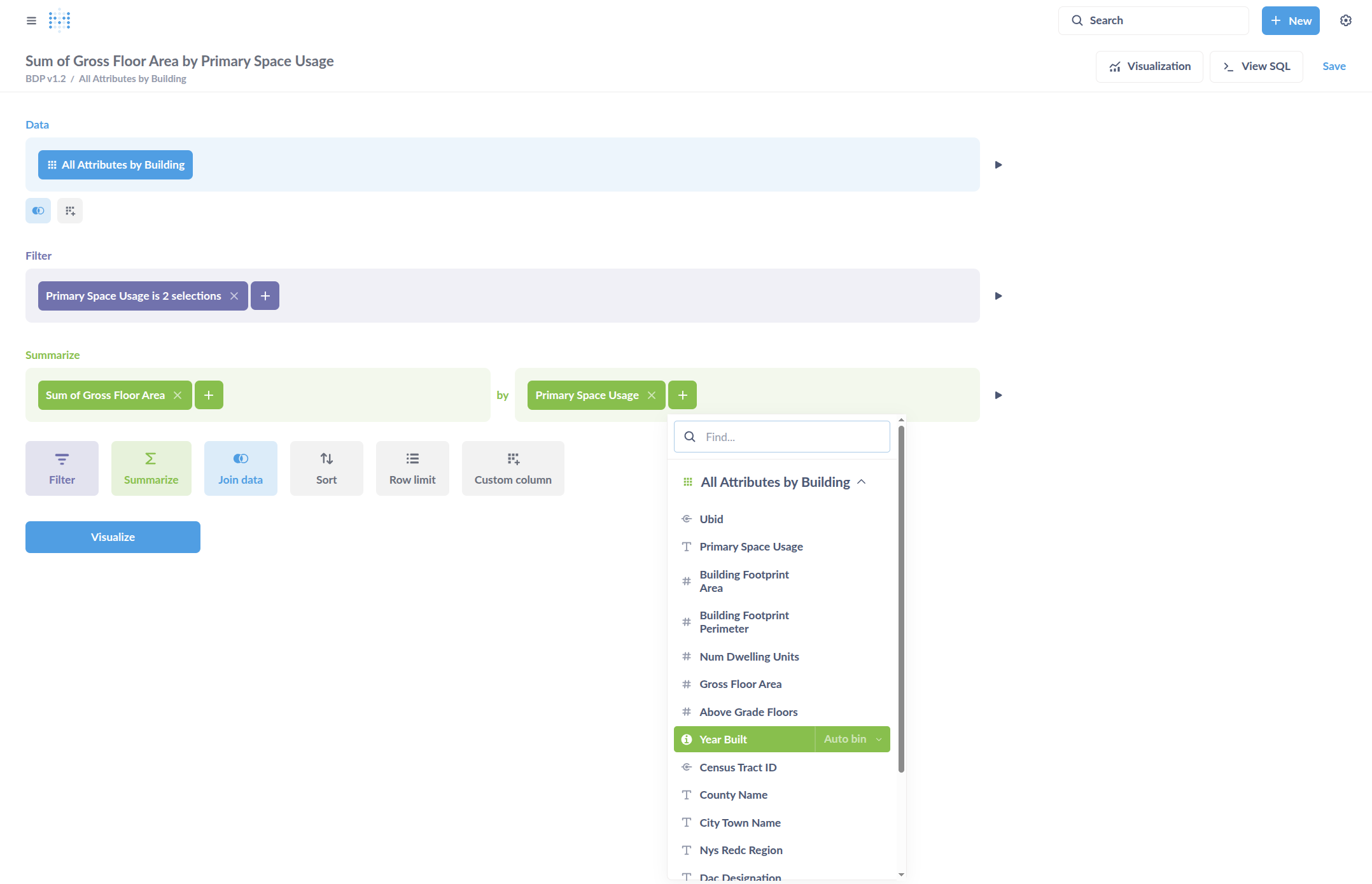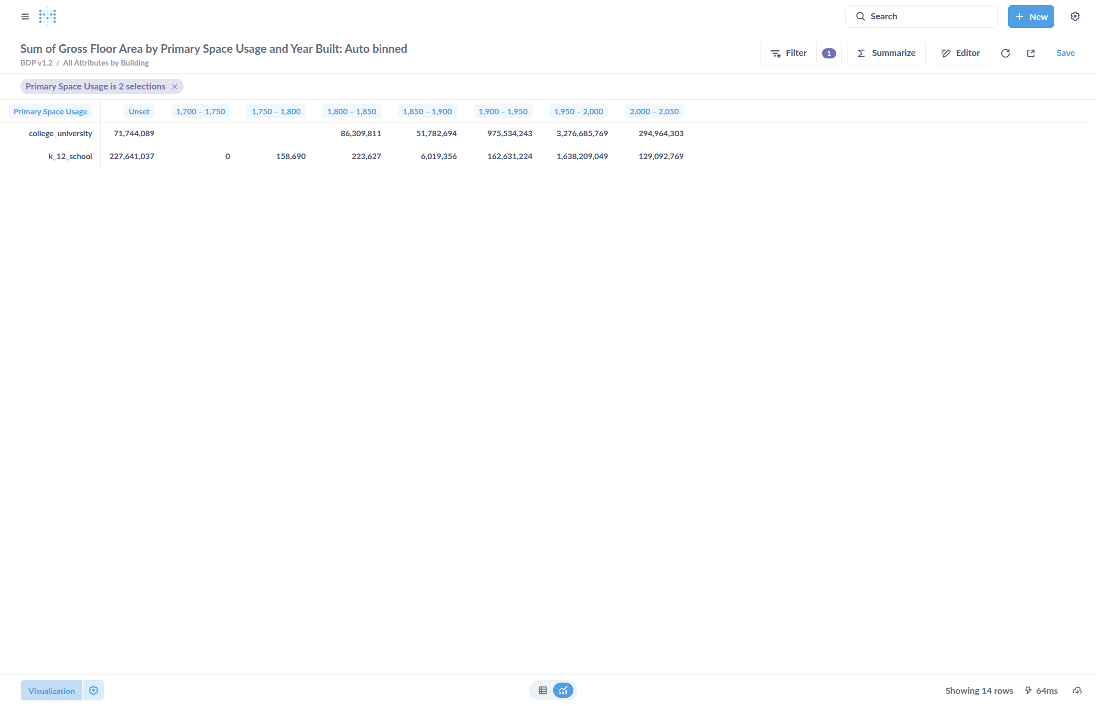 Learn how to create a visual chart to display data summaries, including filtering, grouping, color coding, and customizing your chart for educational buildings by gross floor area and year built.