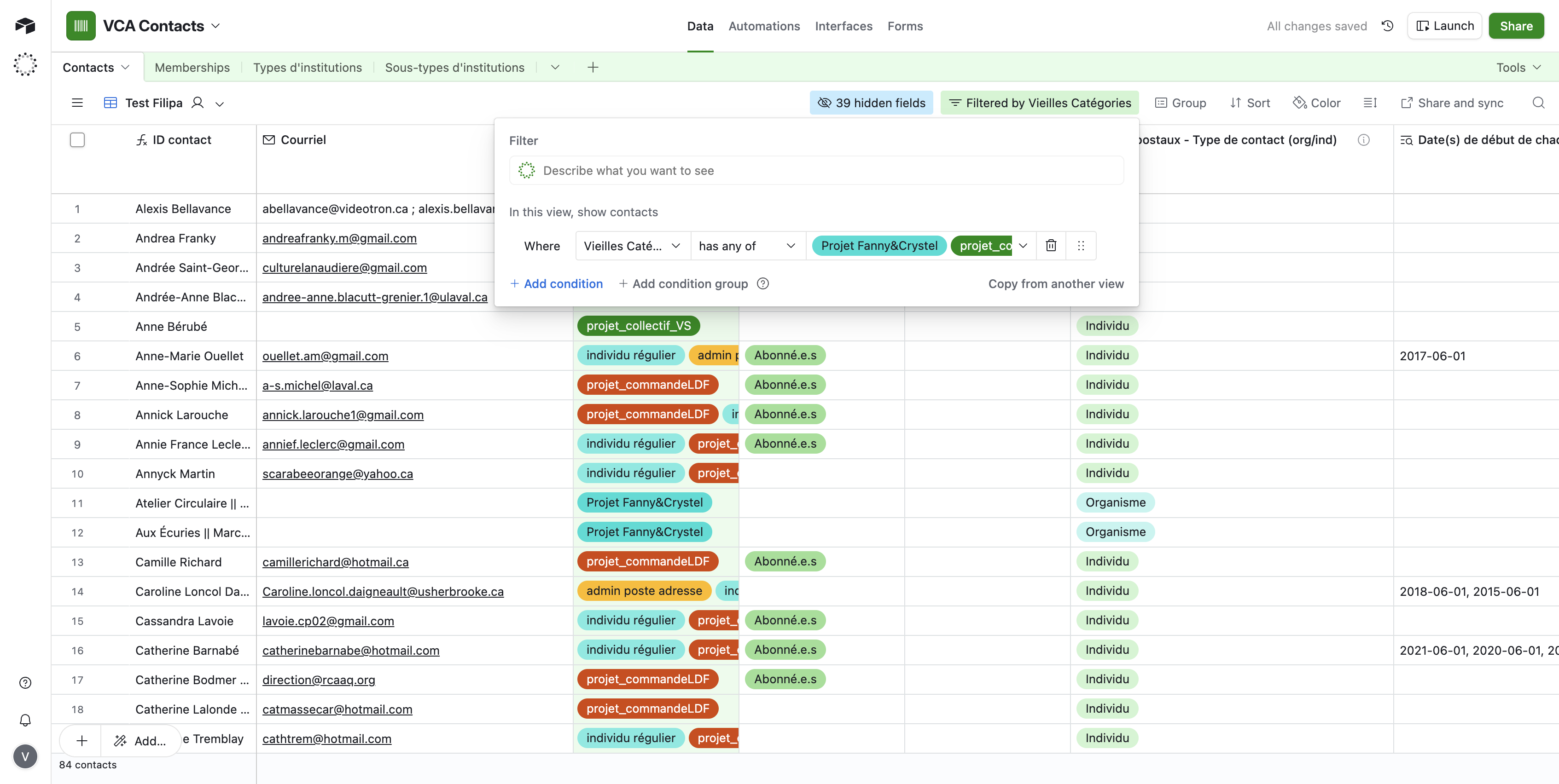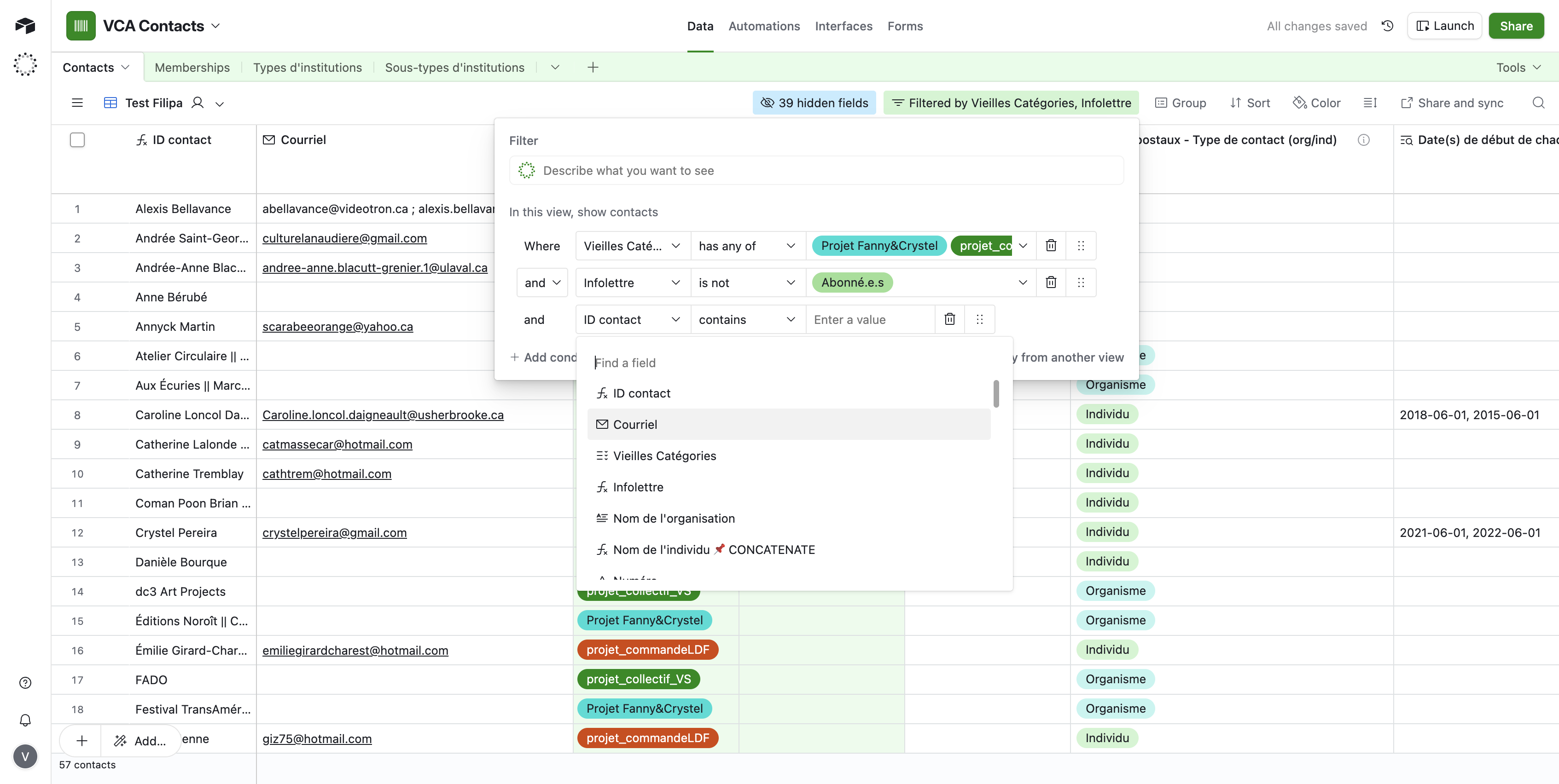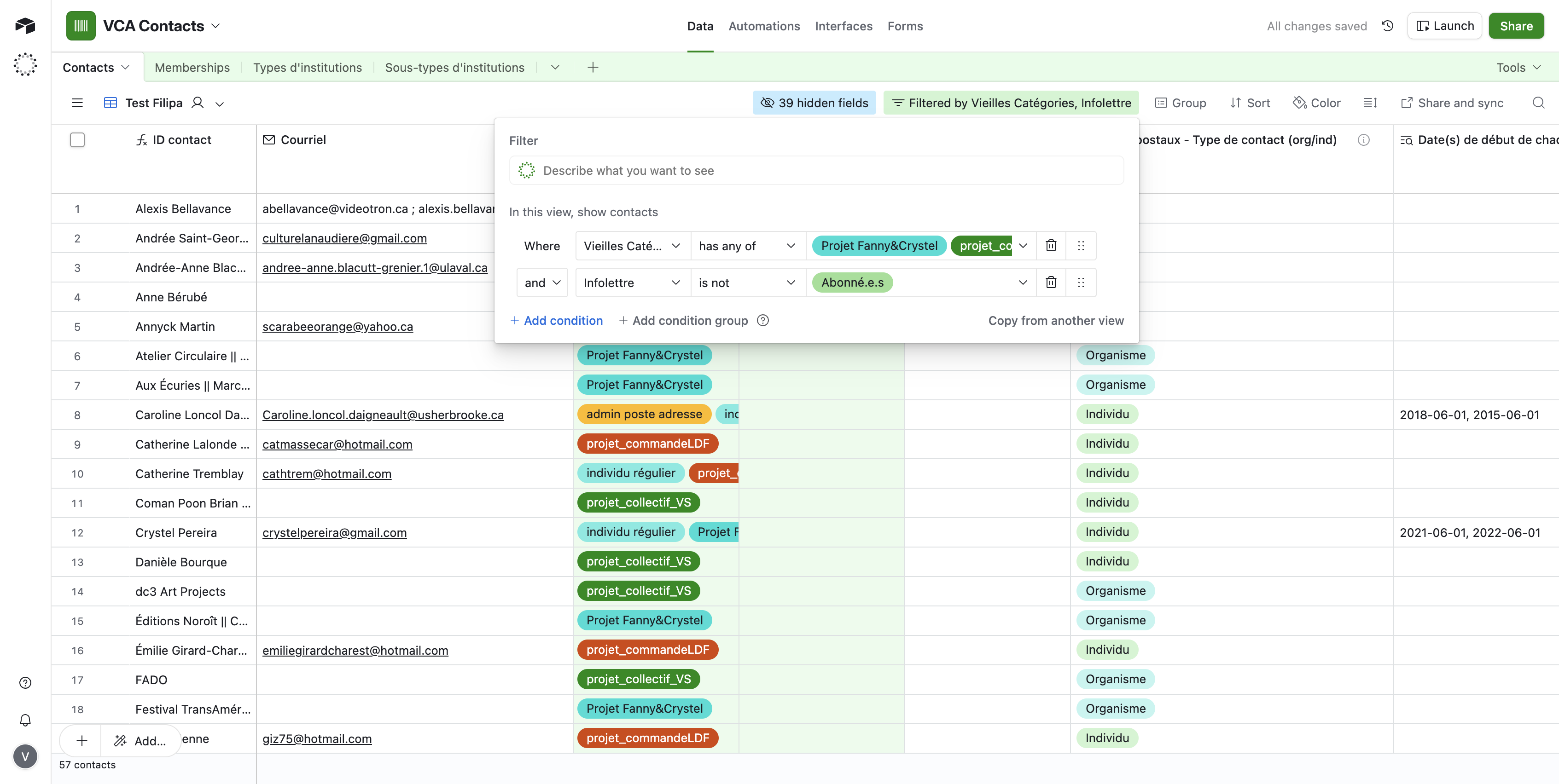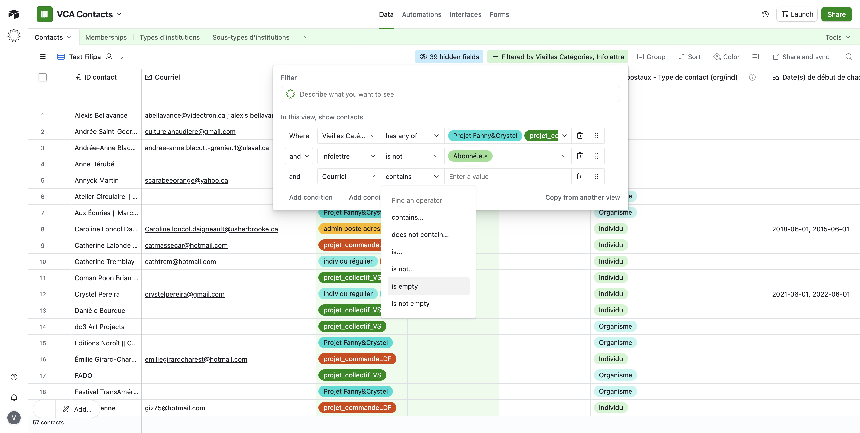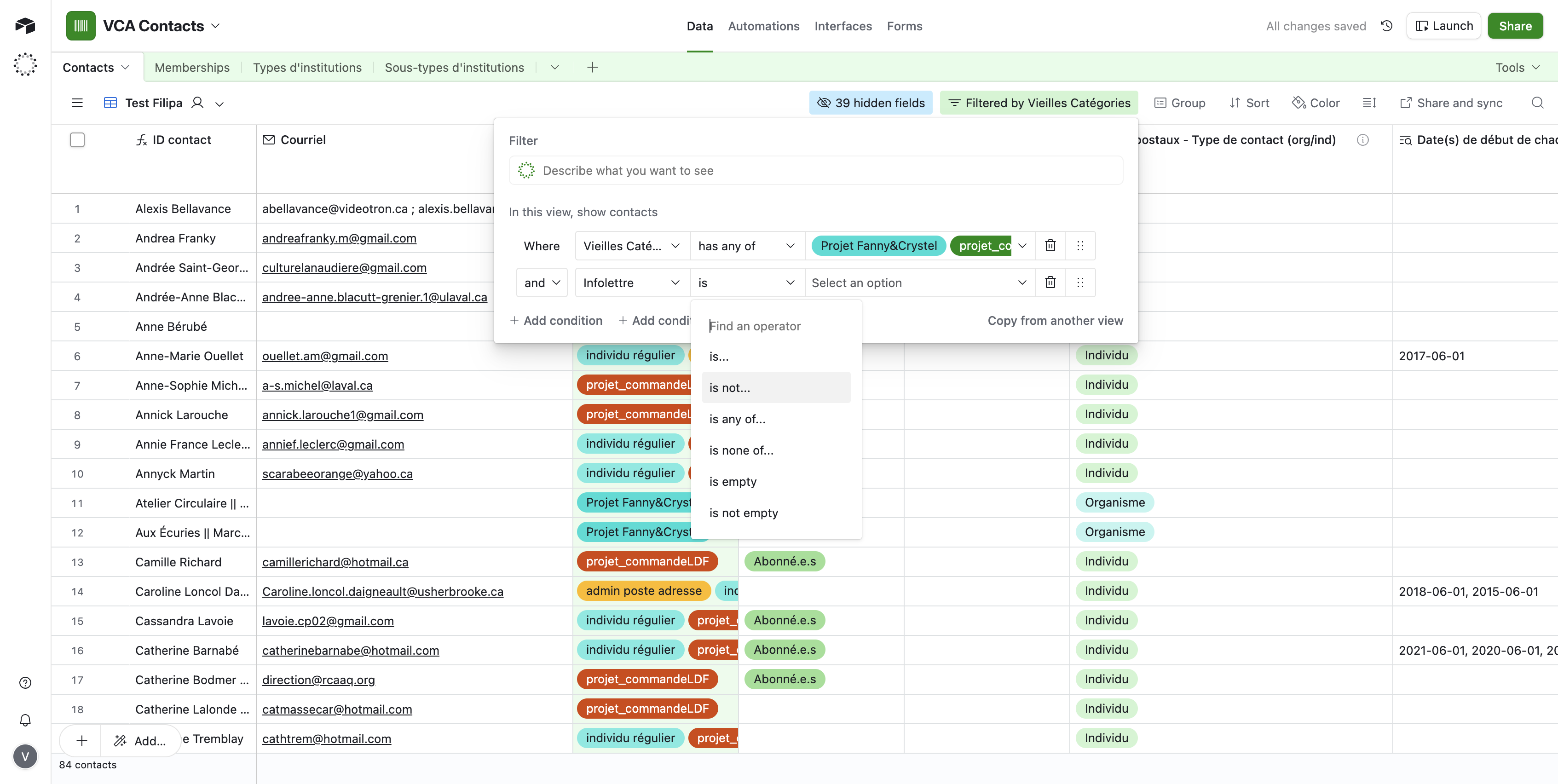 Pour affiner votre sélection, vous pouvez cumuler les conditions. Par exemple, pour isoler les personnes non abonnées à l'infolettre et ne possédant pas d'adresse courriel :