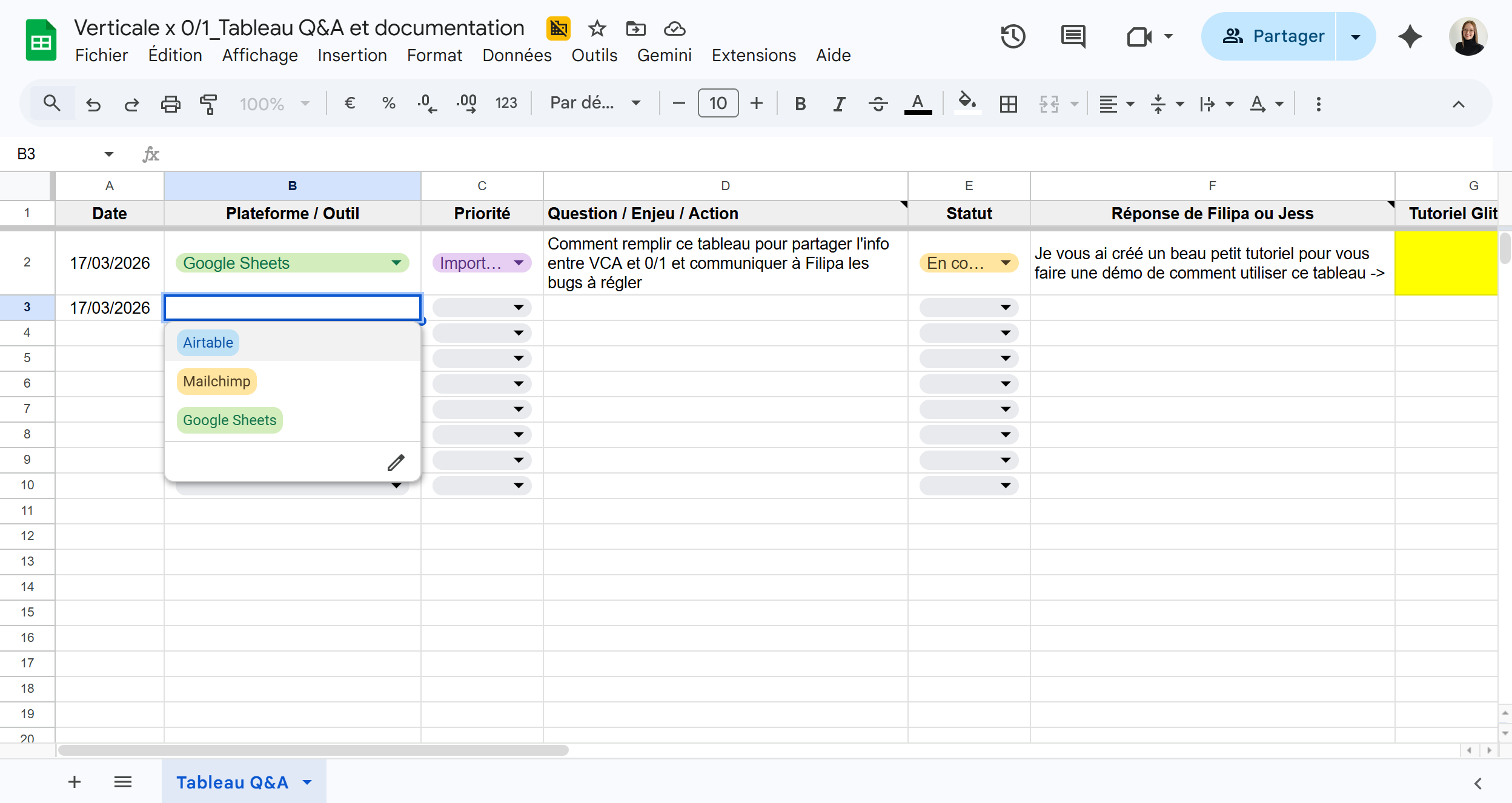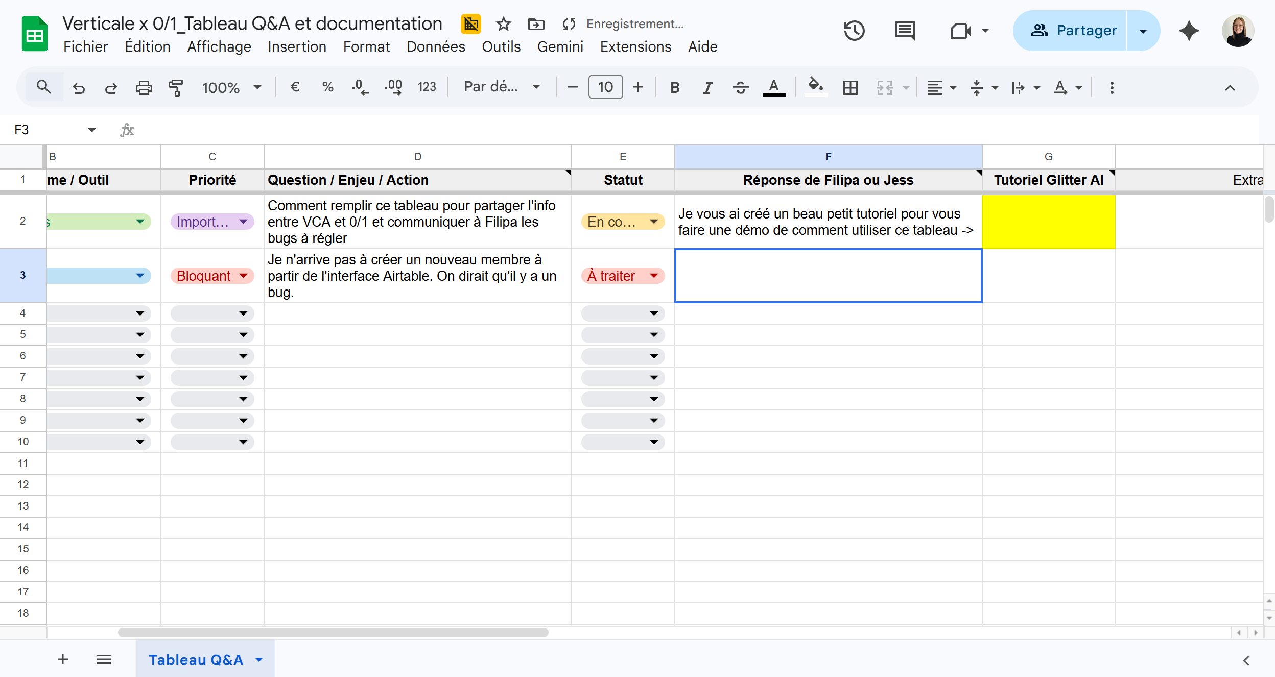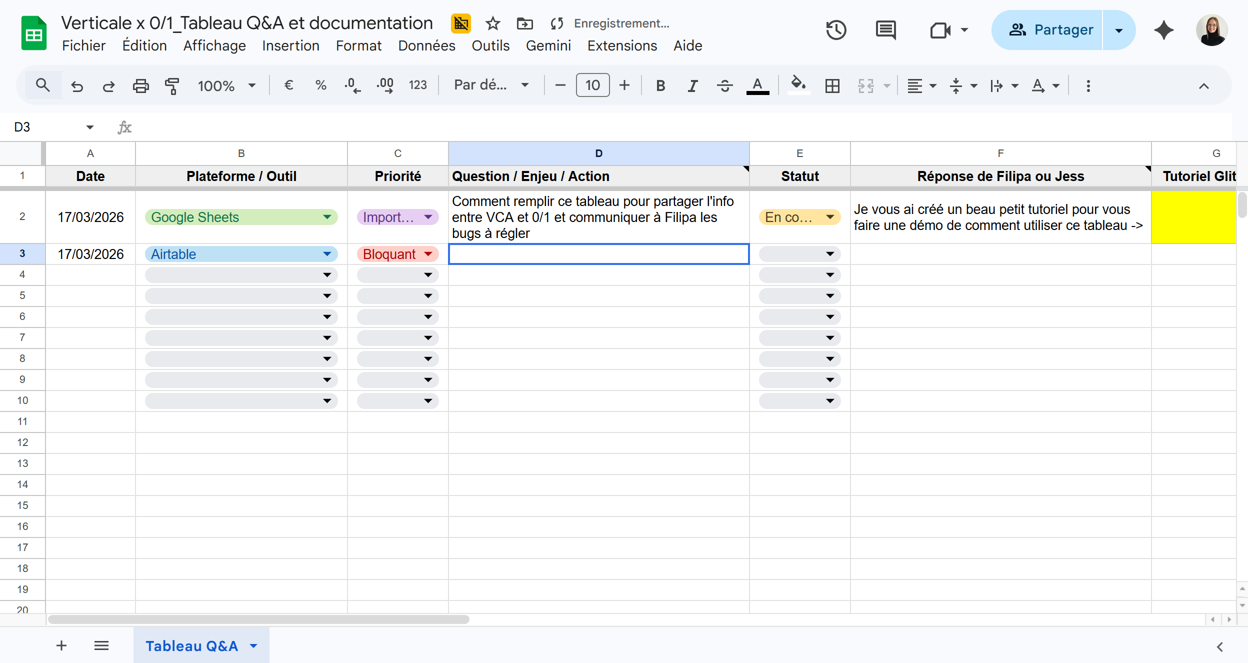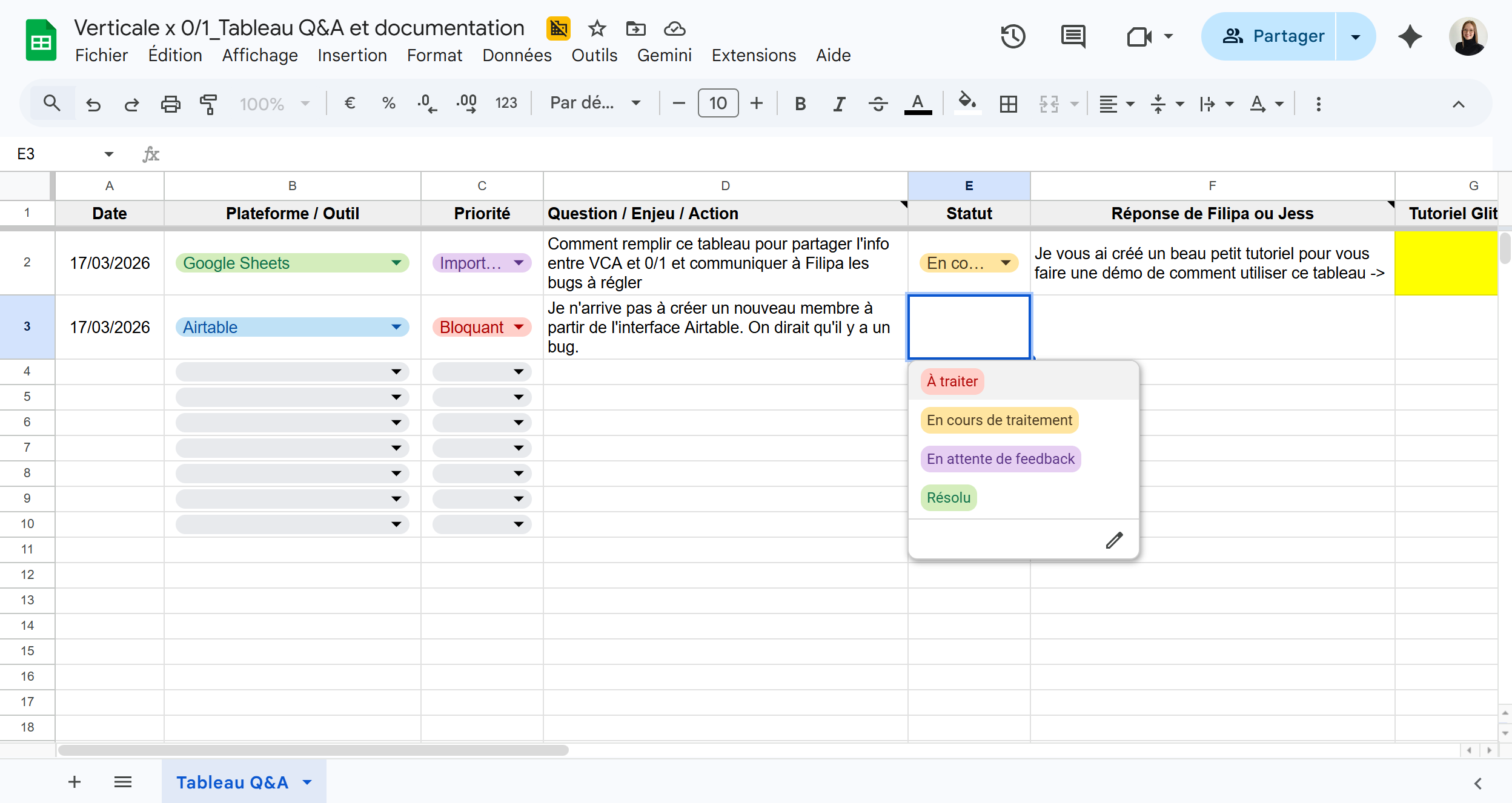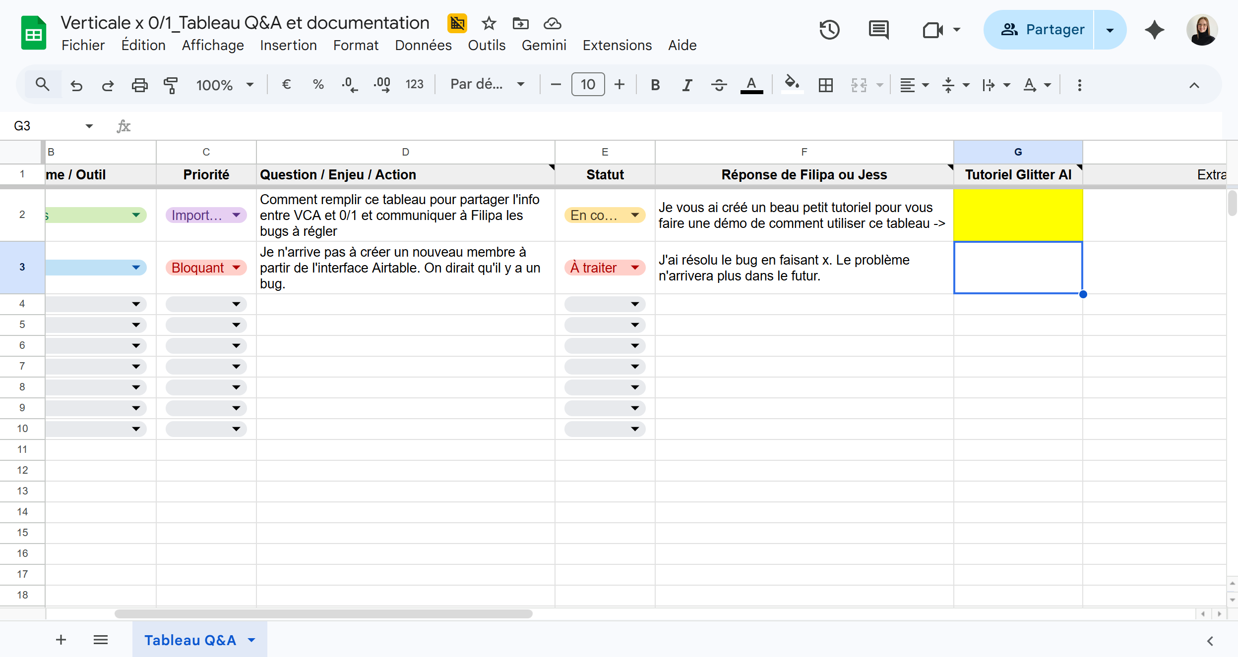 Tutoriel : Comment utiliser le "Tableau Q&A et documentation" pour le suivi de projet entre Verticale et 0/1