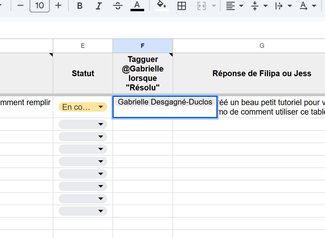 Filipa choisira le statut "En cours de traitement" pour vous indiquer lorsqu'elle est en train de résoudre l'enjeu, et "Résolu" une fois que ce sera réglé. Si elle attend plus d'infos ou du feedback de votre part, elle choisira le statut correspondant.