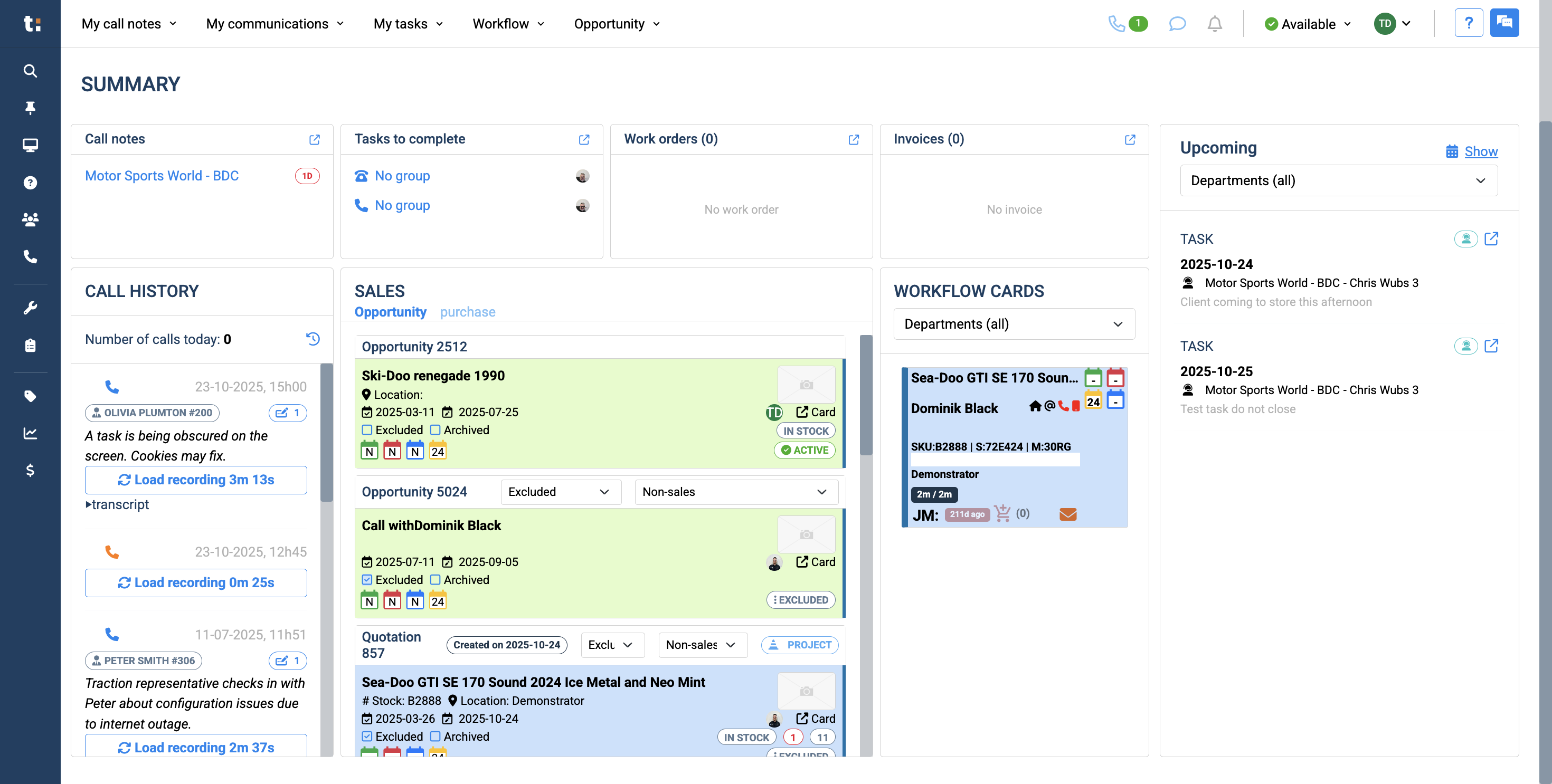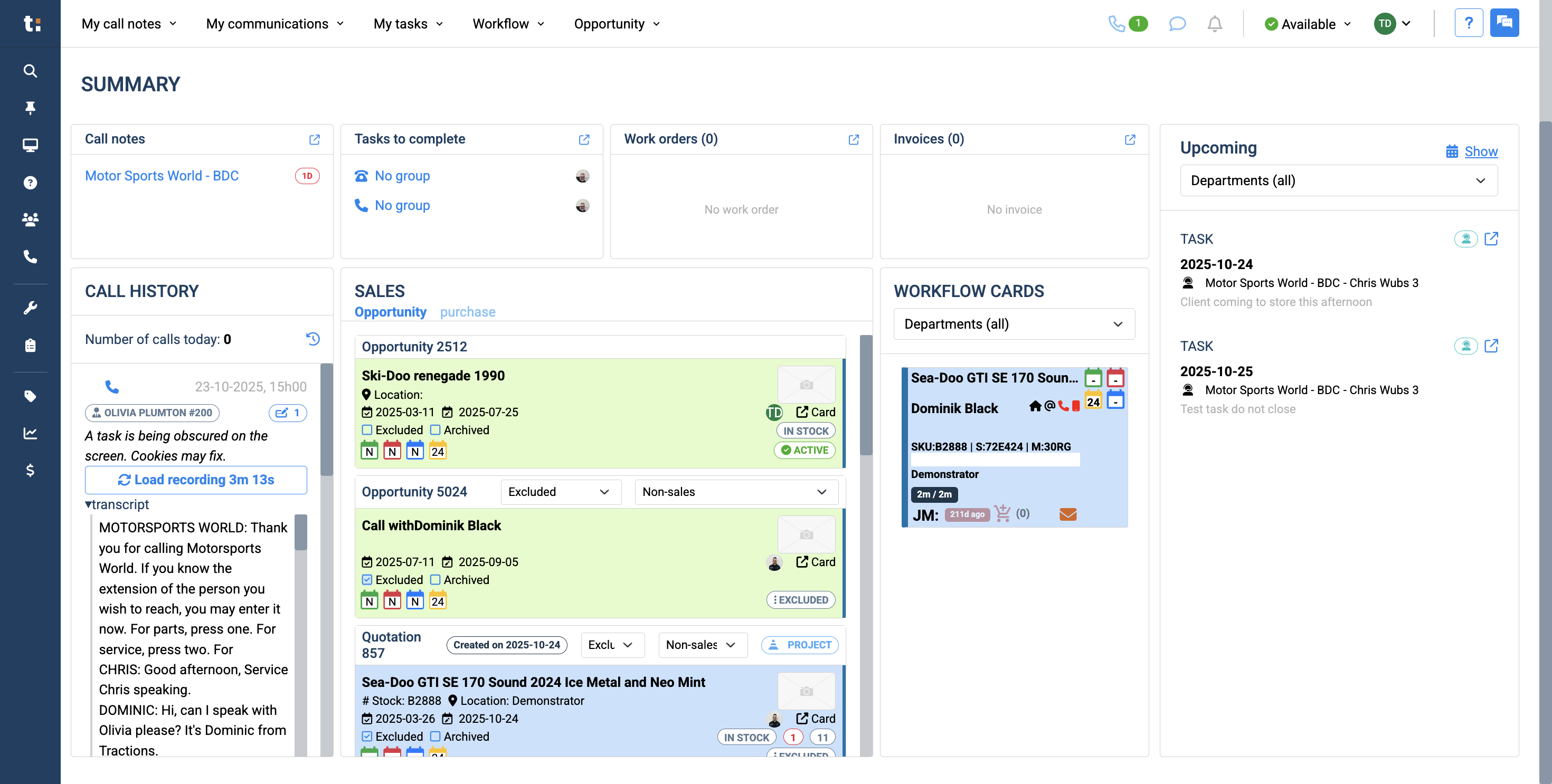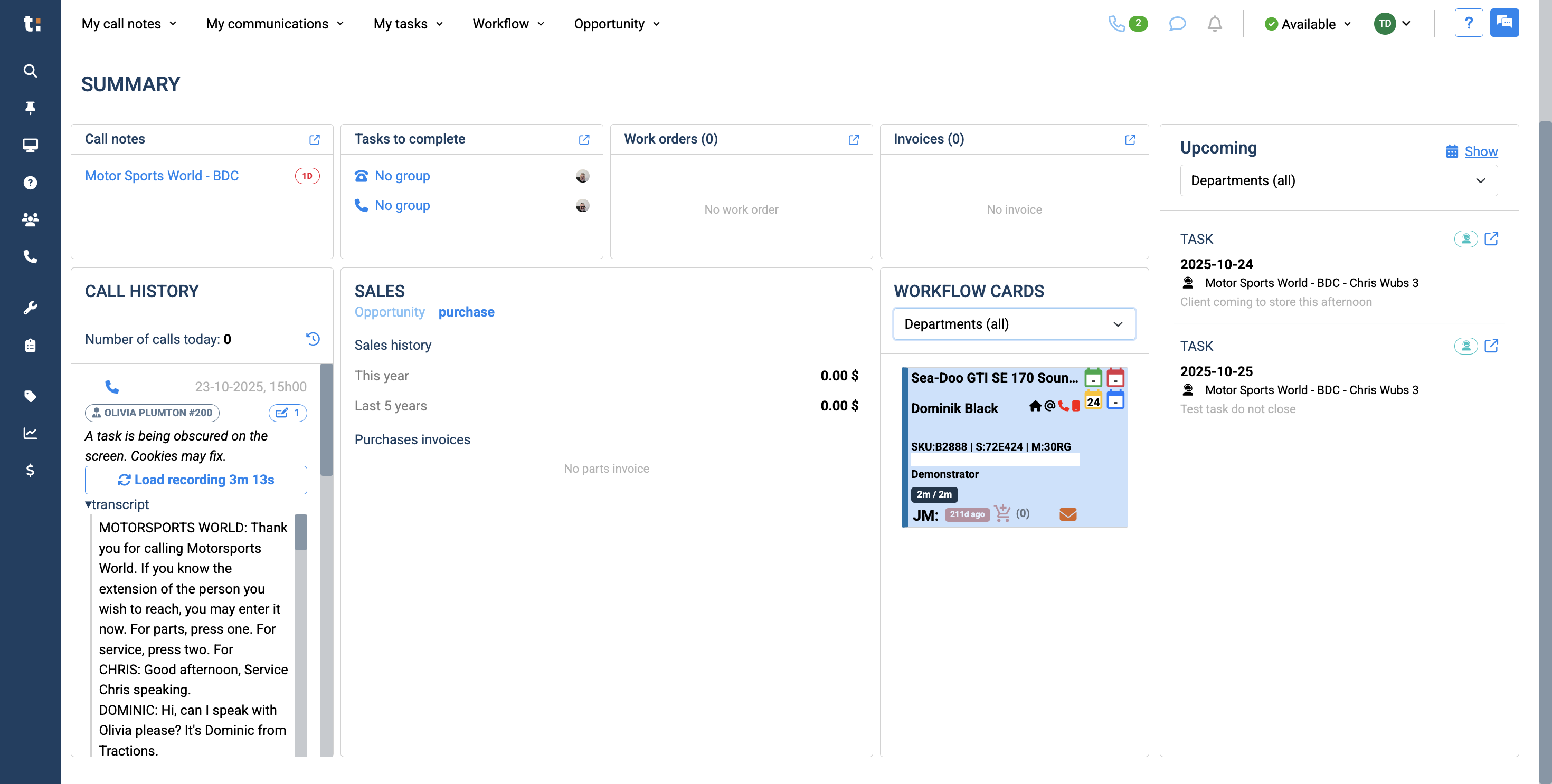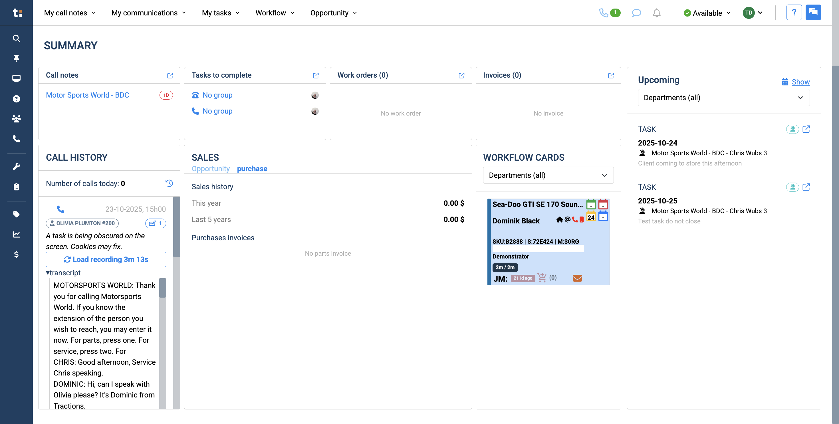 In this guide, we'll learn how to use the summary tab within a customer profile at your dealership. The summary tab provides a quick view of client information, call notes, tasks, work orders, parts invoices, call history, sales opportunities, purchase history, workflow cards, and upcoming tasks.