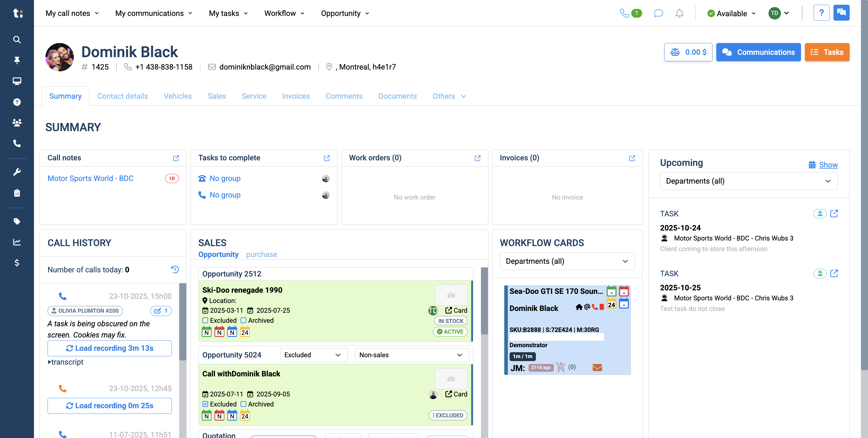 In this tab, you see a general overview of the client’s information and their history with your dealership.