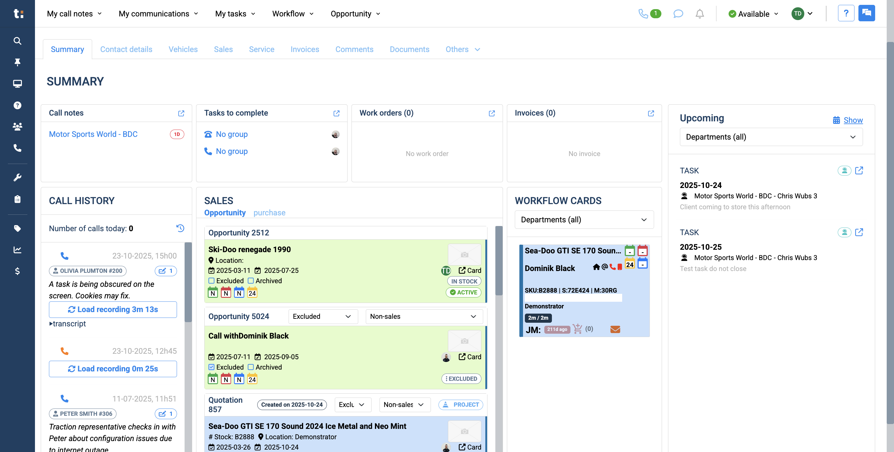 Learn how to use the Summary tab in the customer profile to view client information, call notes, work orders, sales opportunities, invoices, and upcoming tasks for your dealership customers.