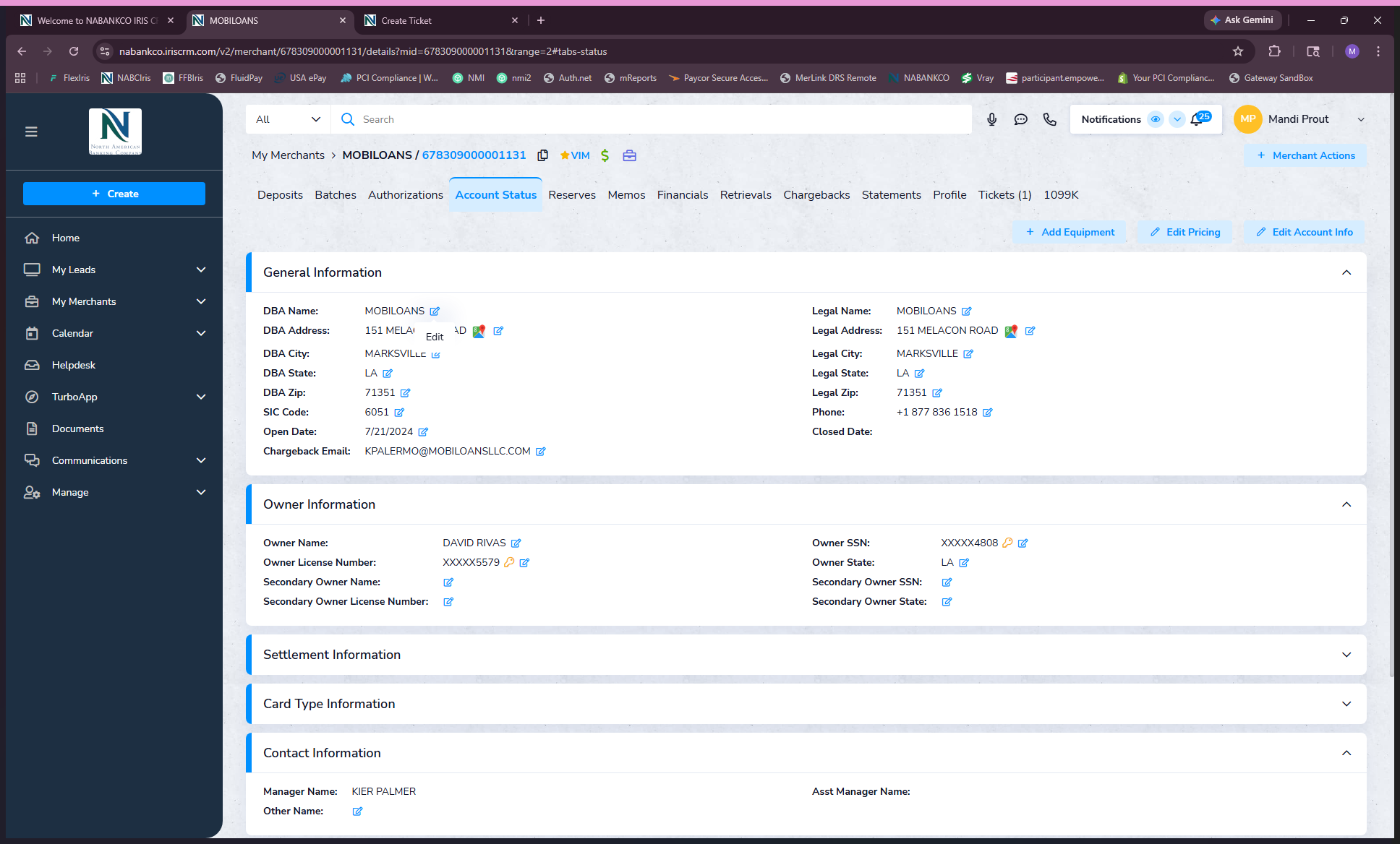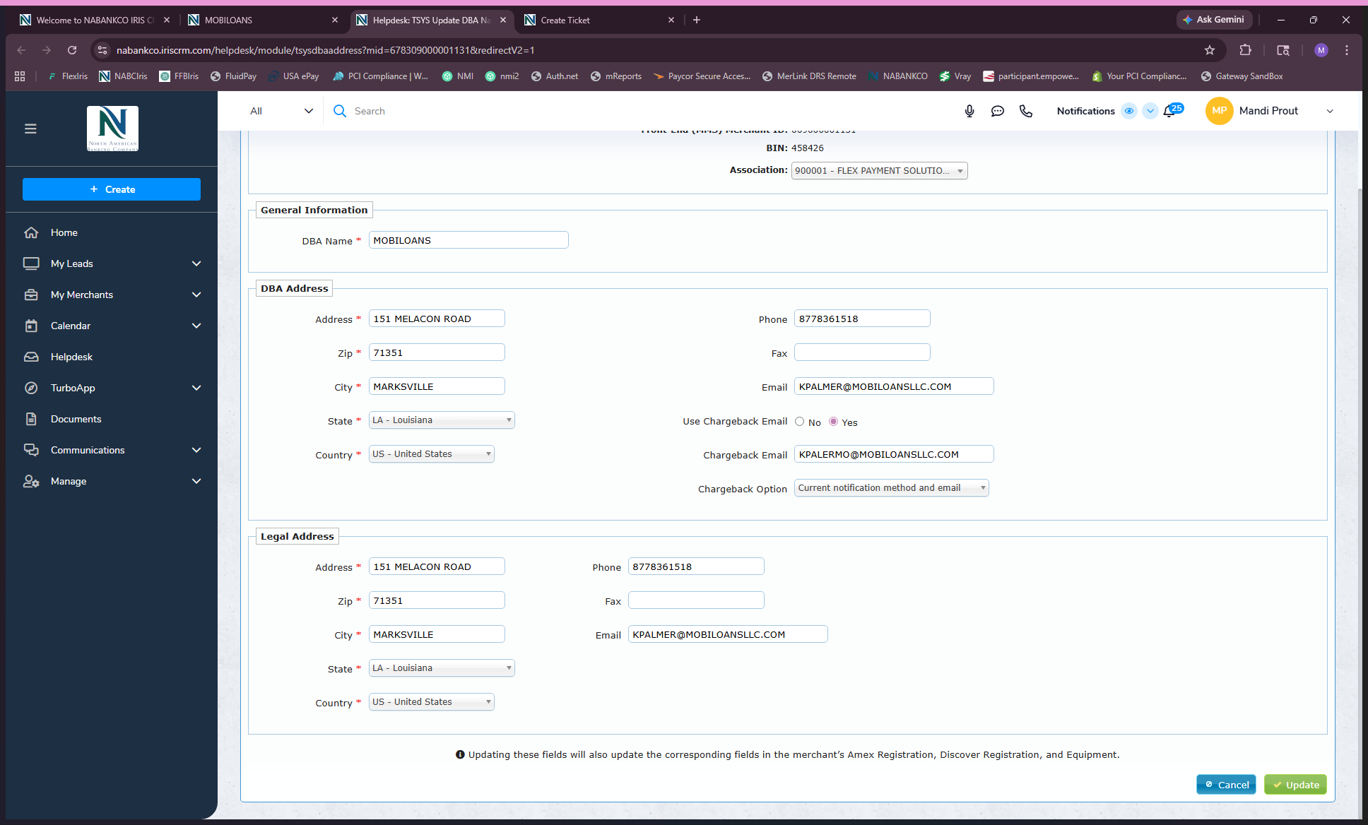 Learn how to update merchant details like DBA address, legal address, phone numbers, and email addresses in the NABC Iris CRM.